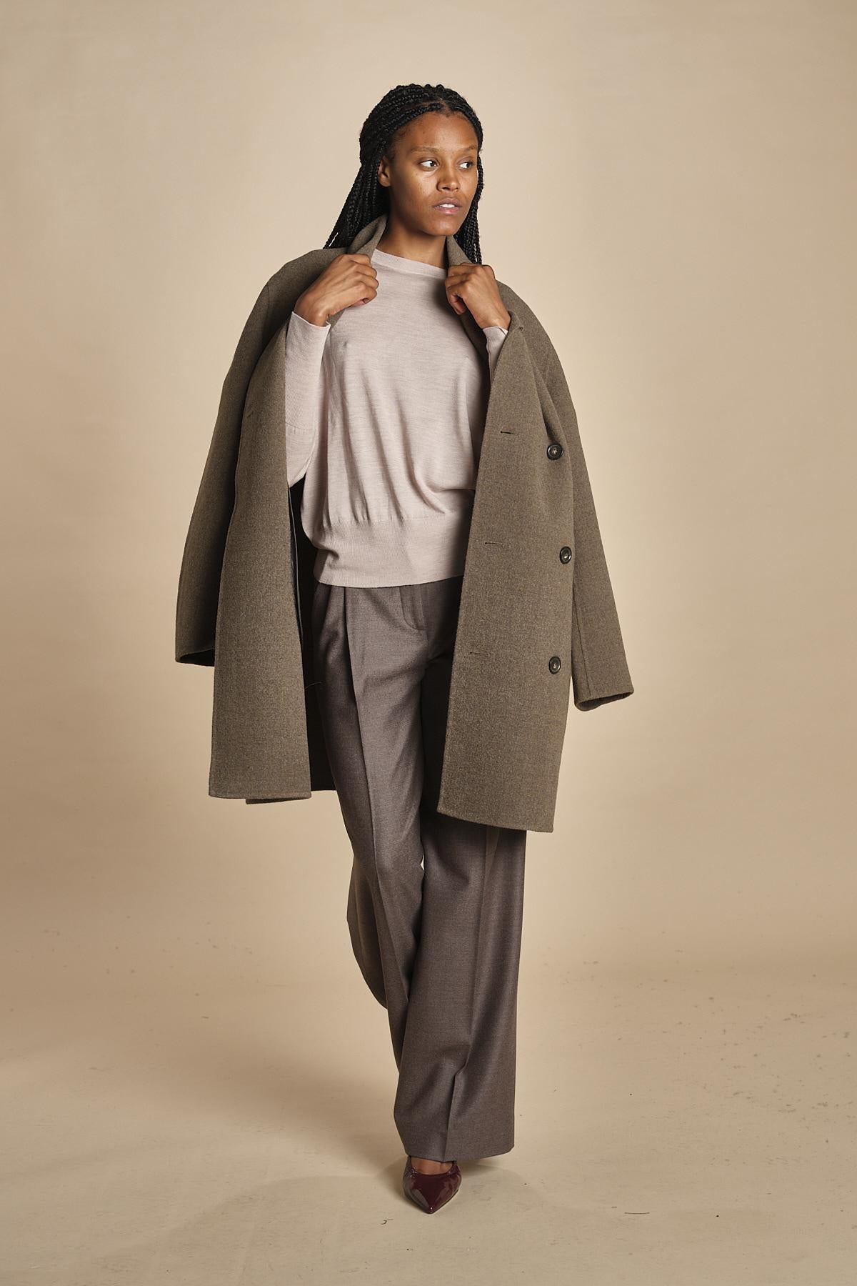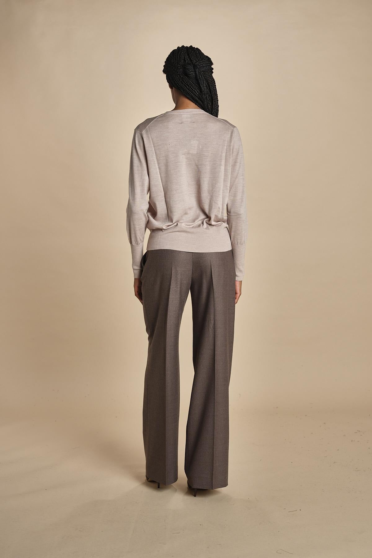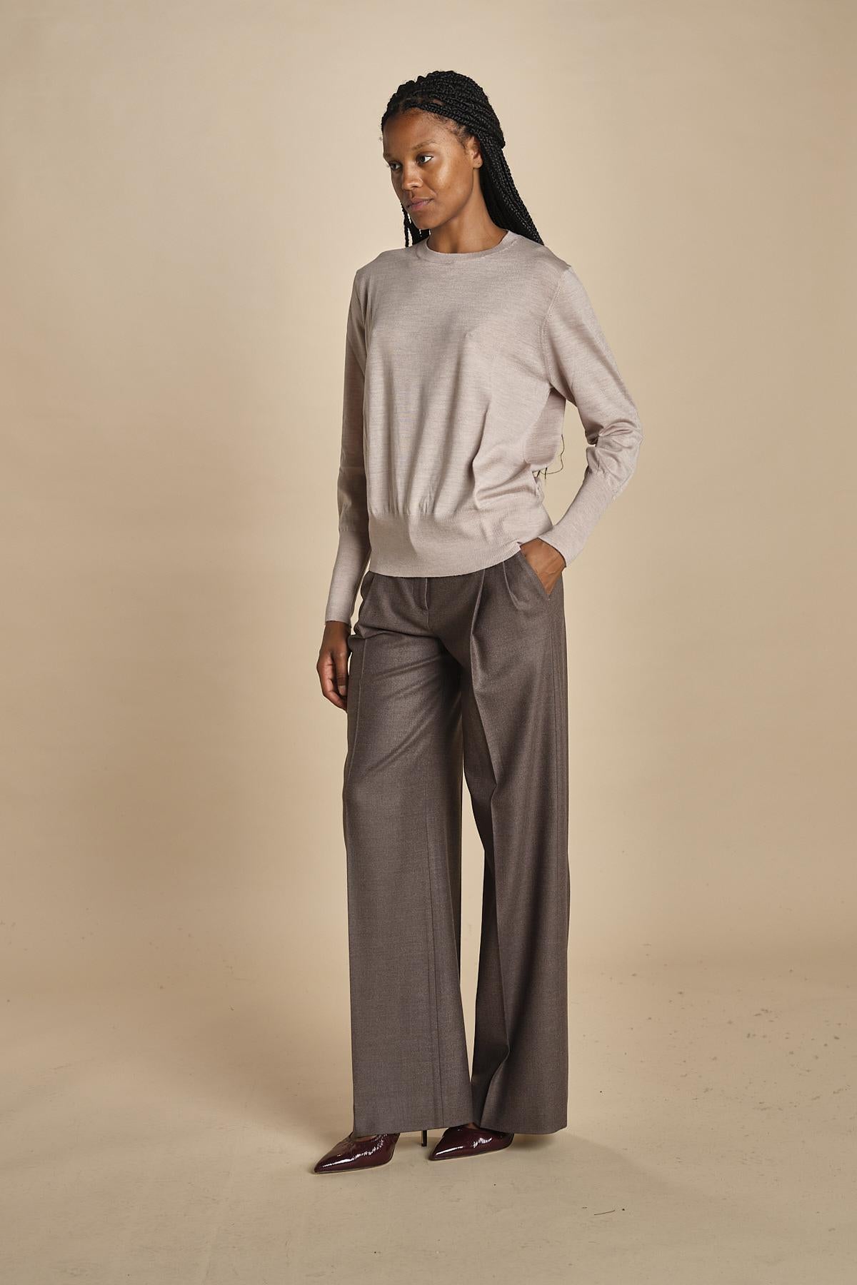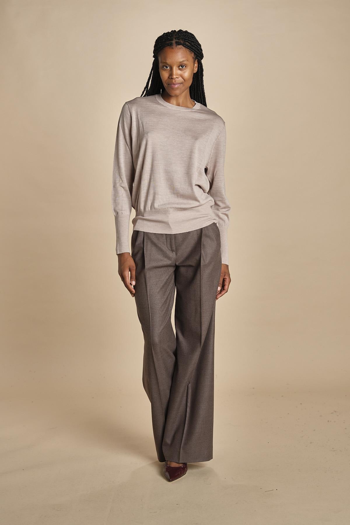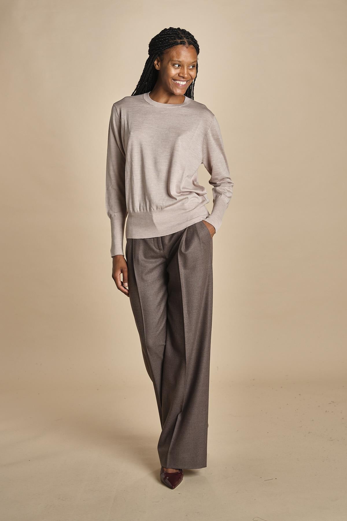 girocollo over in merino. La modella è alta 174 cm e indossa una taglia S. Composizione: 100% lana merino
