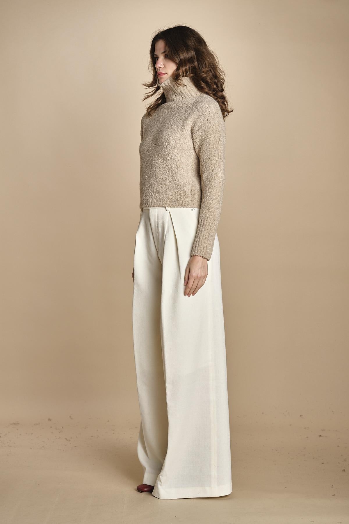 dolcevita bouclé. La modella è alta 176 cm e indossa una taglia S. 88% alpaca superfine 12% fibra poliammidica