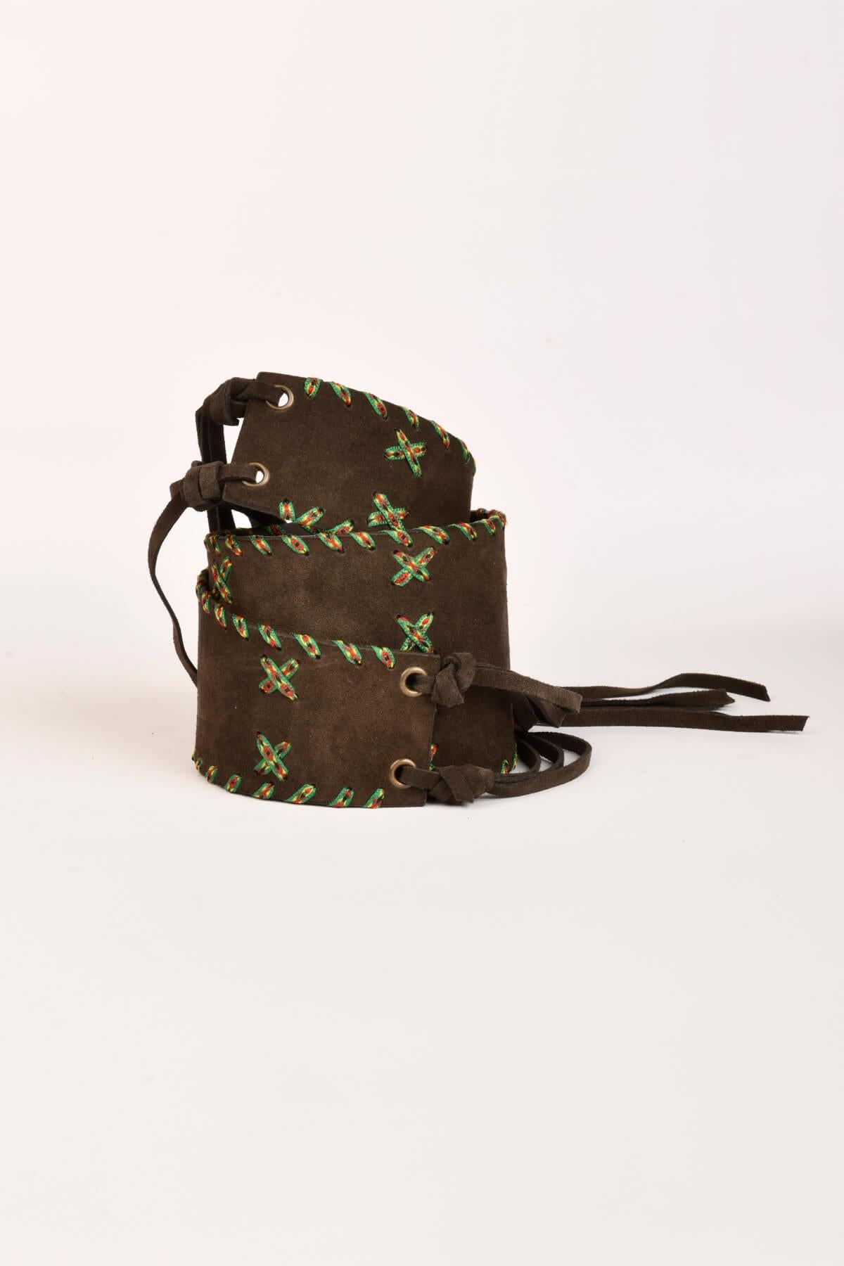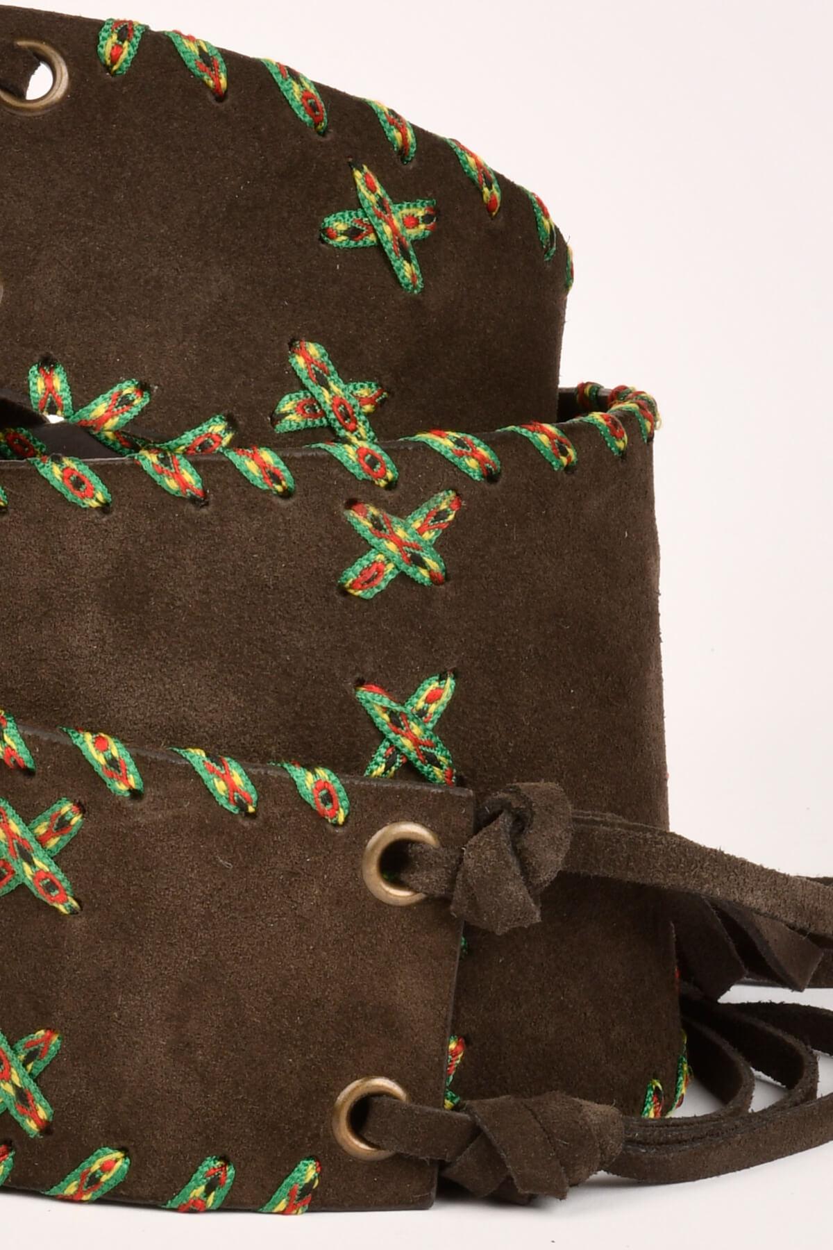 Cintura alta in camoscio di colore marrone di Milaura Belt. Co dettaglio frangie lunghe. Ricamo in 3D colorato Composizione: 100% pelle