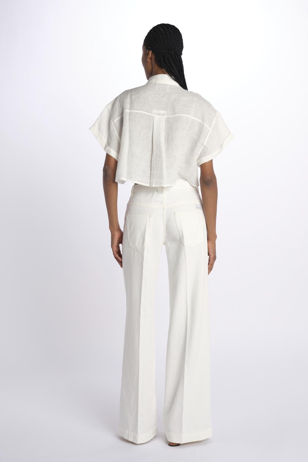 BONDI GIRAFFE camicia crop con giraffe ricamate by milaura. La modella è alta 174 cm e indossa una taglia XS. Composizione: 100% lino.