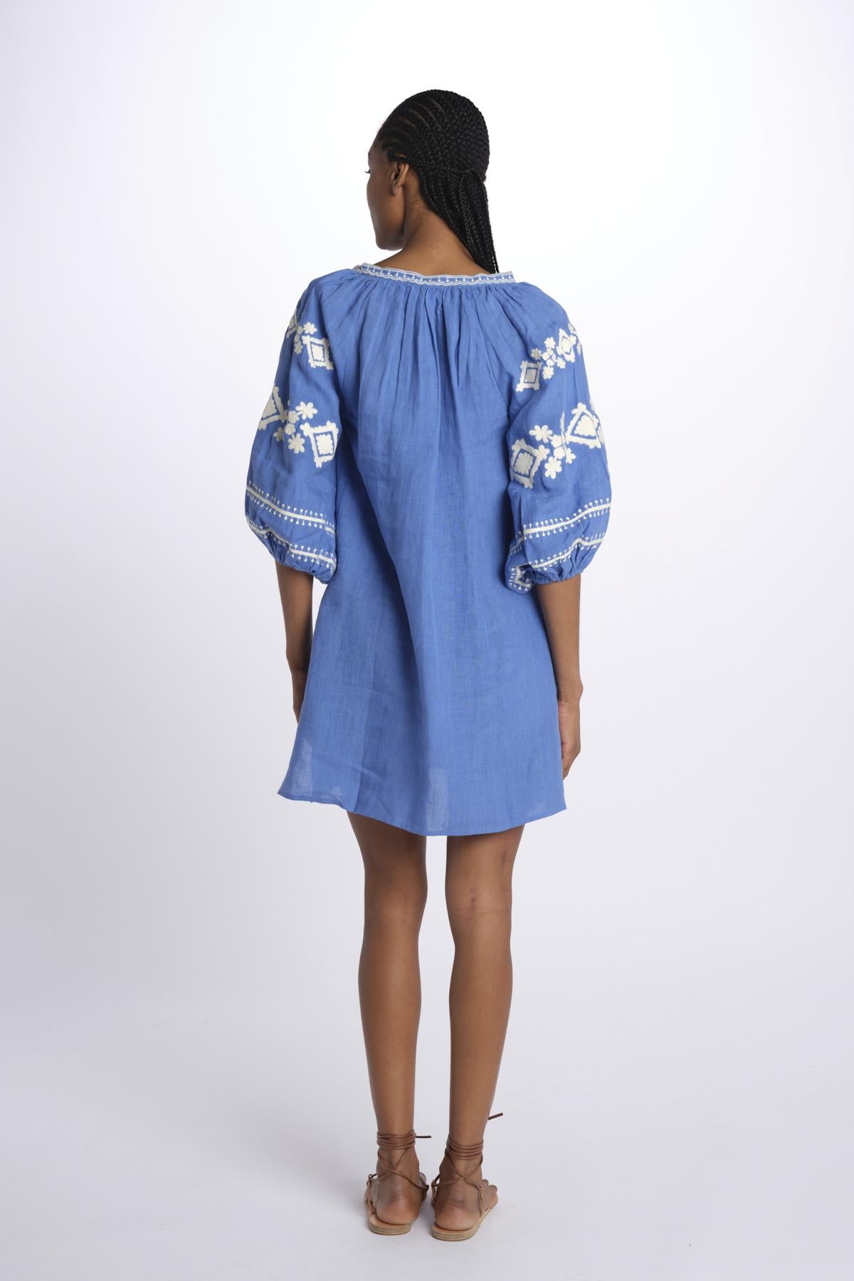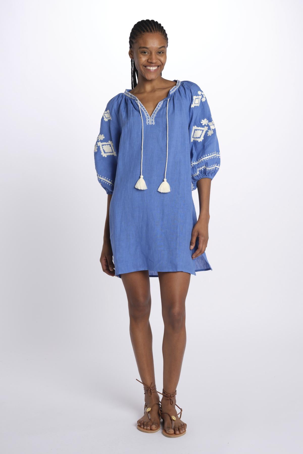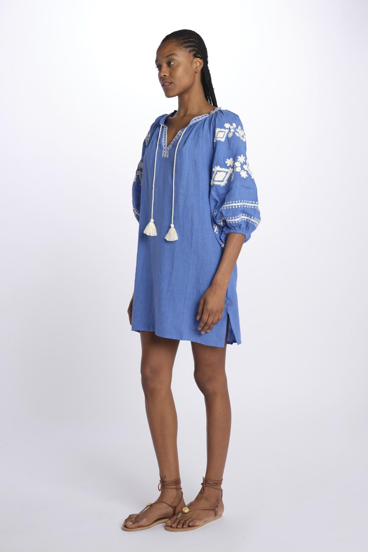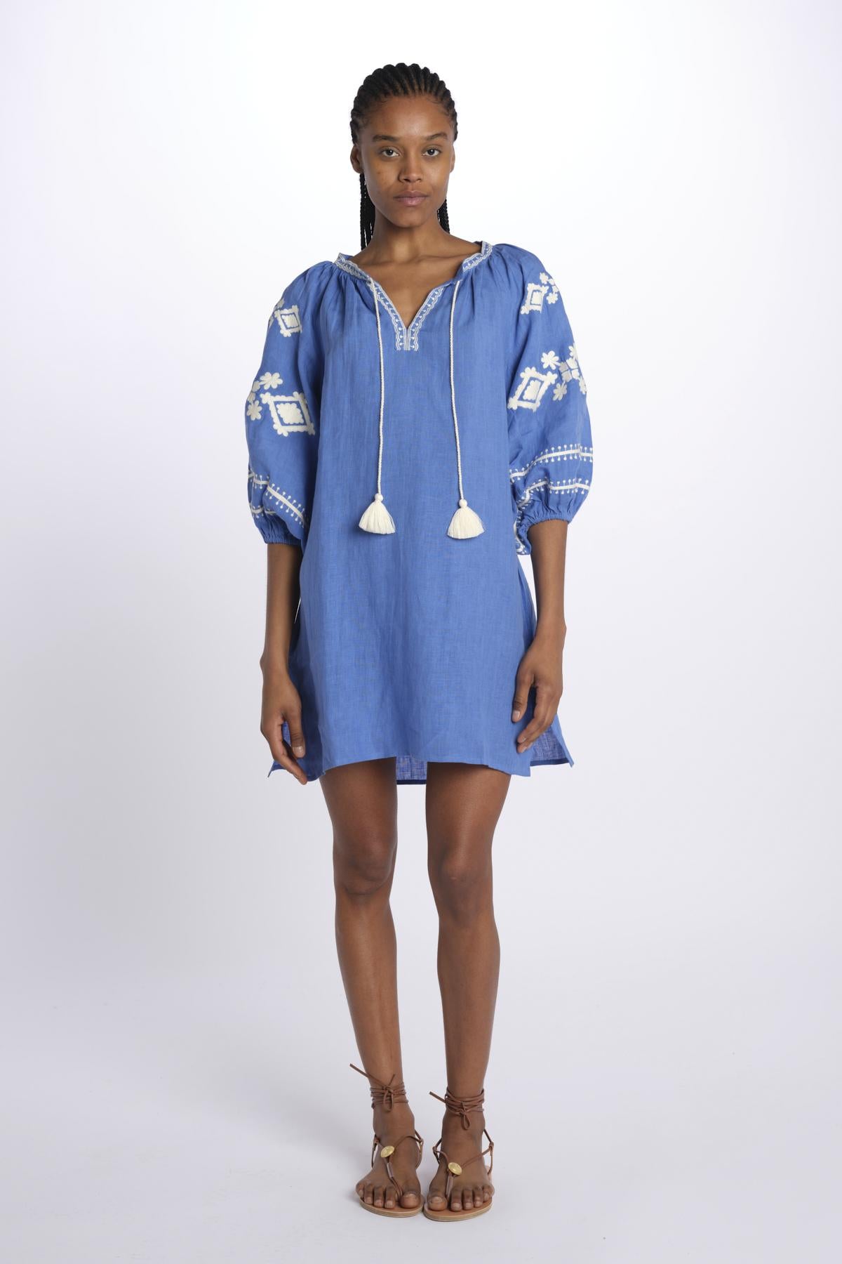 BYBLOS tunica greche applicate by milaura. La modella è alta 174 cm e indossa una taglia XS. Composizione: 100% lino.