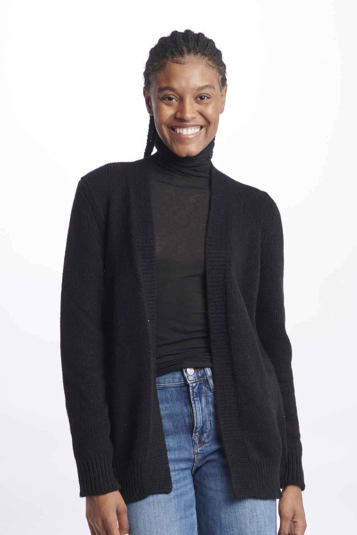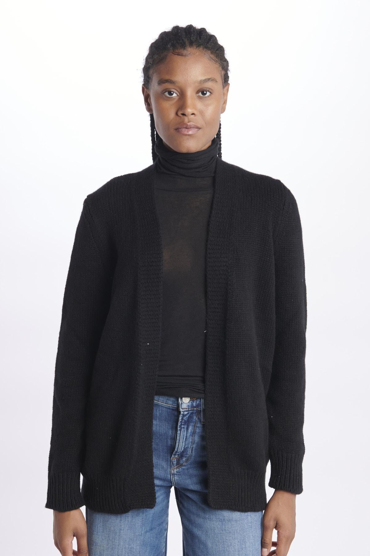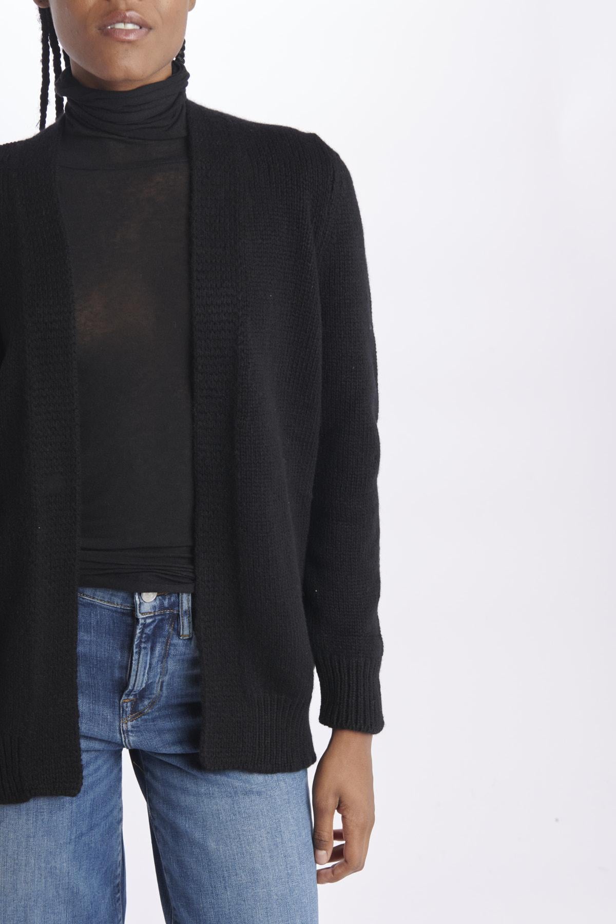 Cardigan by Milaura ovetto. La modella è alta 174 cm e indossa la taglia 36. Composizione: 100% Cashmere.