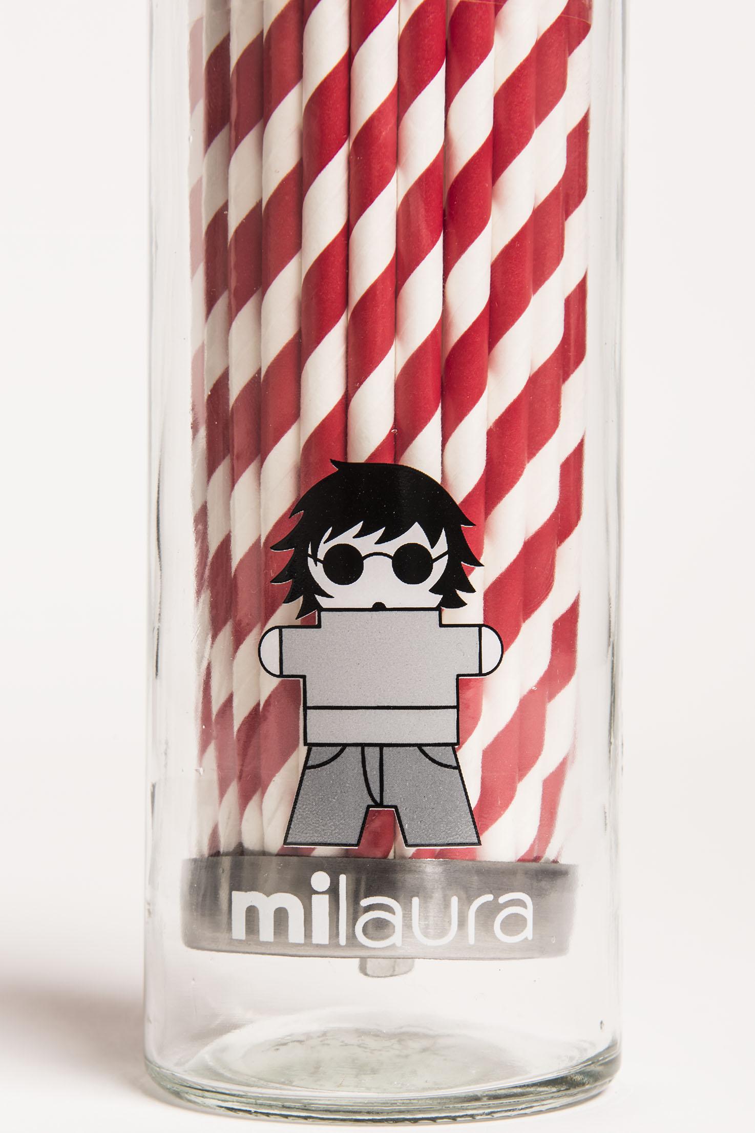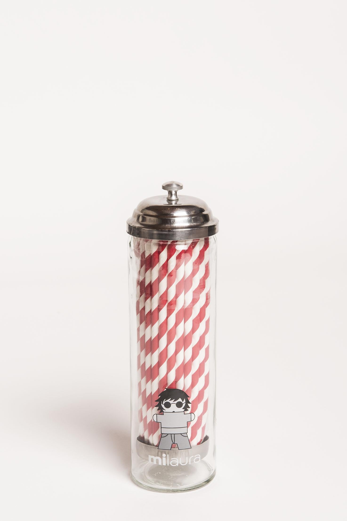 Dispenser di cannucce in vetro retro con tappo e logo Milaura.Il dispenser contiene le cannucce bicolori in plasticaMisure: 14 x 15 x 34 cm