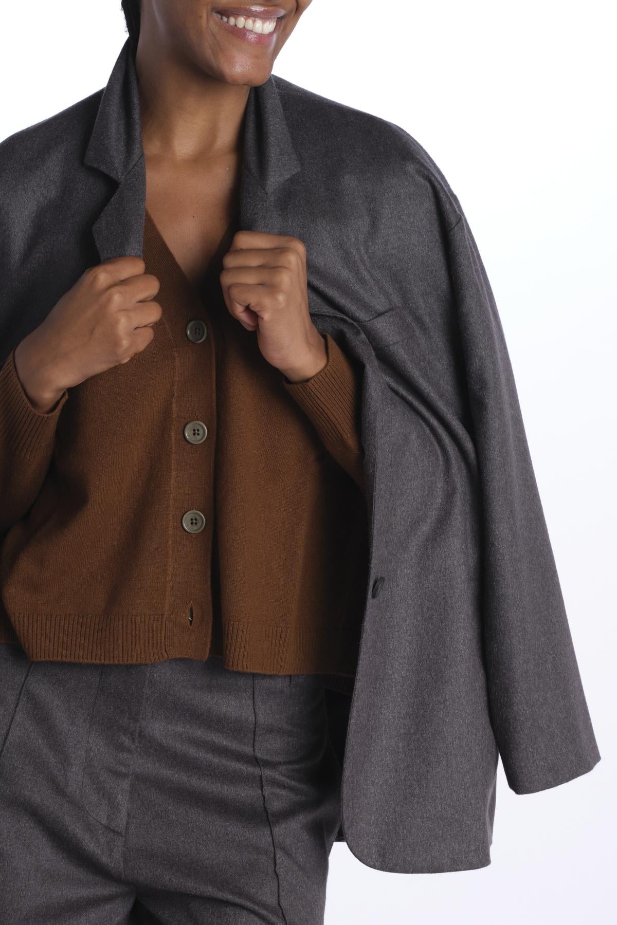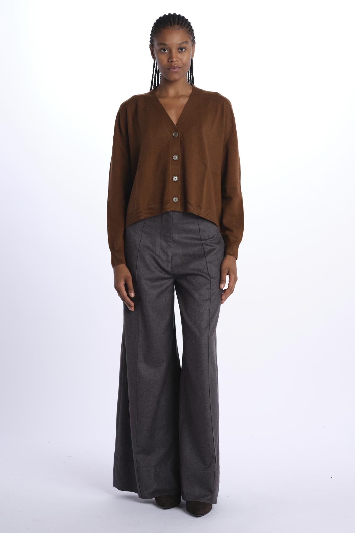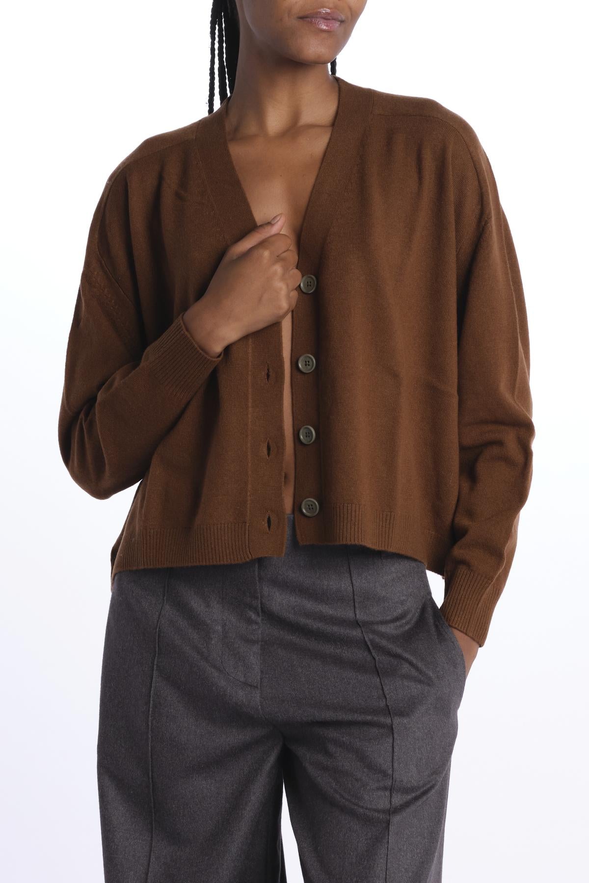 Cardigan over by milaura knit. La modella è alta 174 cm e indossa una taglia XS. Composizione: 100% cashmere.
