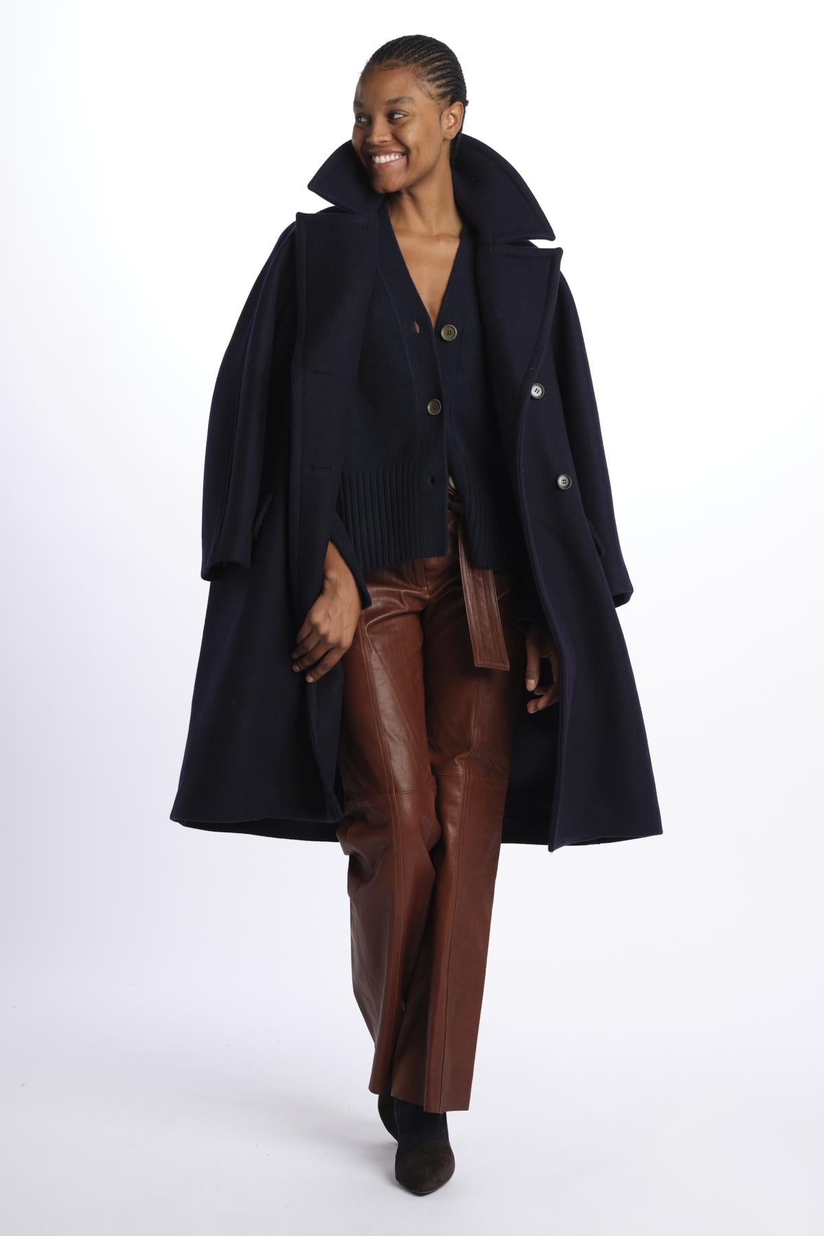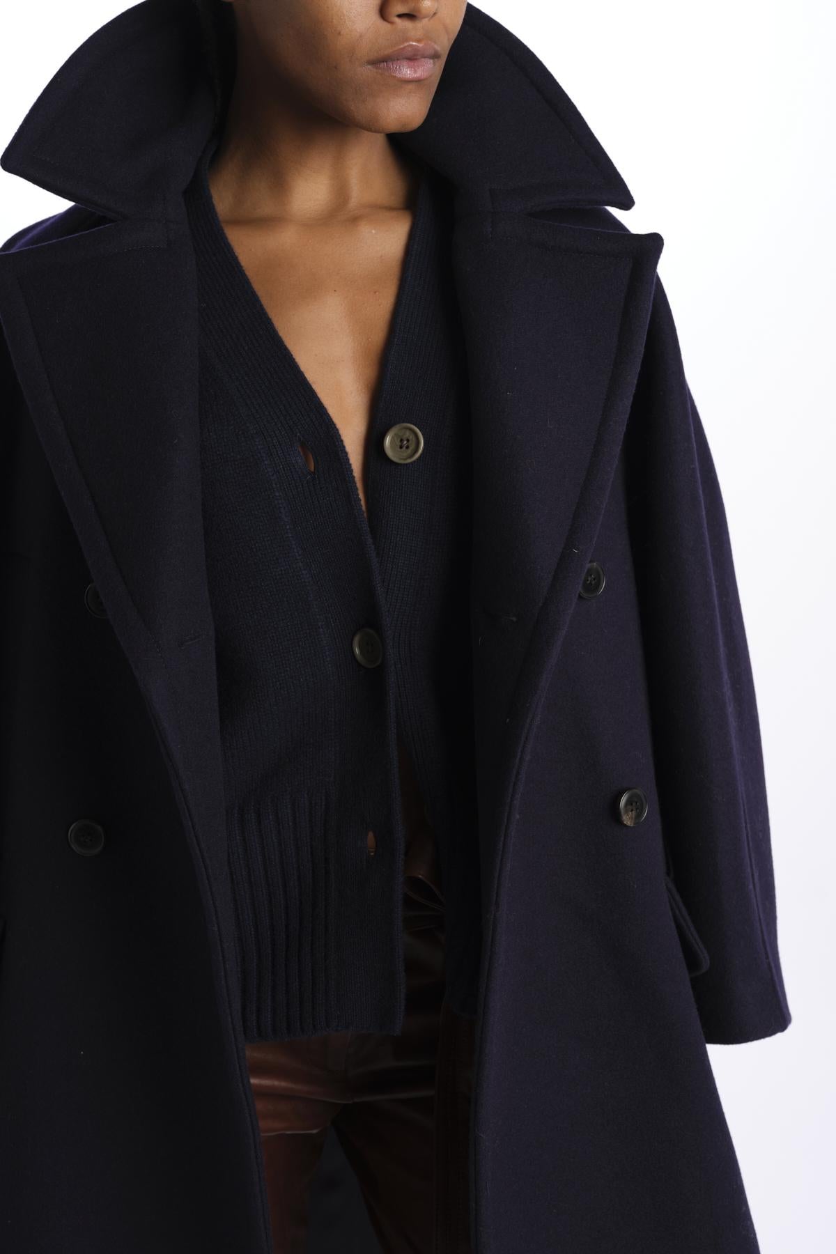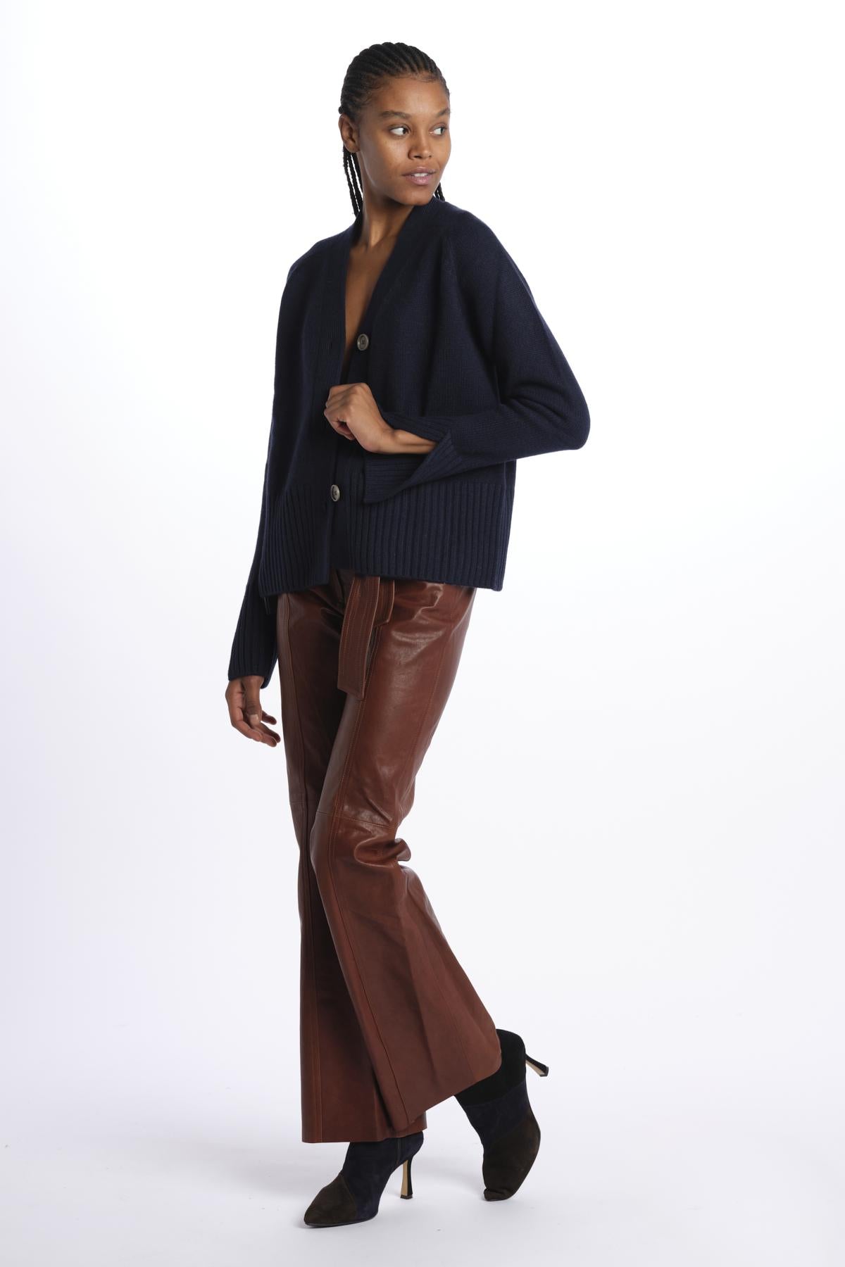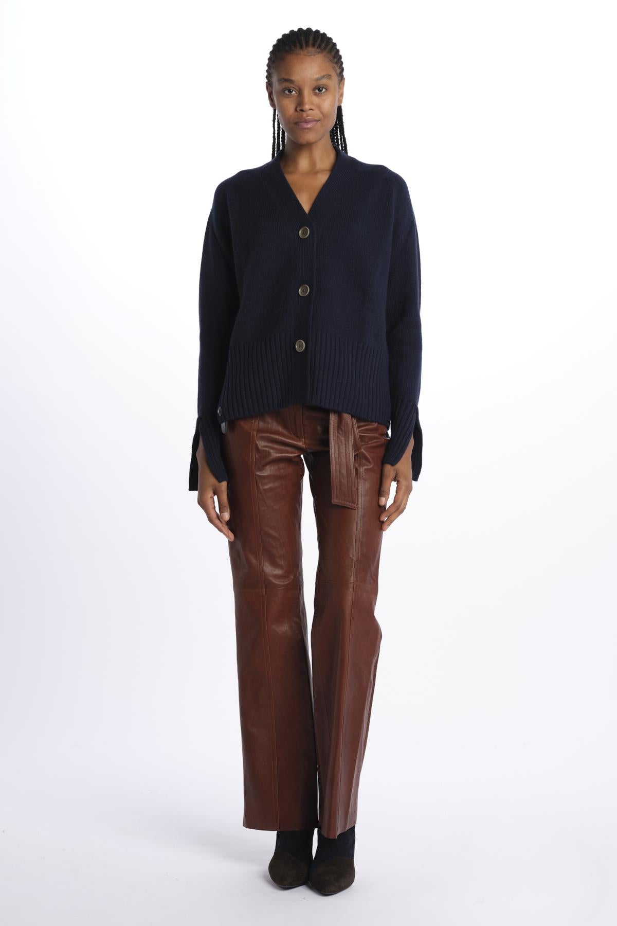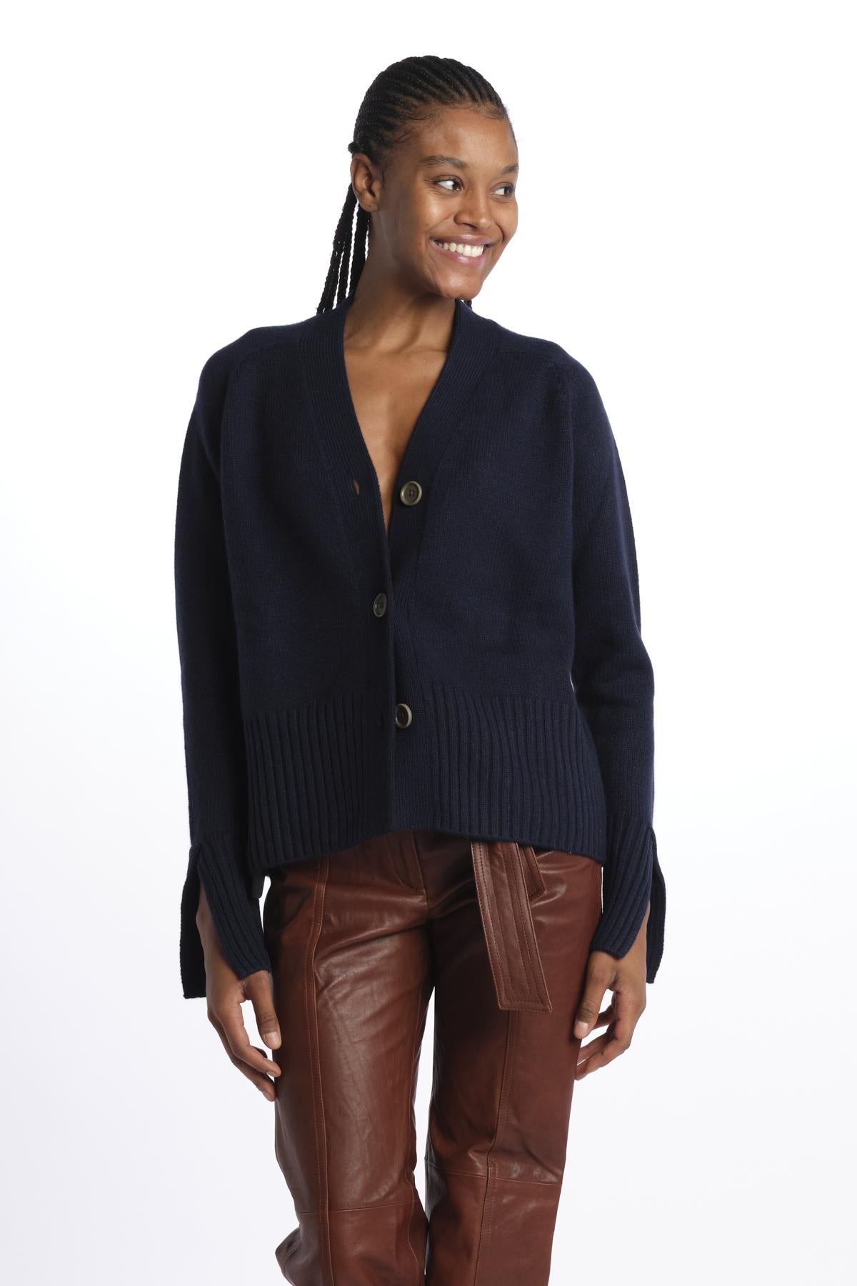 Cardigan 3 bottoni by milaura knit. La modella è alta 174 cm e indossa una taglia XS. Composizione: 100% cashmere.
