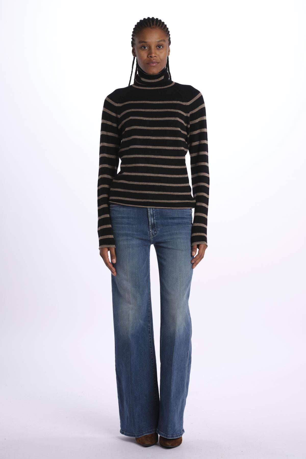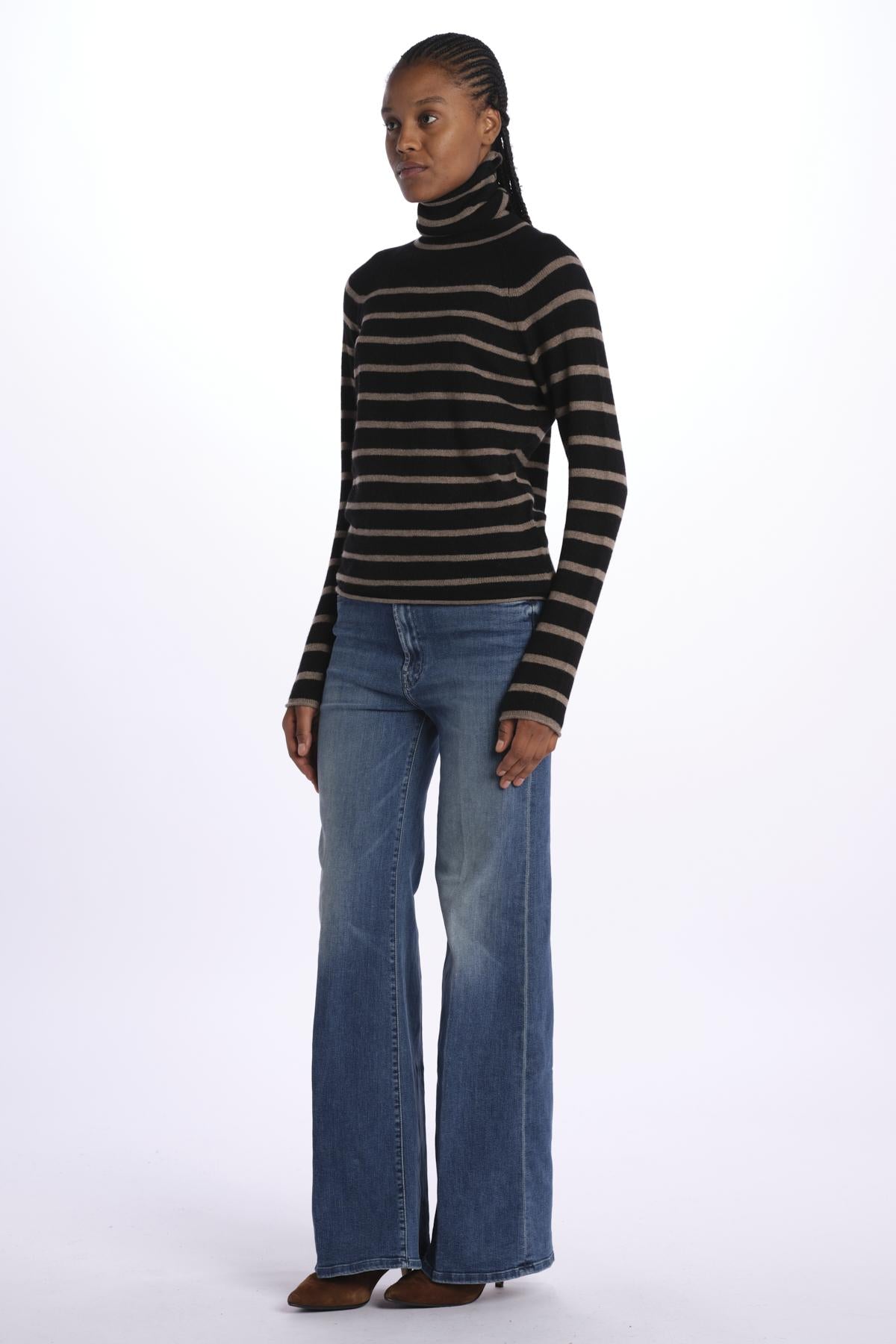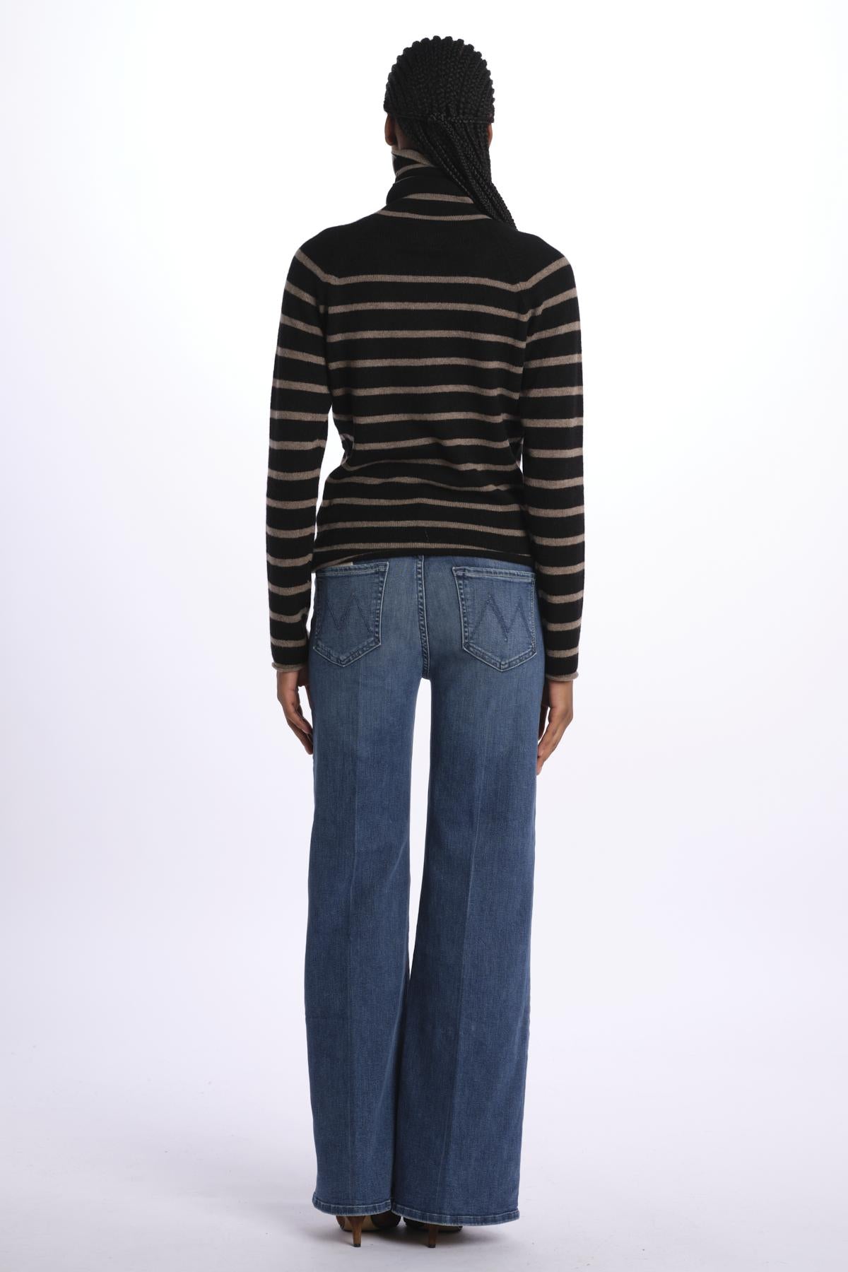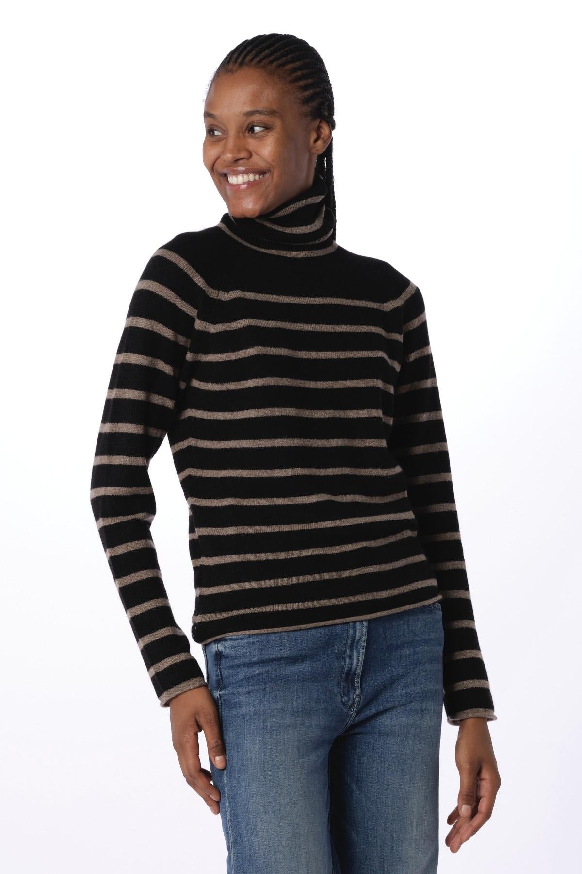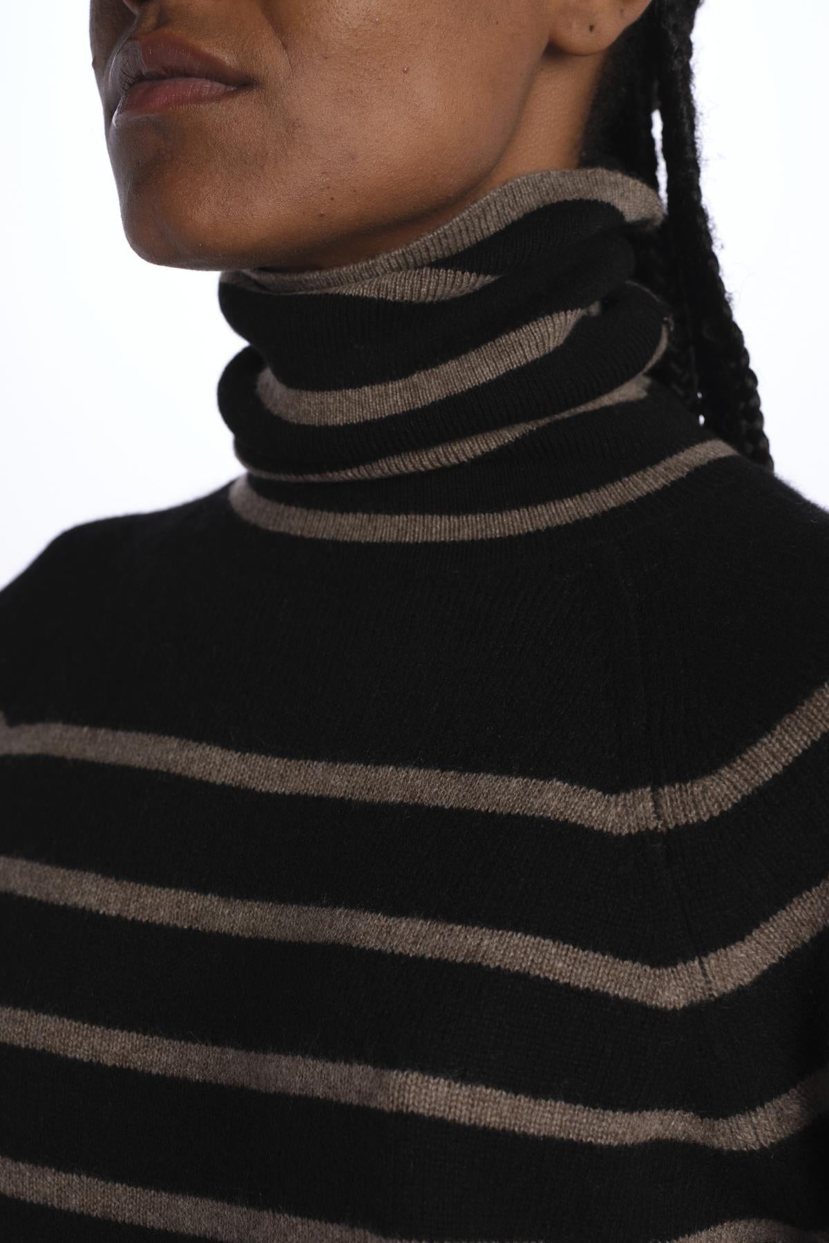 Dolcevita righe piccole by milaura knit. La modella è alta 174 cm e indossa una taglia XS. Composizione: 100% cashmere.