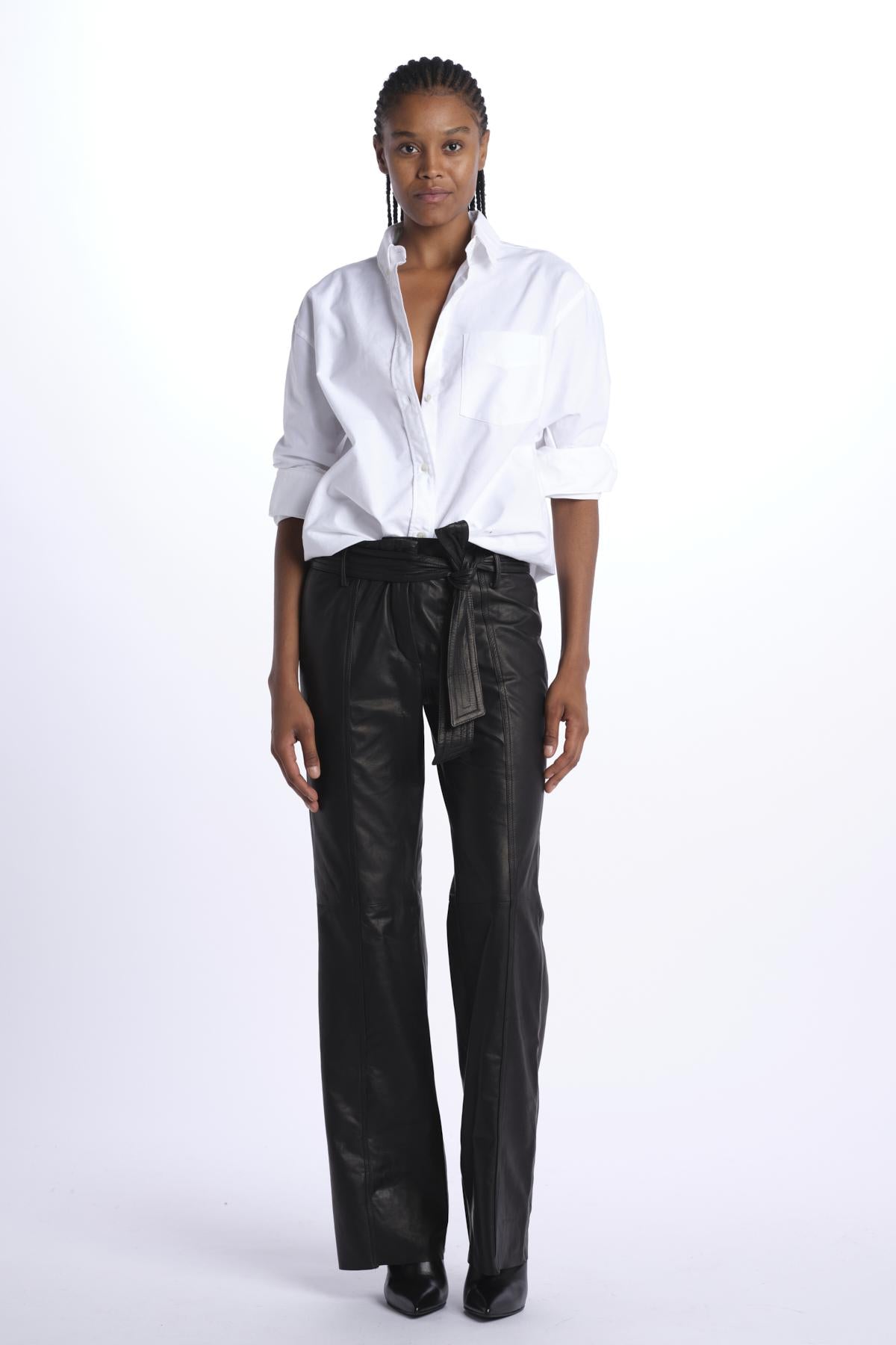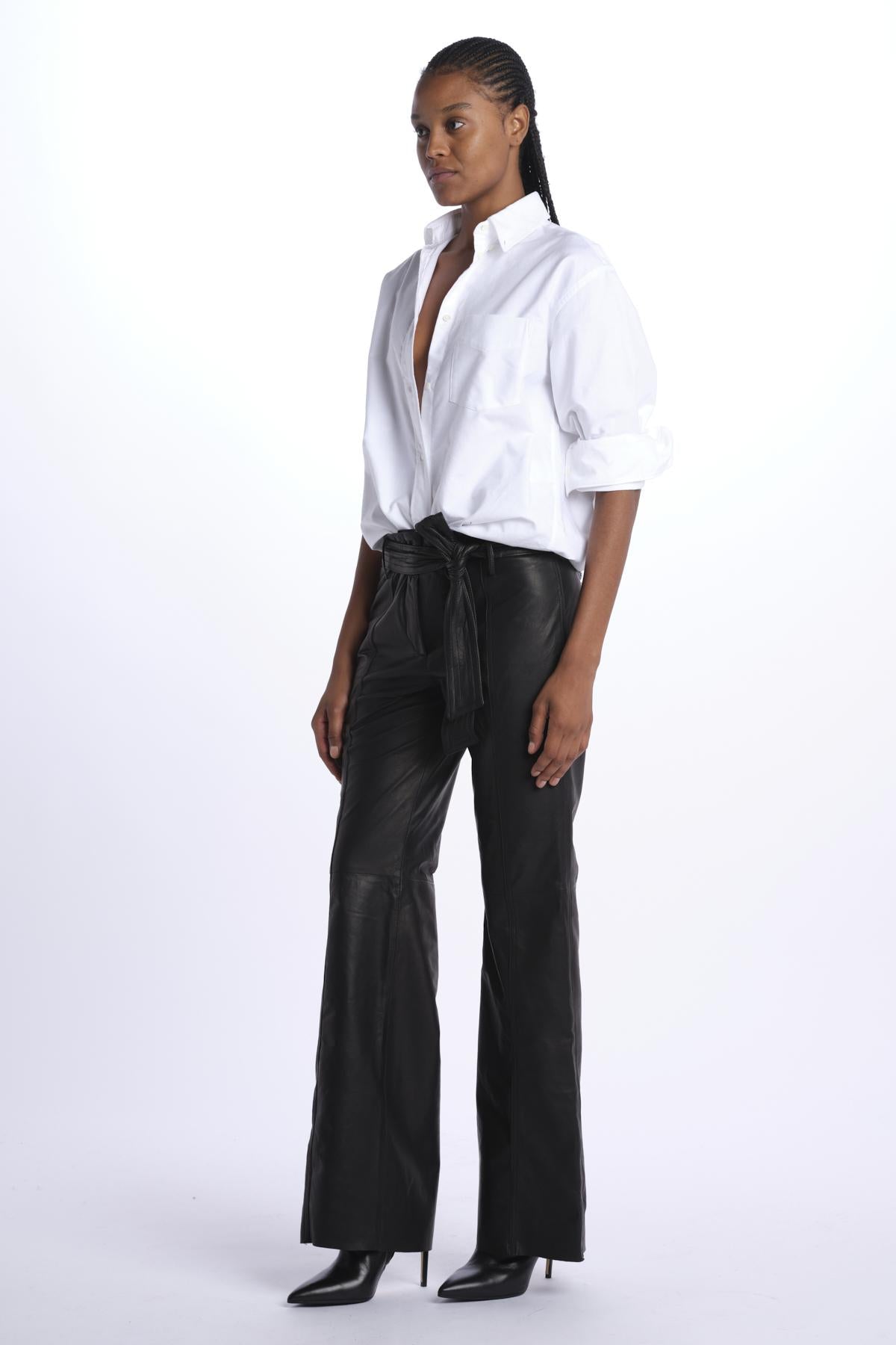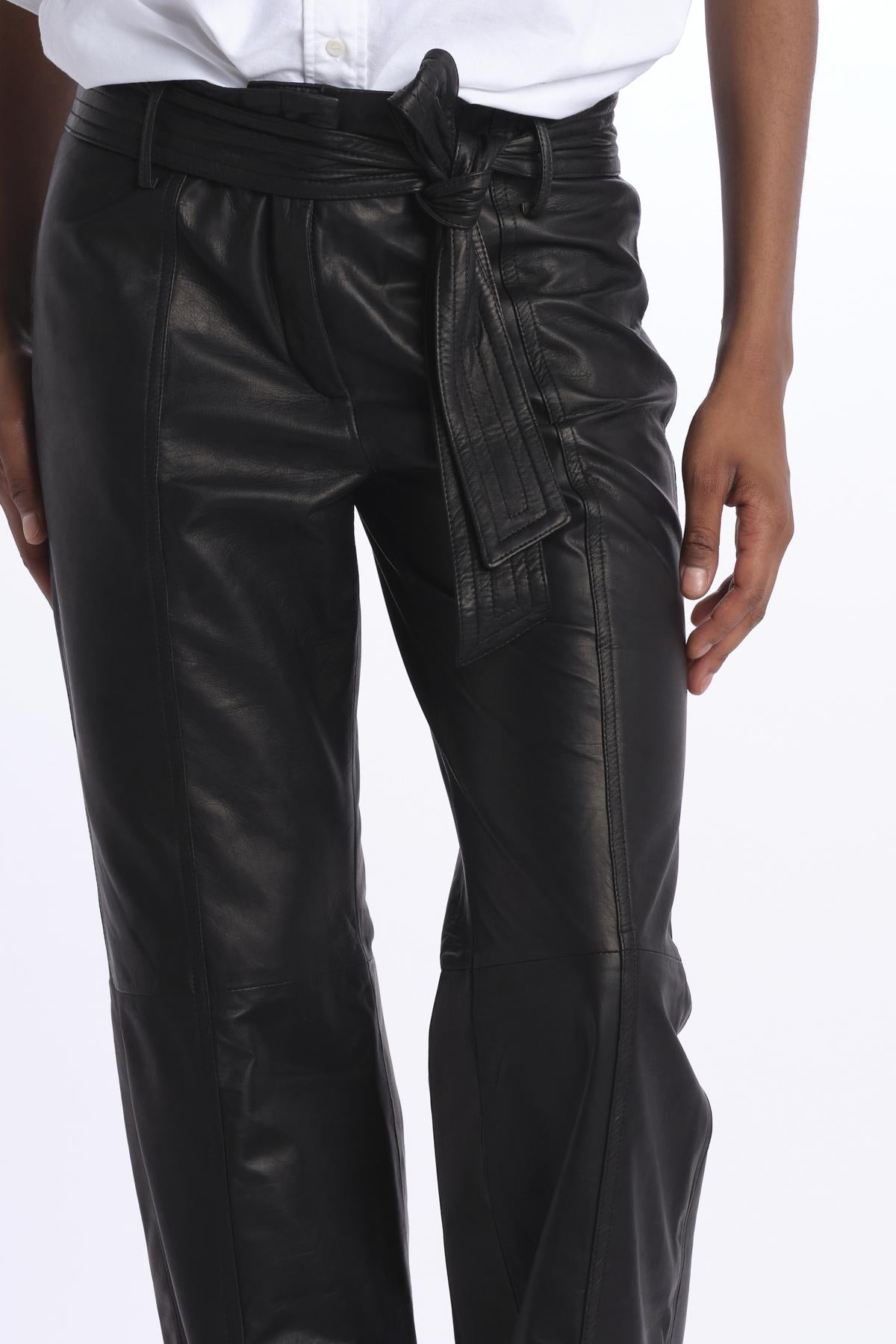 Pantalone con cintura by milaura leather. La modella è alta 174 cm e indossa una 38. Composizione: 100% pelle d'agnello.