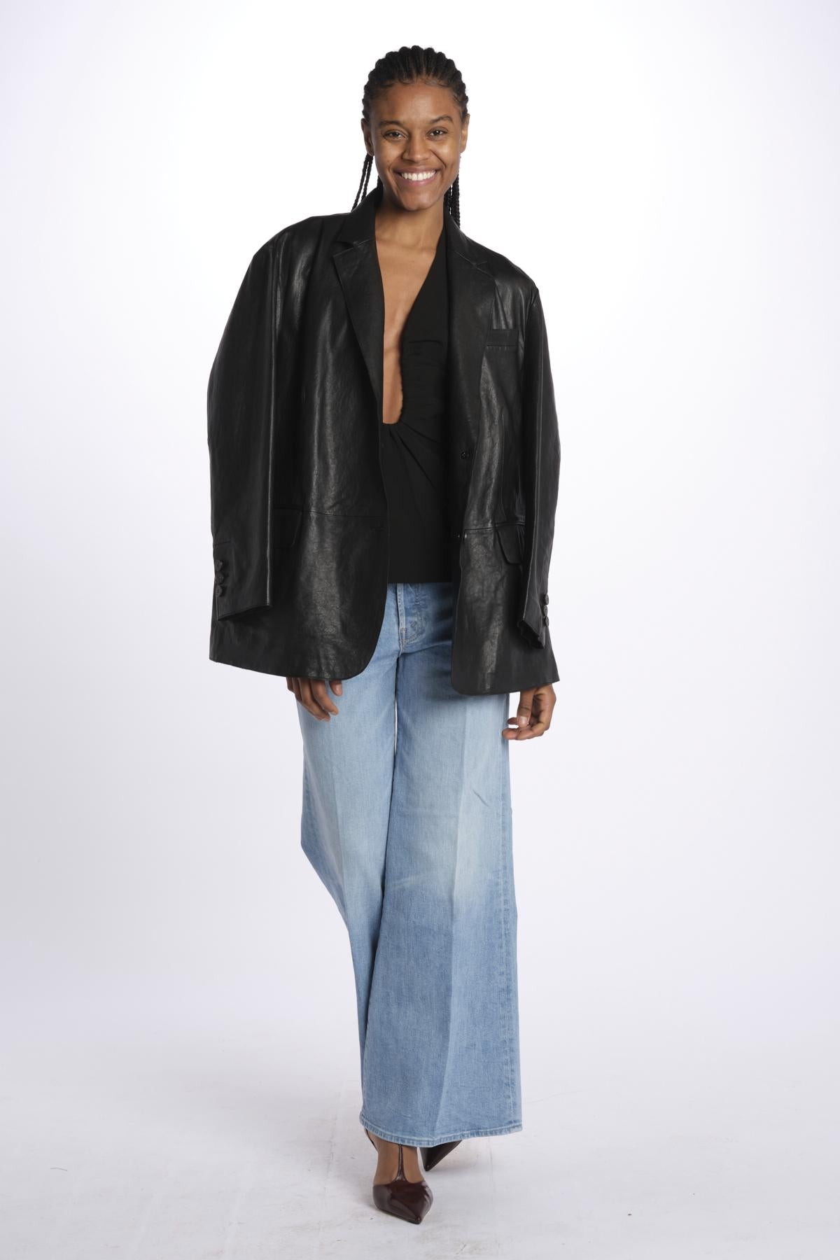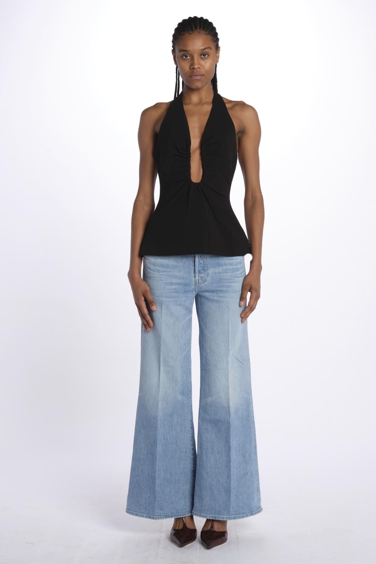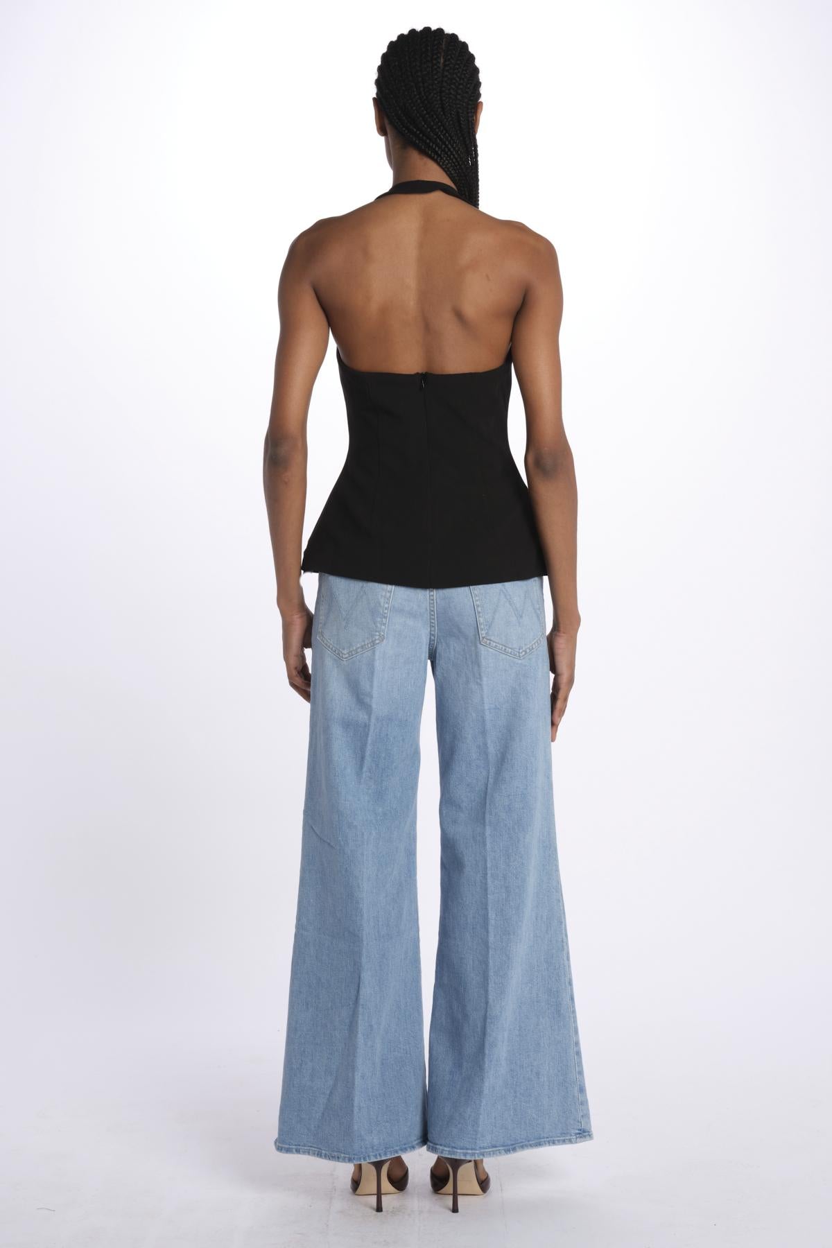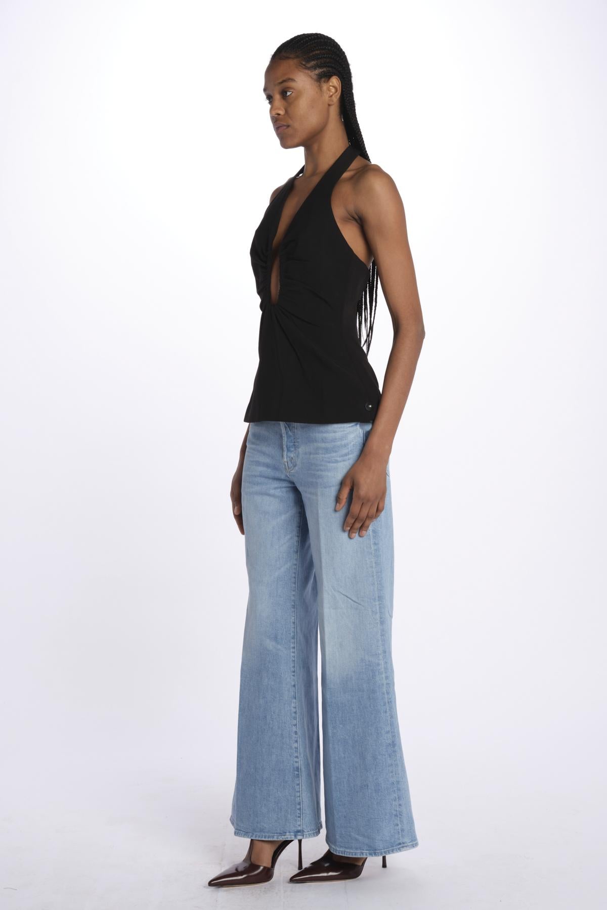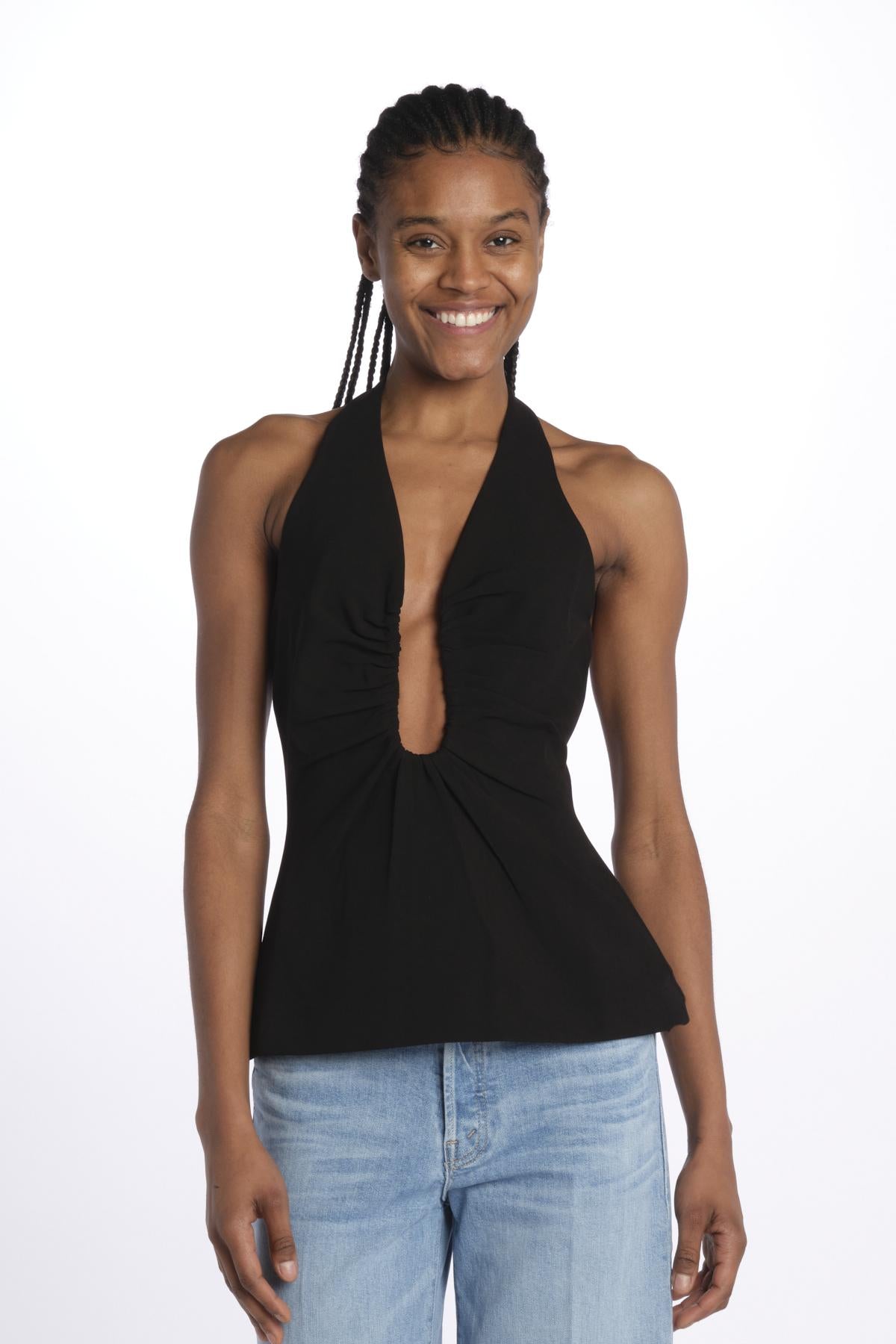 Top ALUSIA scollato dlouble by misha. La modella è alta 174 cm e indossa una XS. Composizione: 74% poliestere, 20% viscosa, 6% elastane.