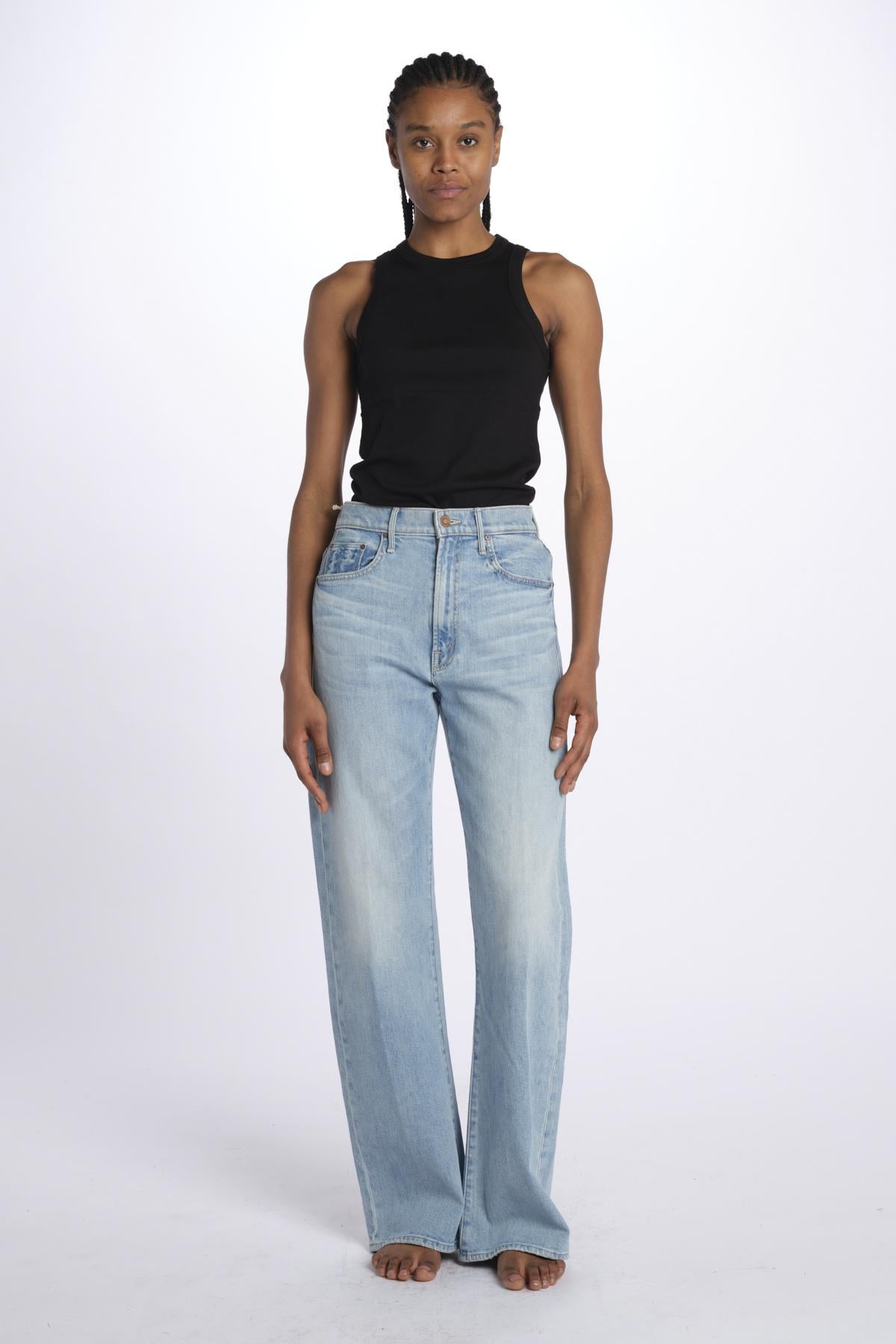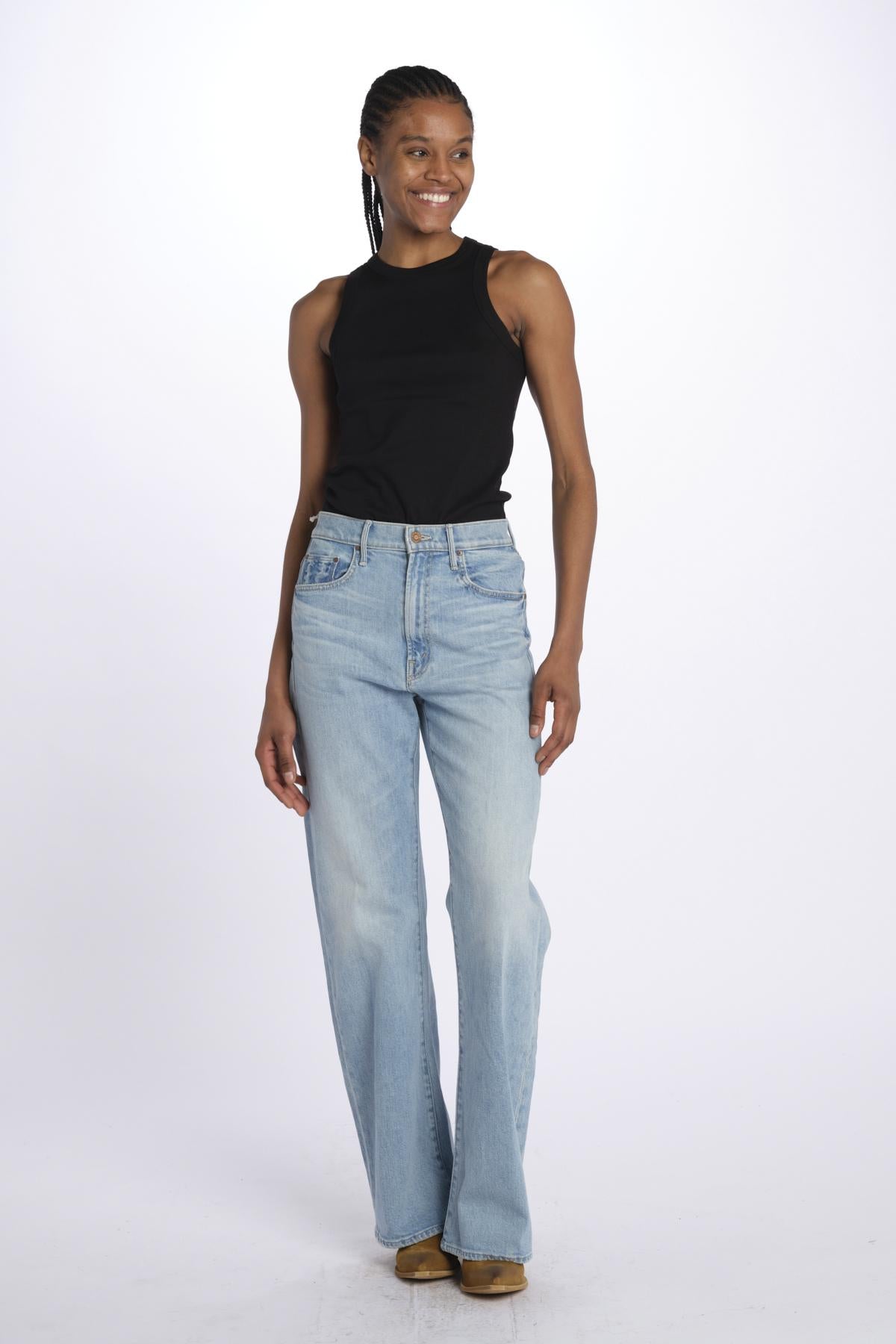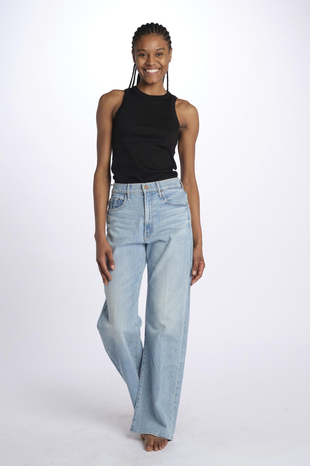 Denim banana by mother. La modella è alta 174 cm e indossa una taglia 26. Composizione: 97% cotone, 2,5% poliestere, 0,5% lycra.