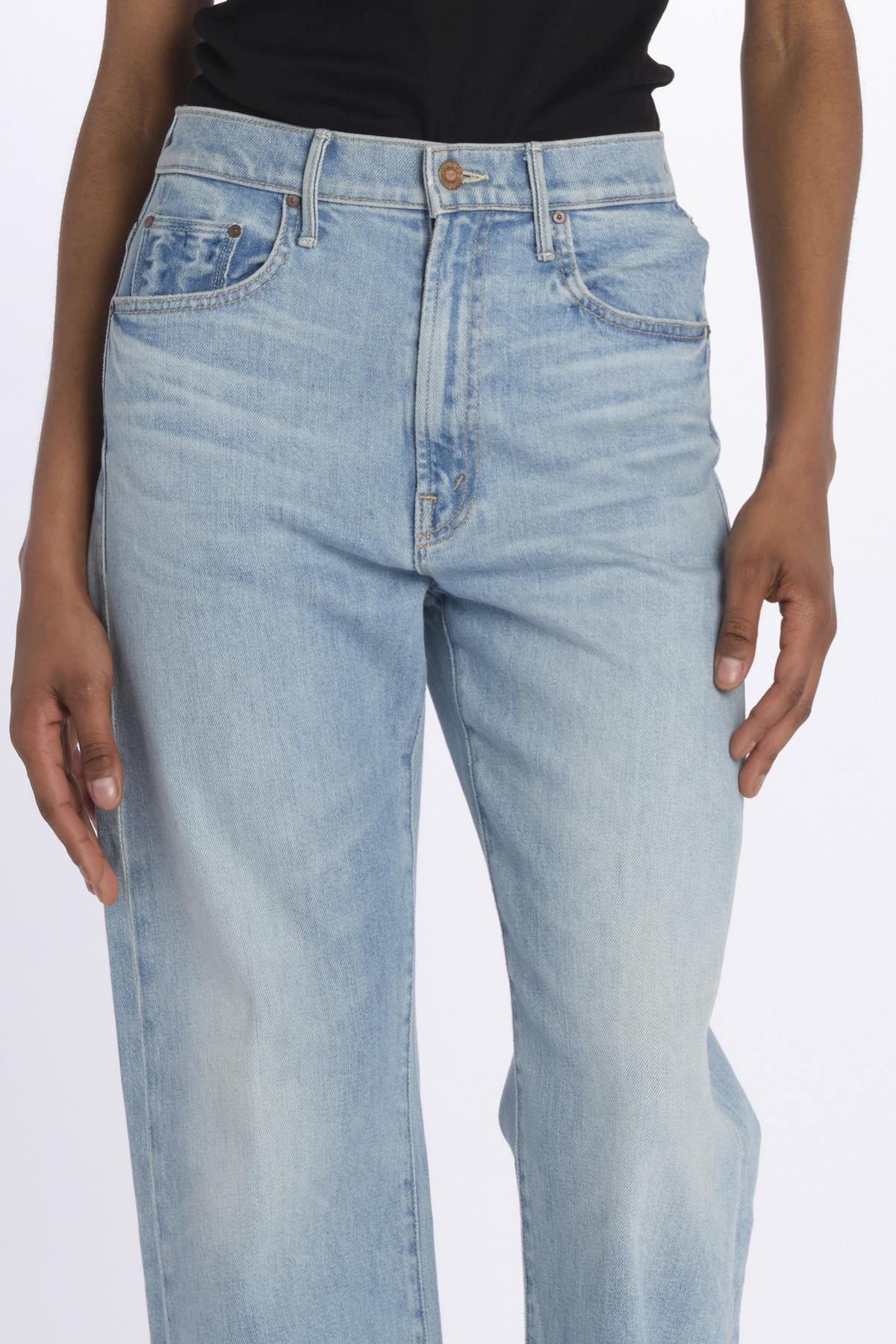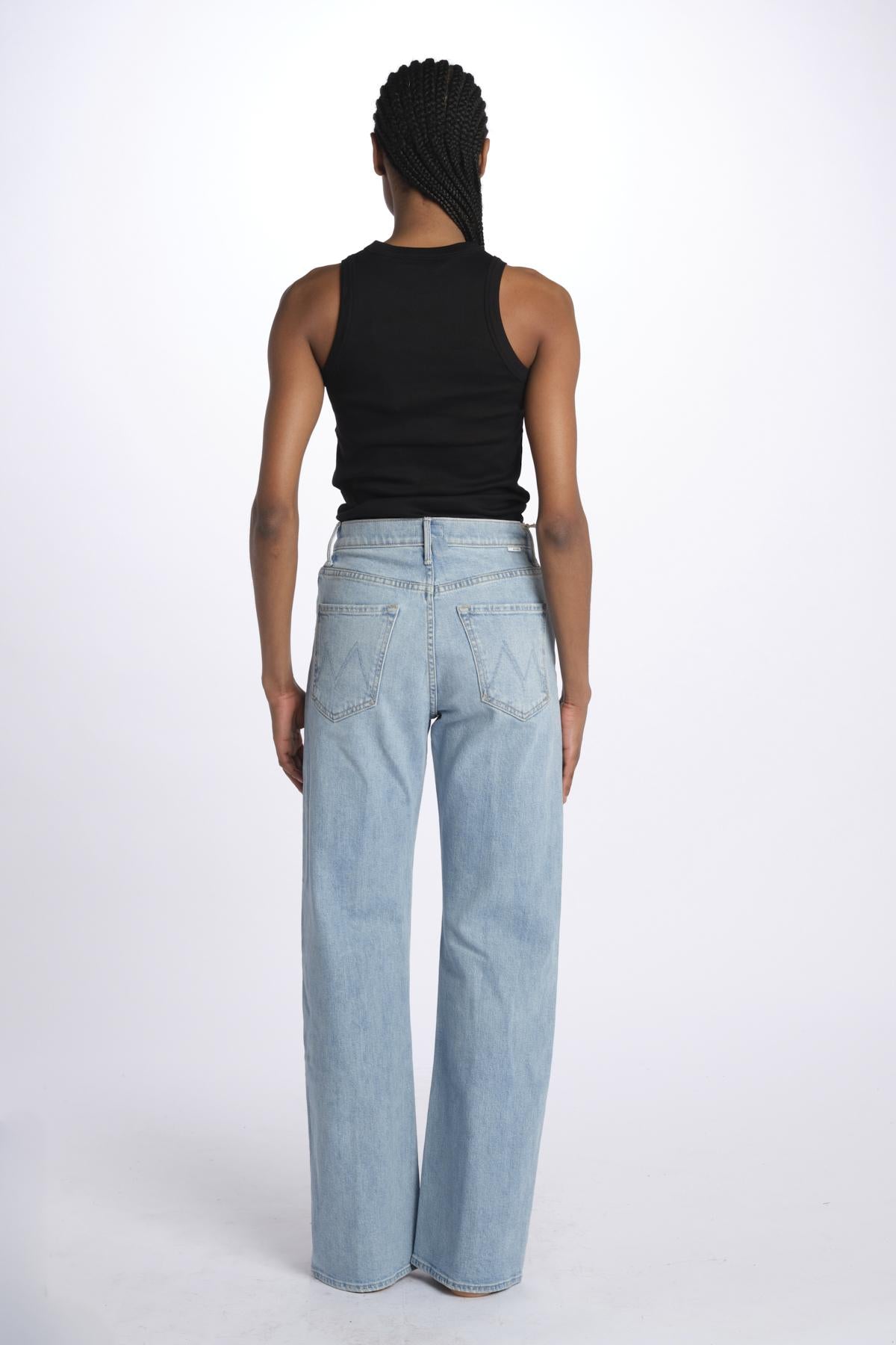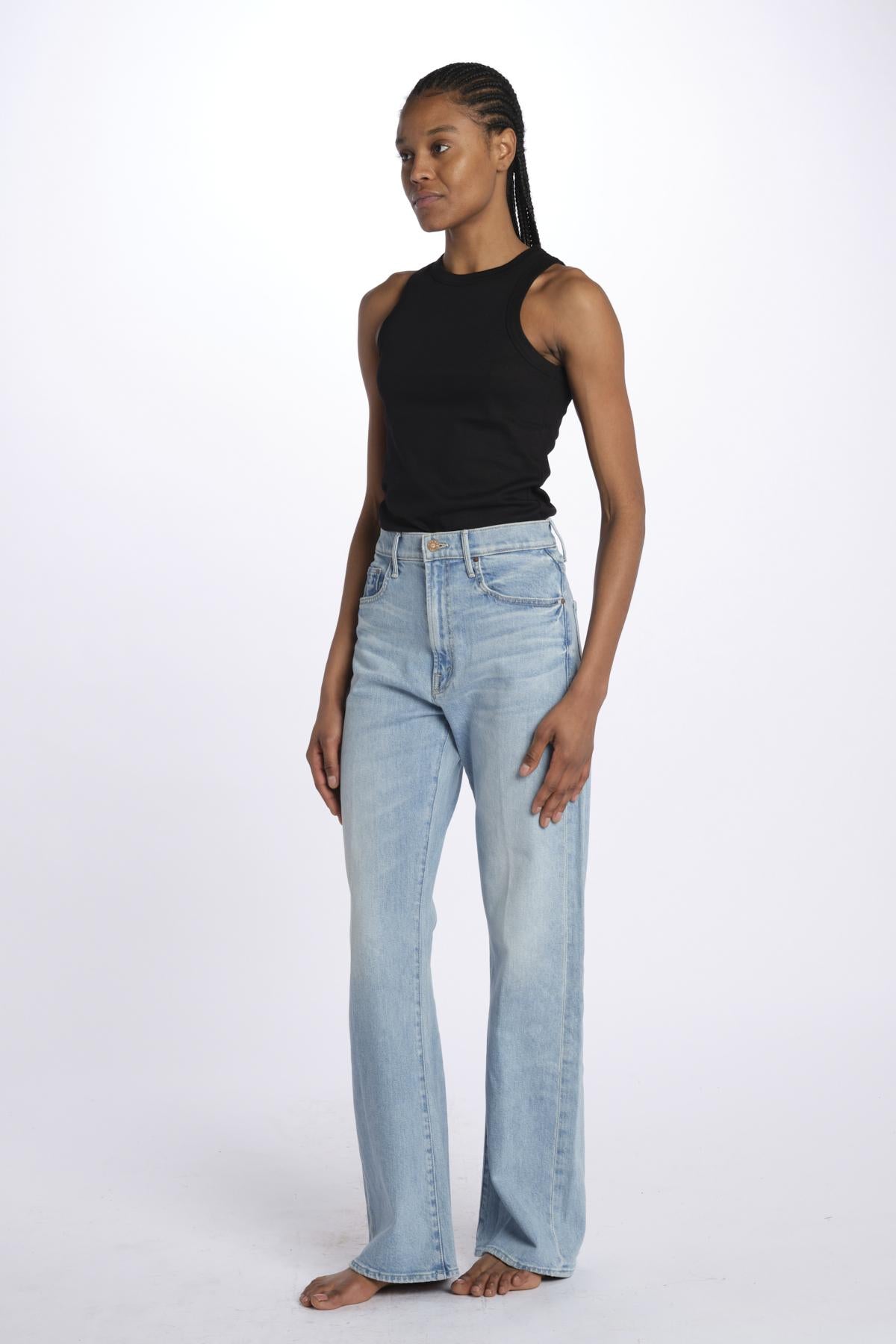Denim banana by mother. La modella è alta 174 cm e indossa una taglia 26. Composizione: 97% cotone, 2,5% poliestere, 0,5% lycra.