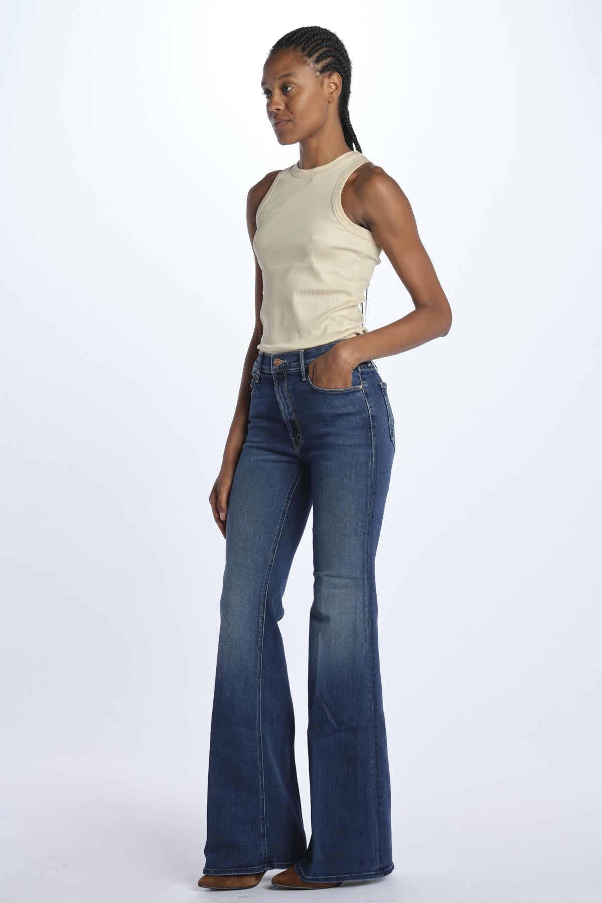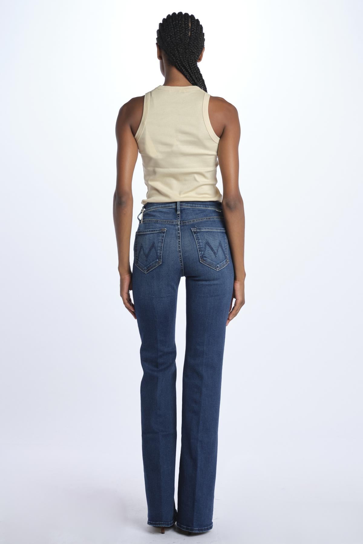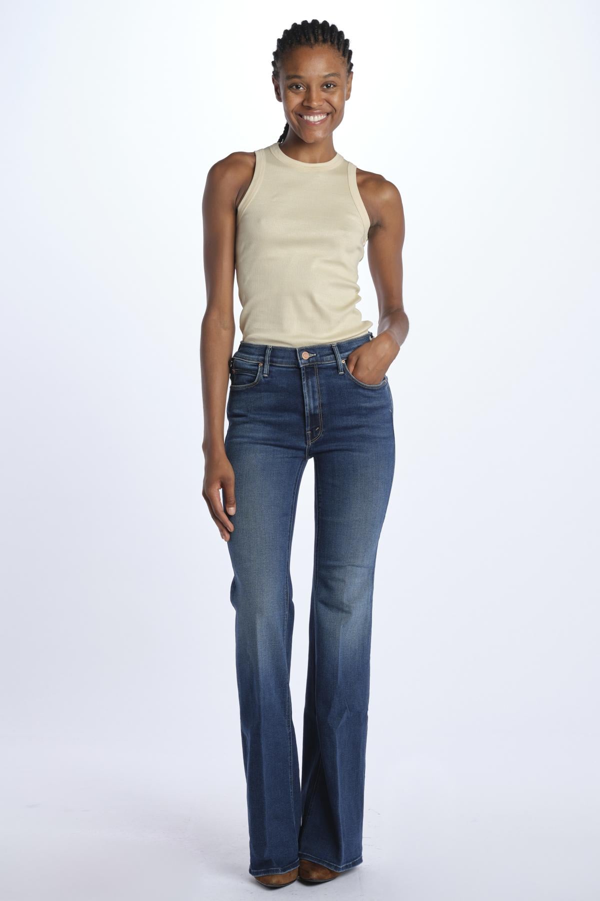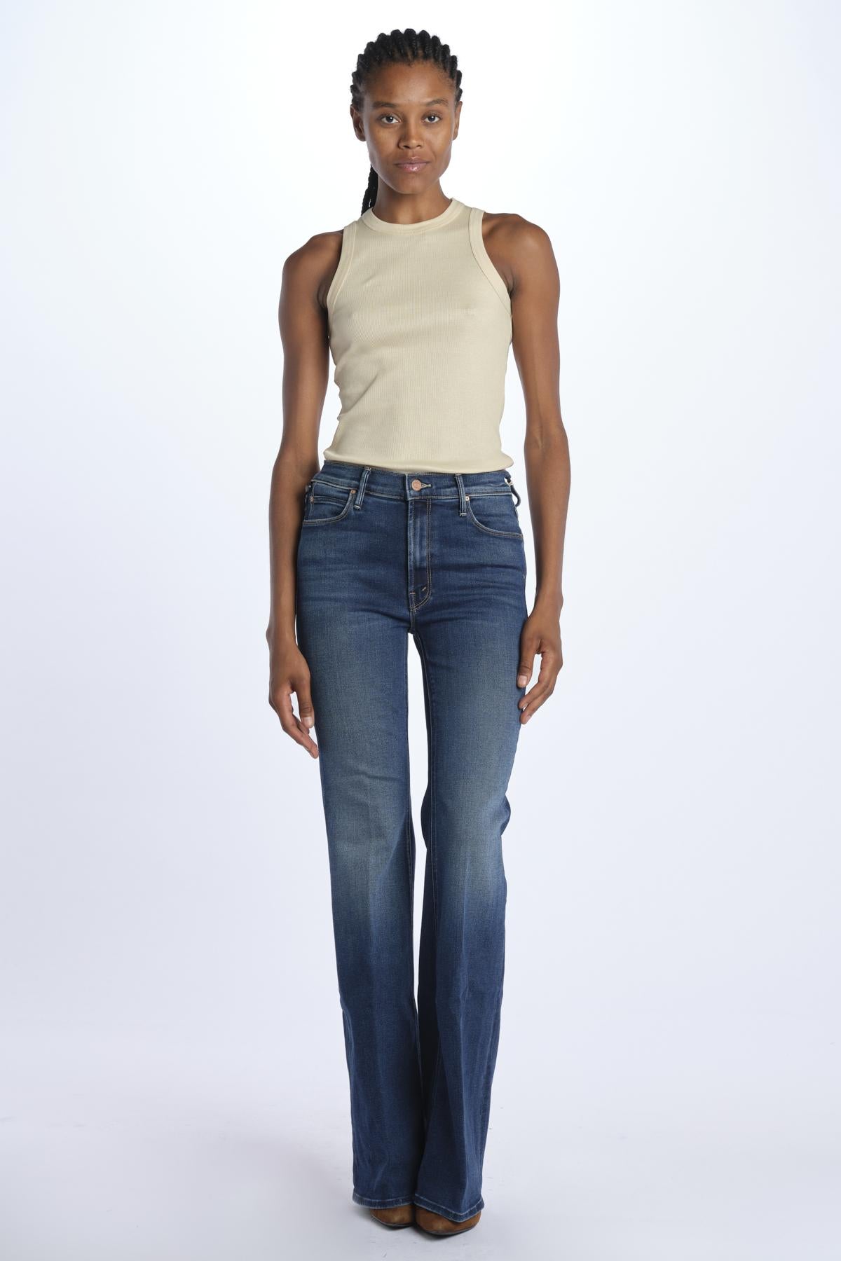 Denim zampa by mother. La modella è alta 174 cm e indossa una 25. Composizione: 78% cotone, 16% modal, 4% poliestere, 2% elastane.