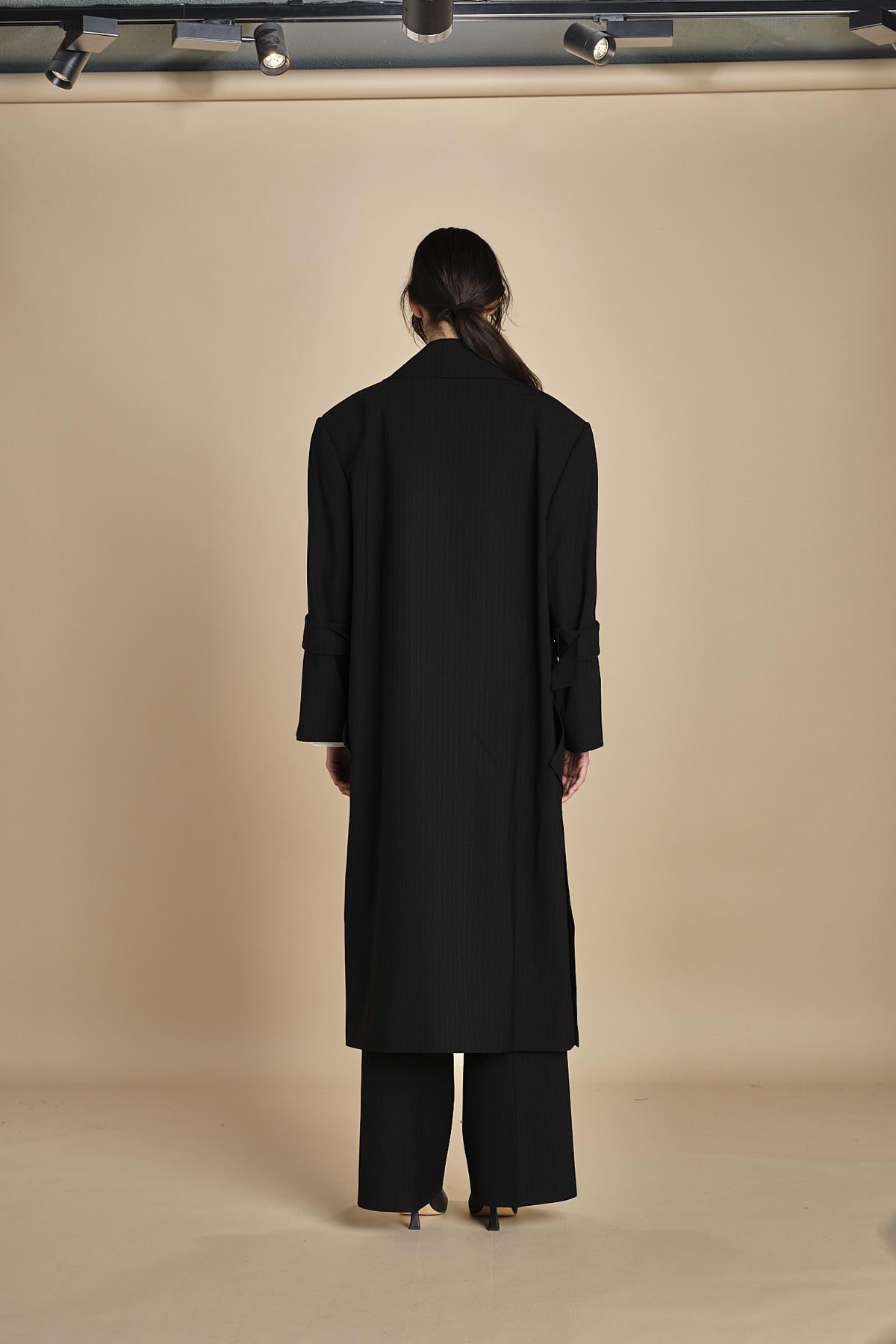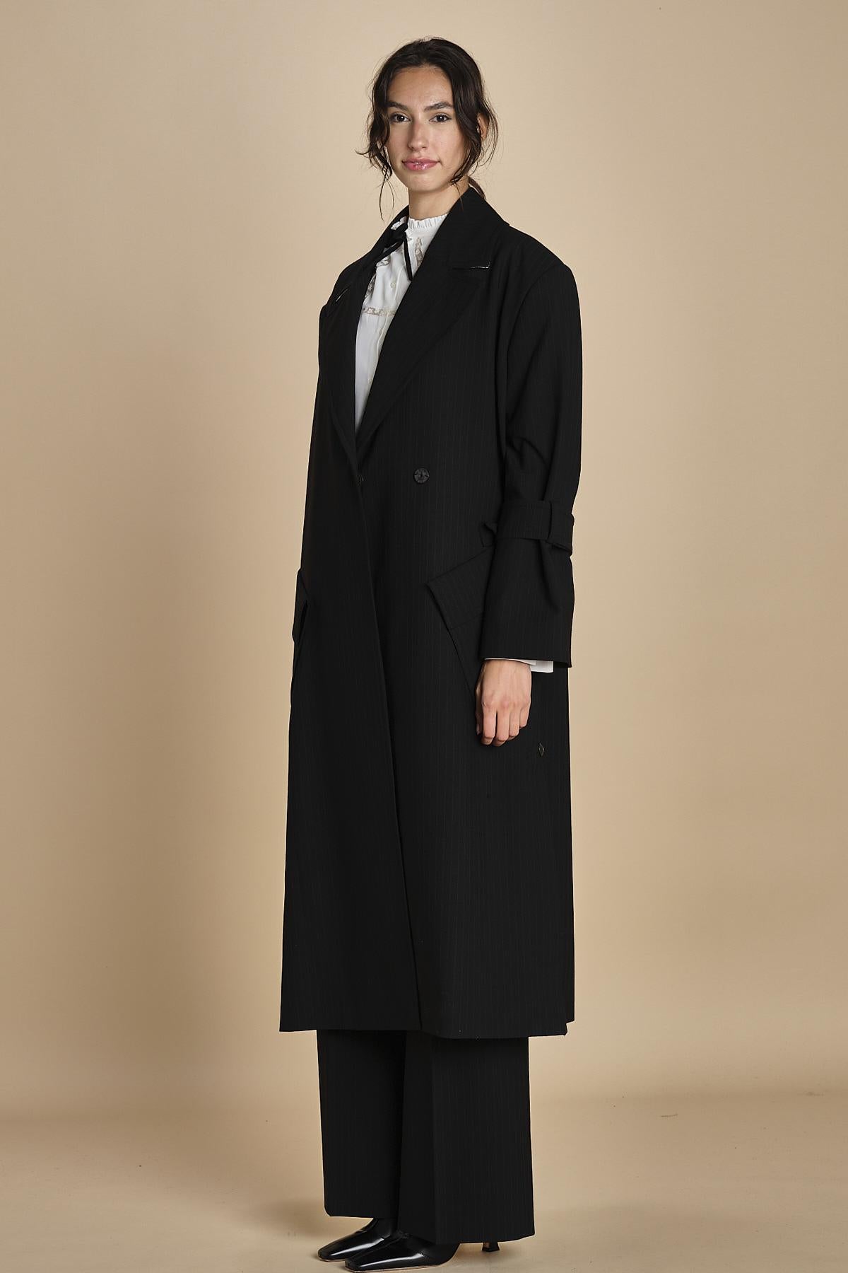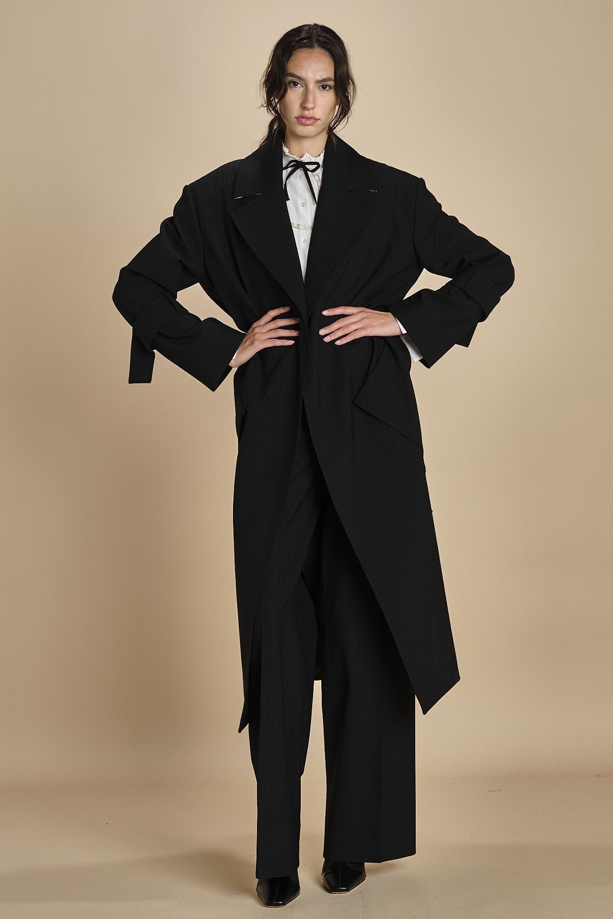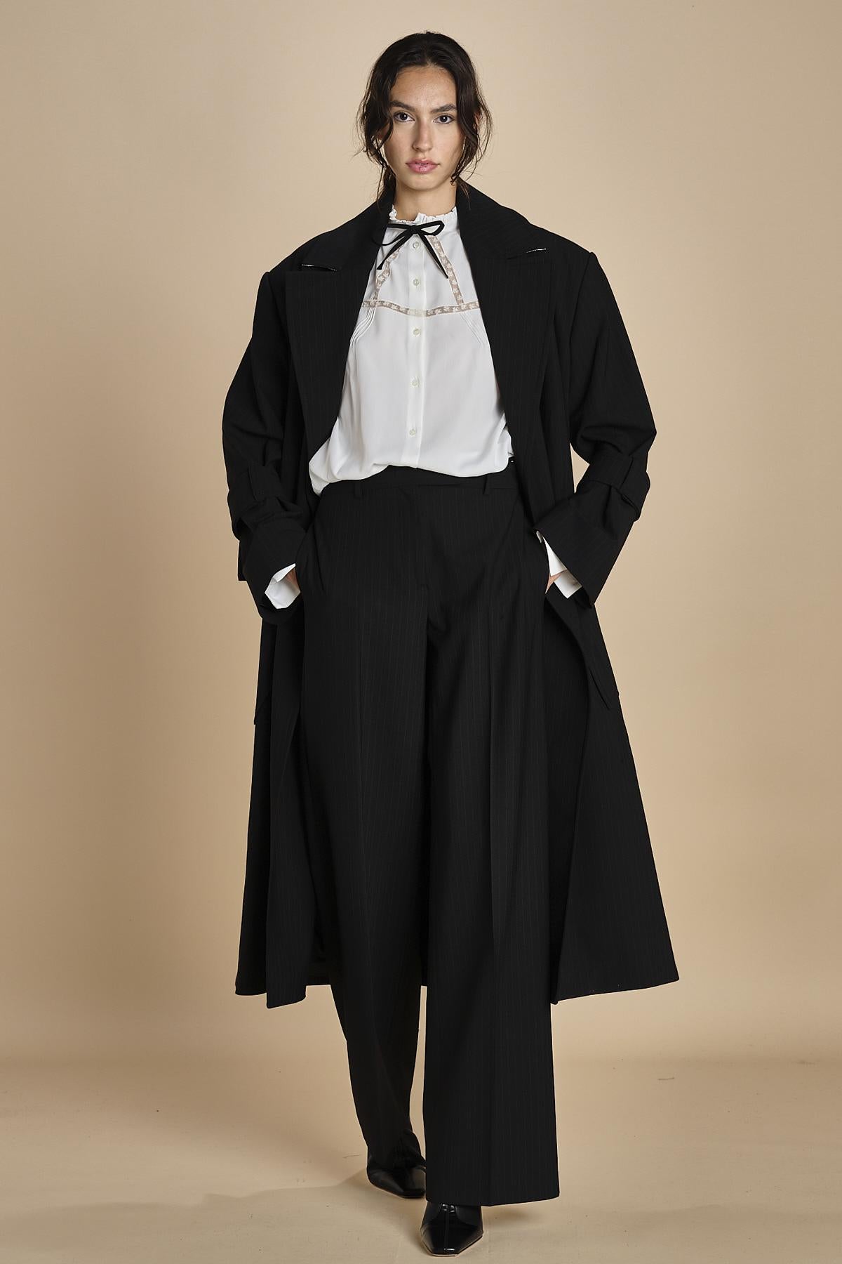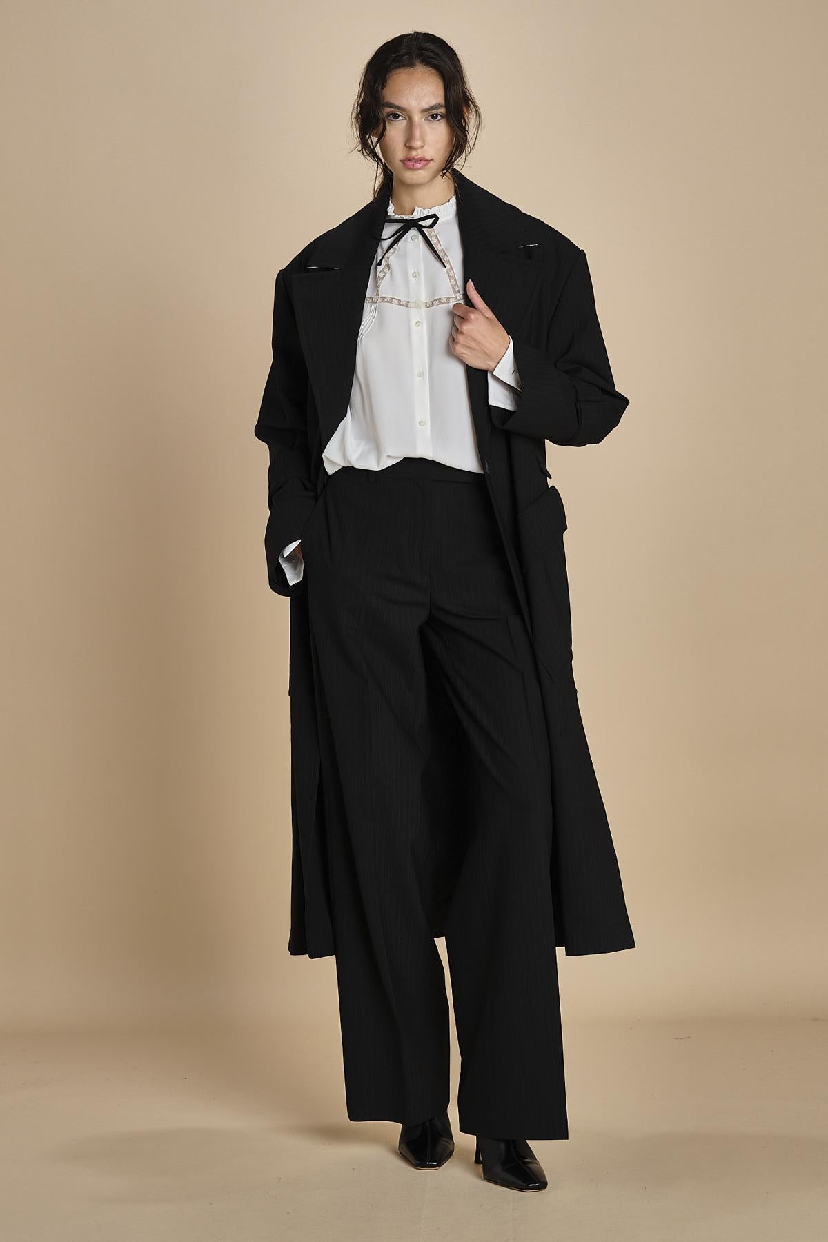 tremch gessato in gabardine. La modella è alta 180 cm e indossa una taglia 38. 53% POLIESTERE 43% LANA VERGINE 4% ELASTAN