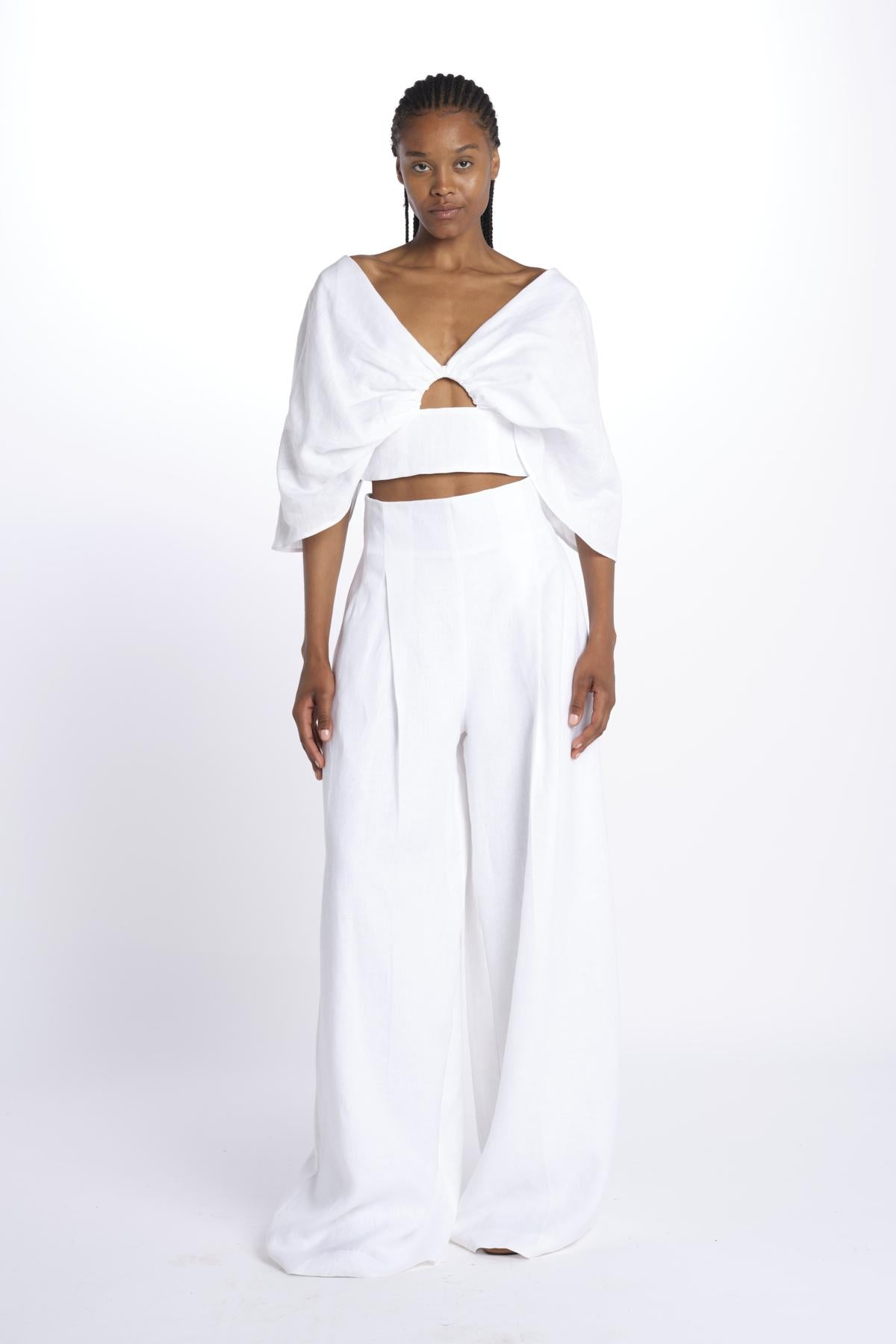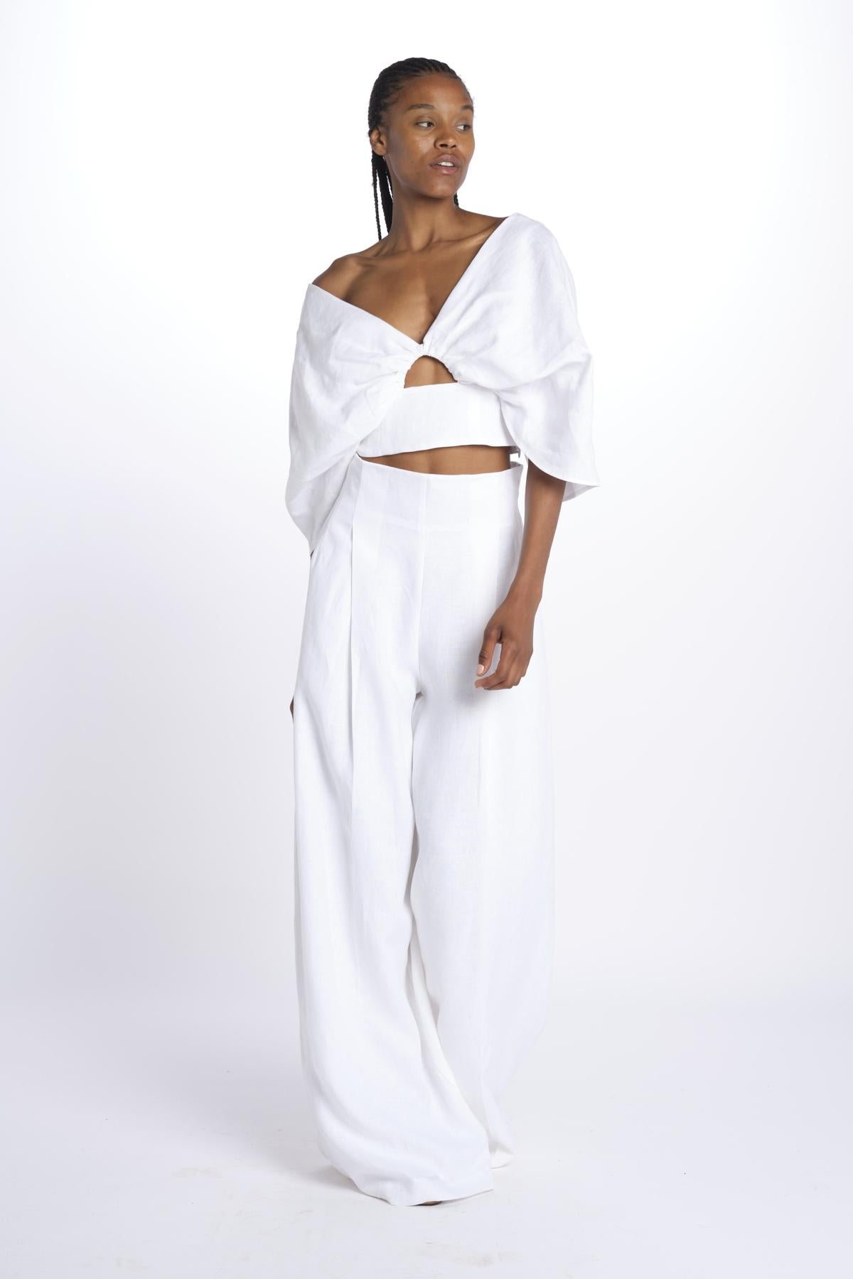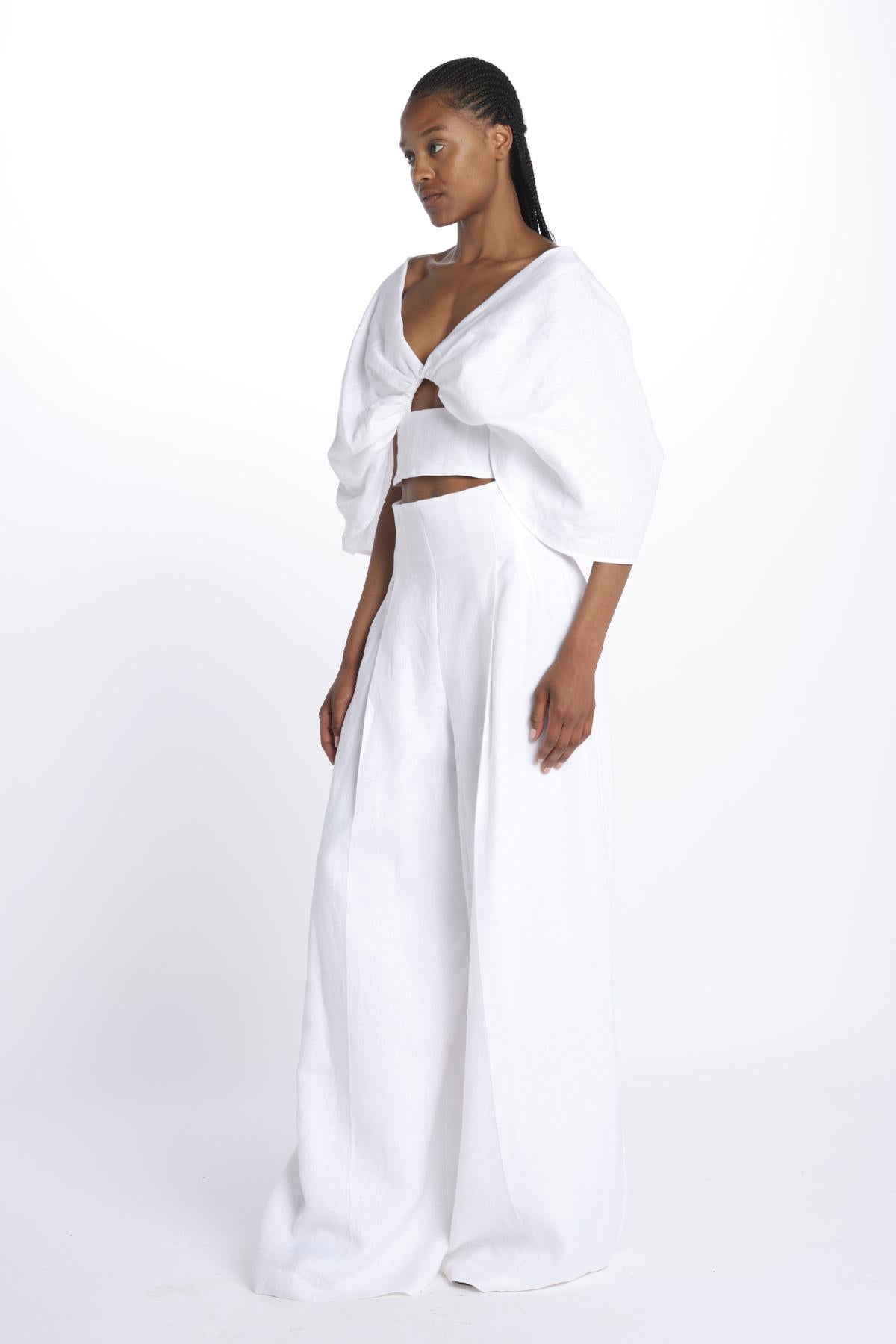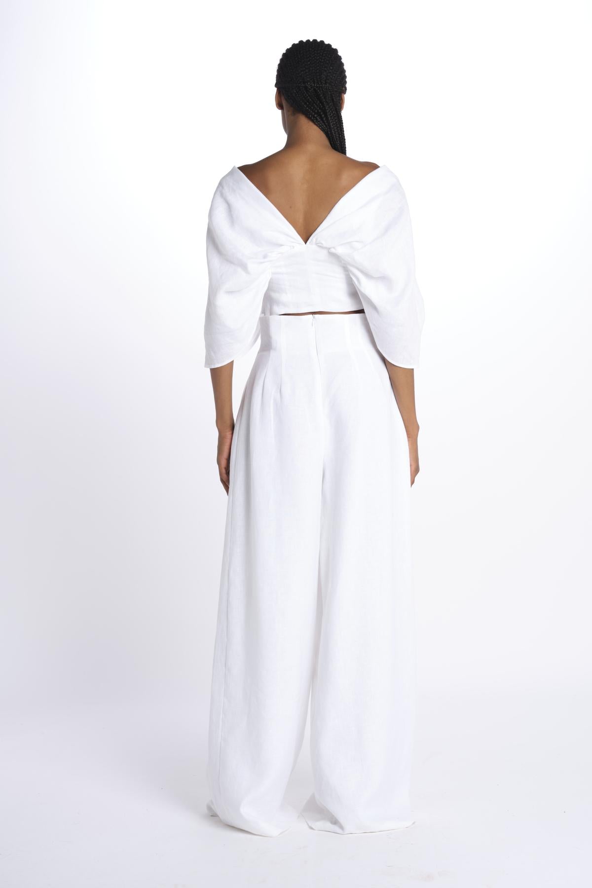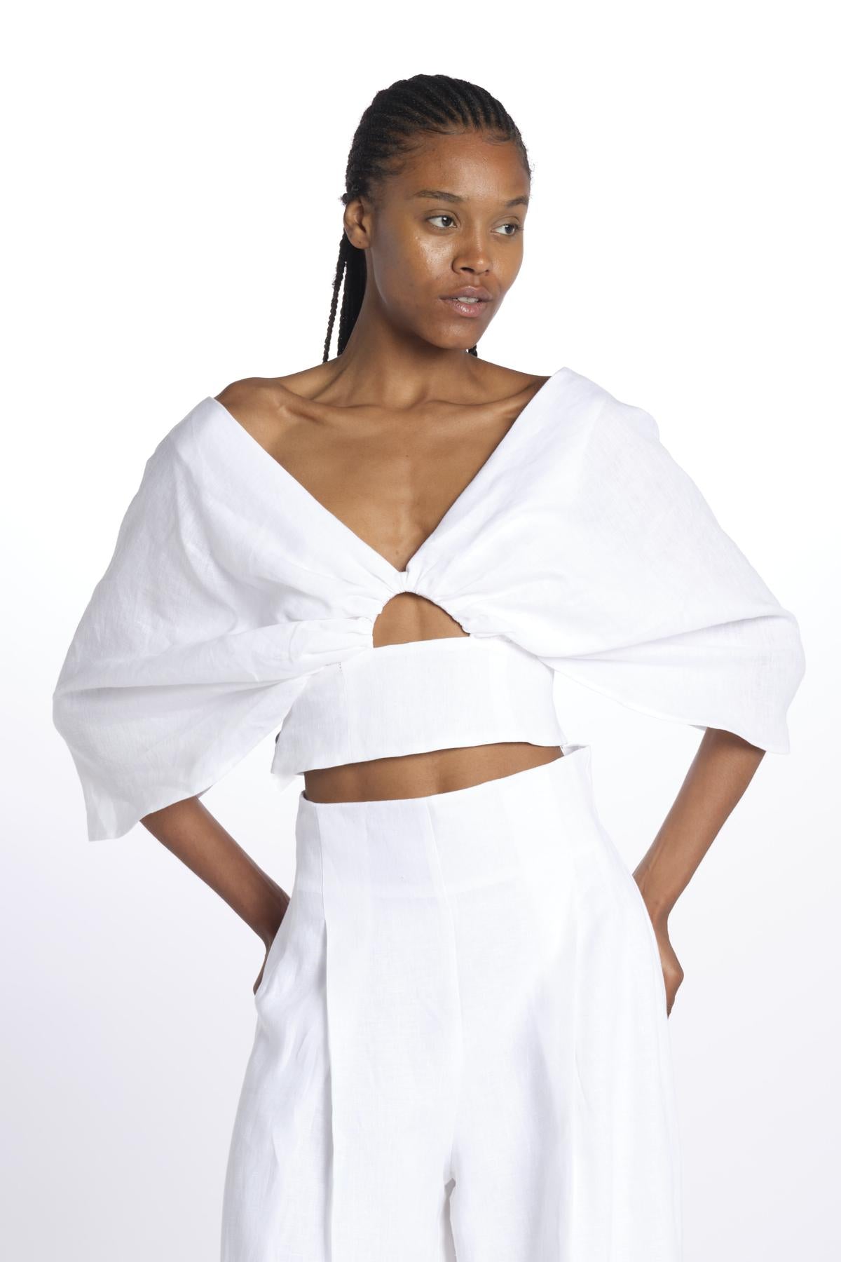 NIKA top manica a sbuffo con buco by inasami. La modella è alta 174 cm e indossa una taglia 1. Composizione: 100% lino.