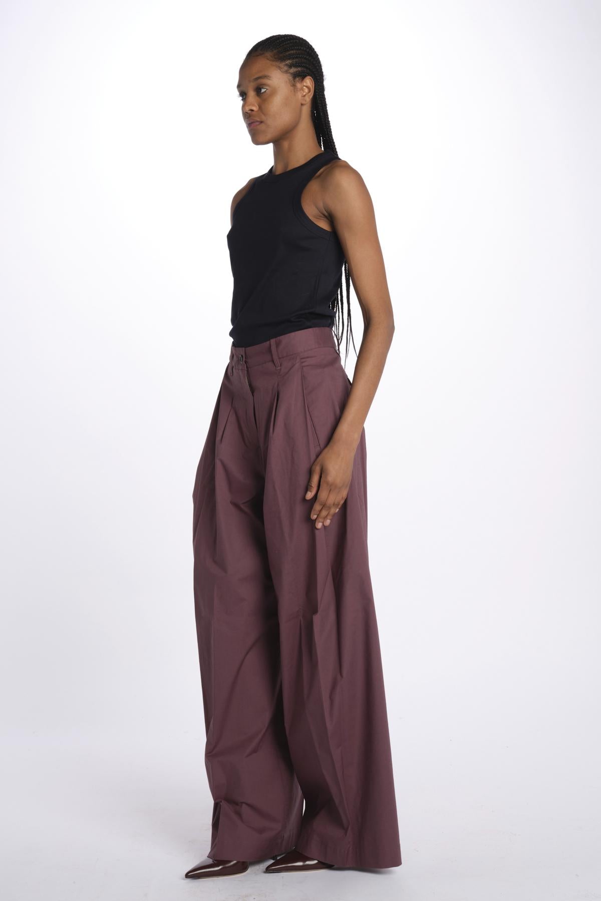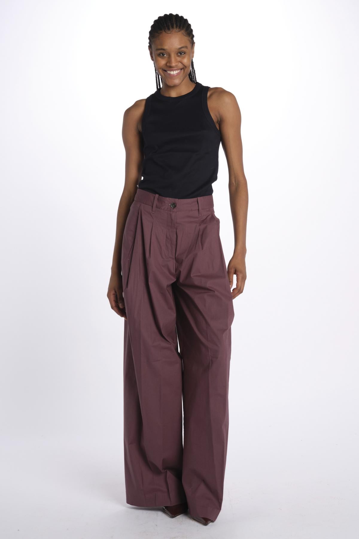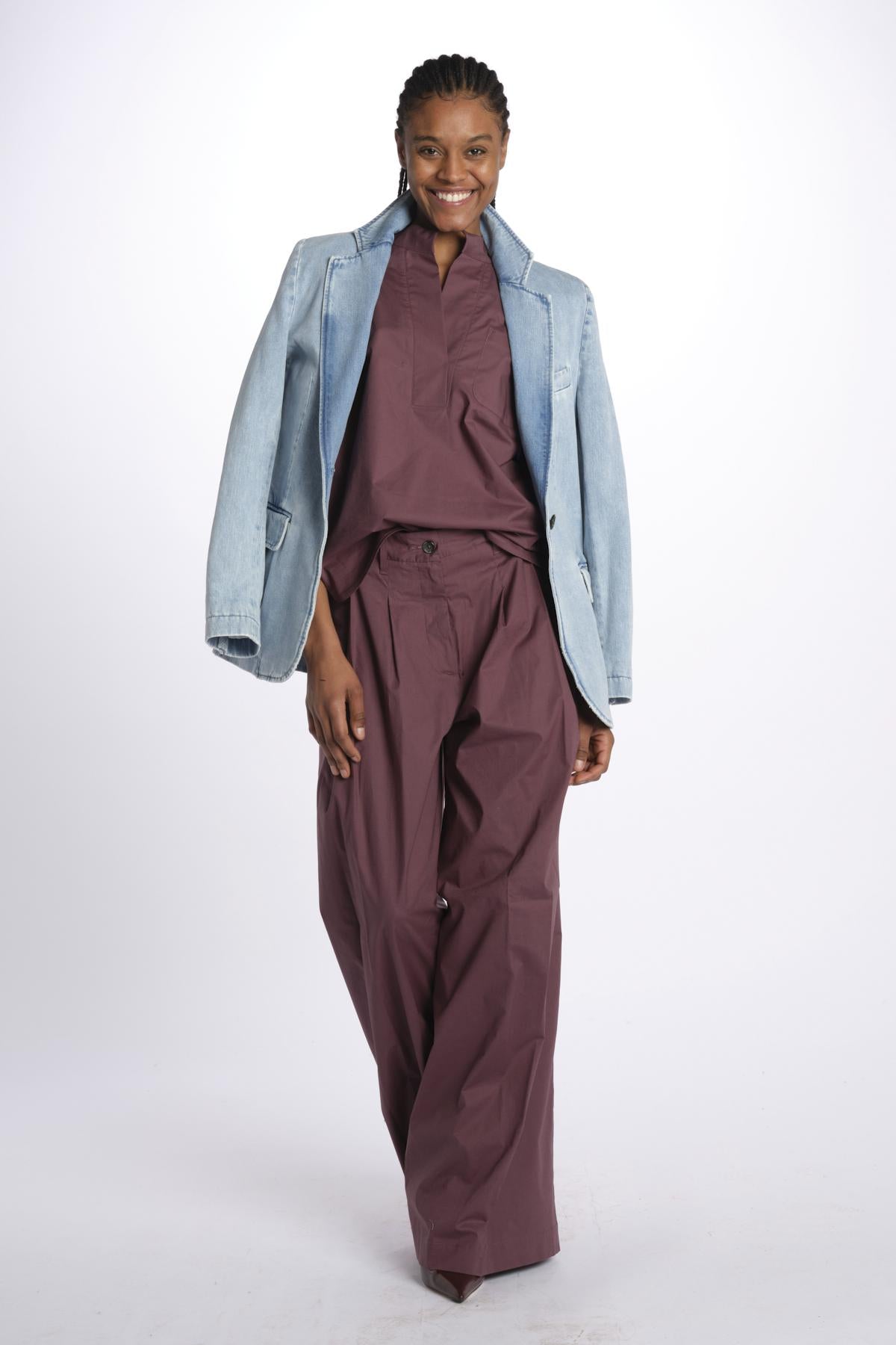 Pant PETRA 2 pinces popeline by nine in the morning. La modella è alta 174 cm e indossa una taglia 25. Composizione: 92% cotone, 5% elastane, 3% seta.