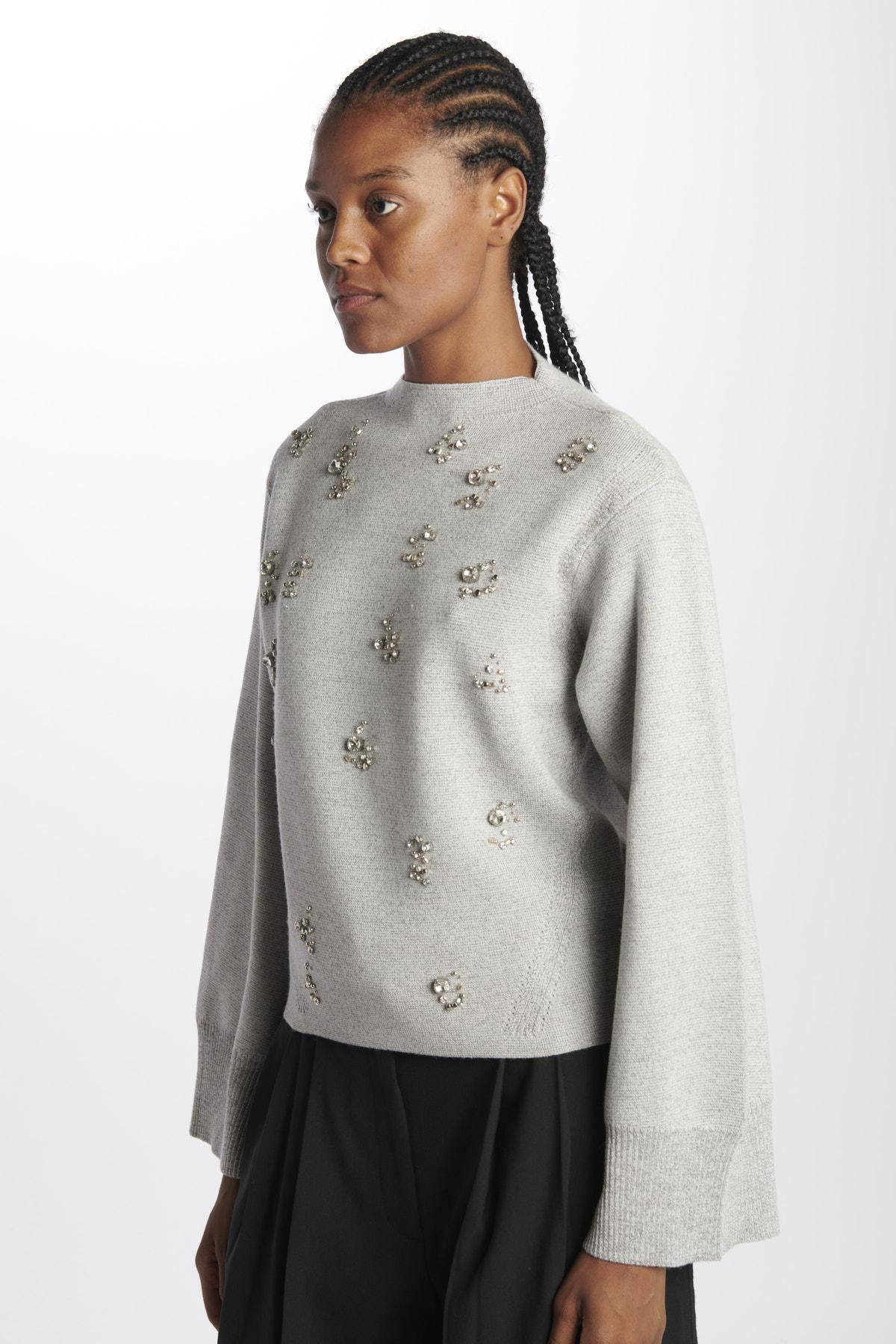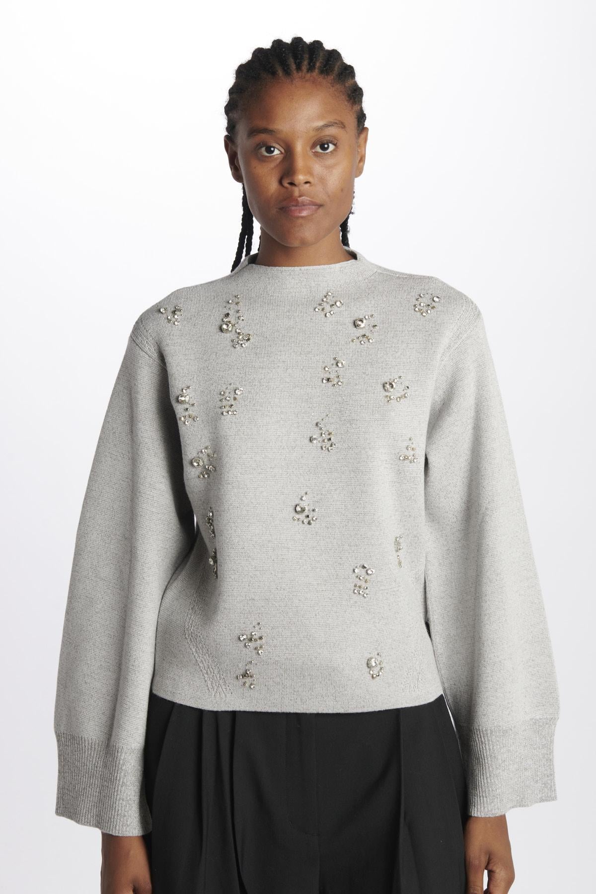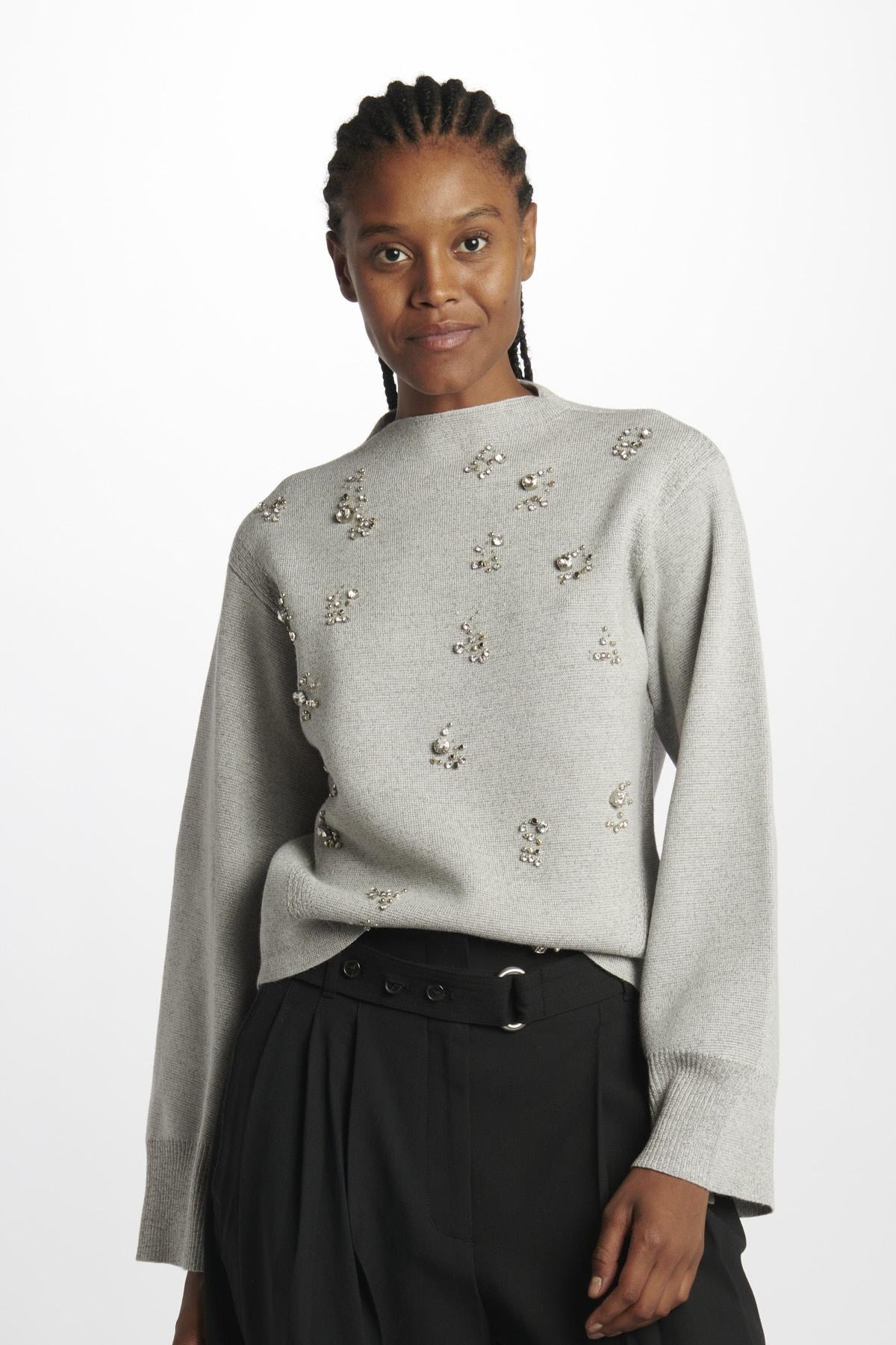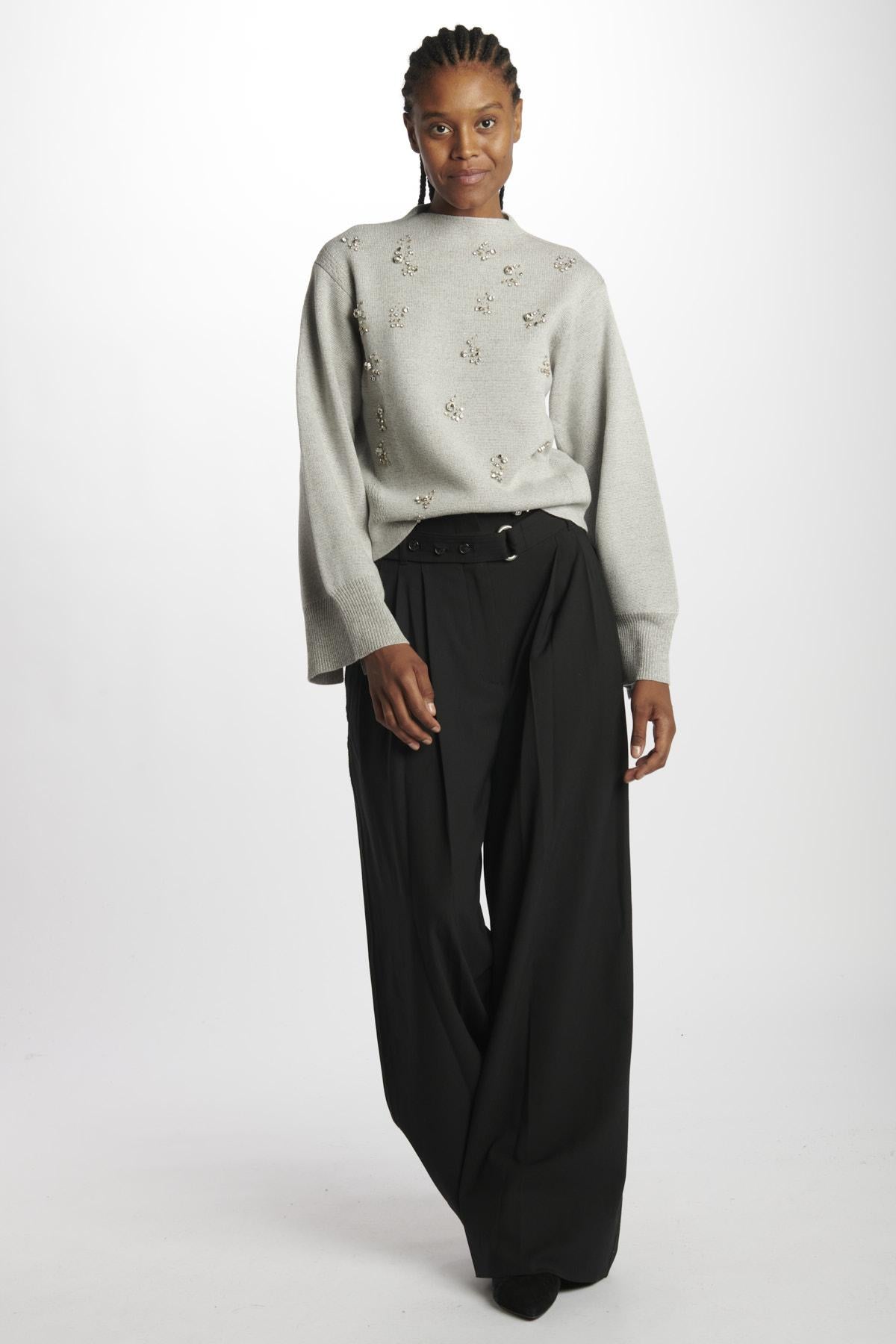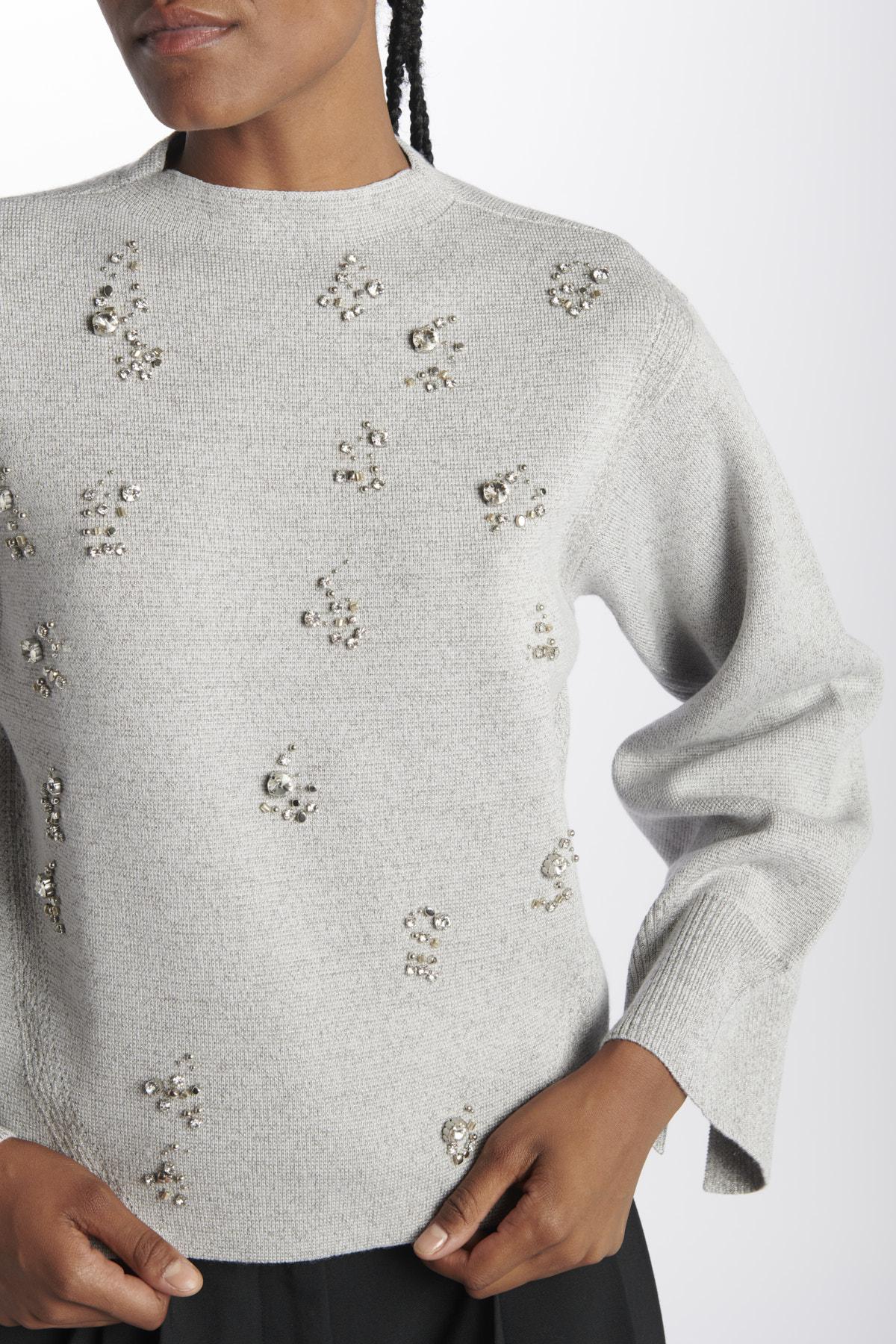 Maglia by Philip lim metallica dorata lurex e ricami. La modella è alta 174 cm e indossa la taglia 38. Composizione: 85% Lana, 9% Metallico, 6% Nylon.