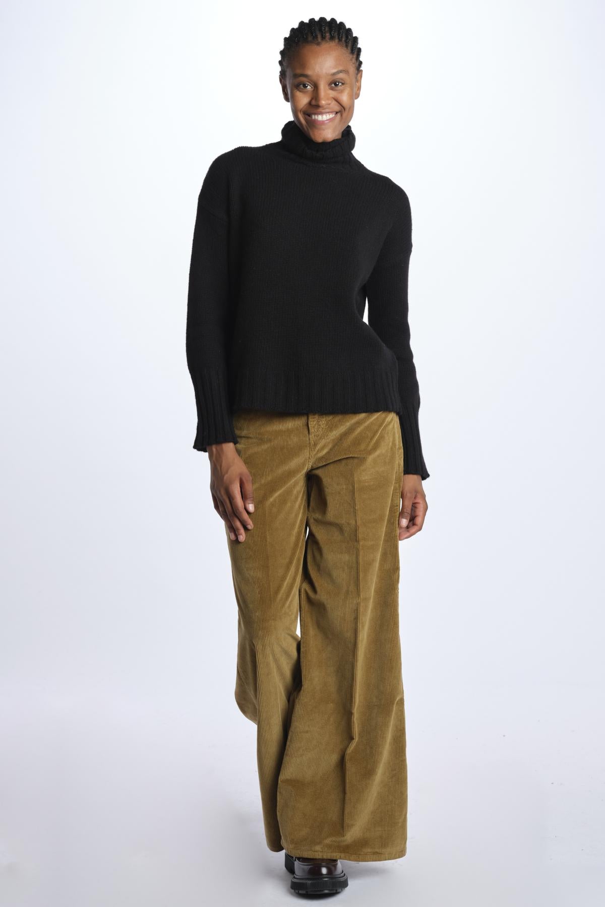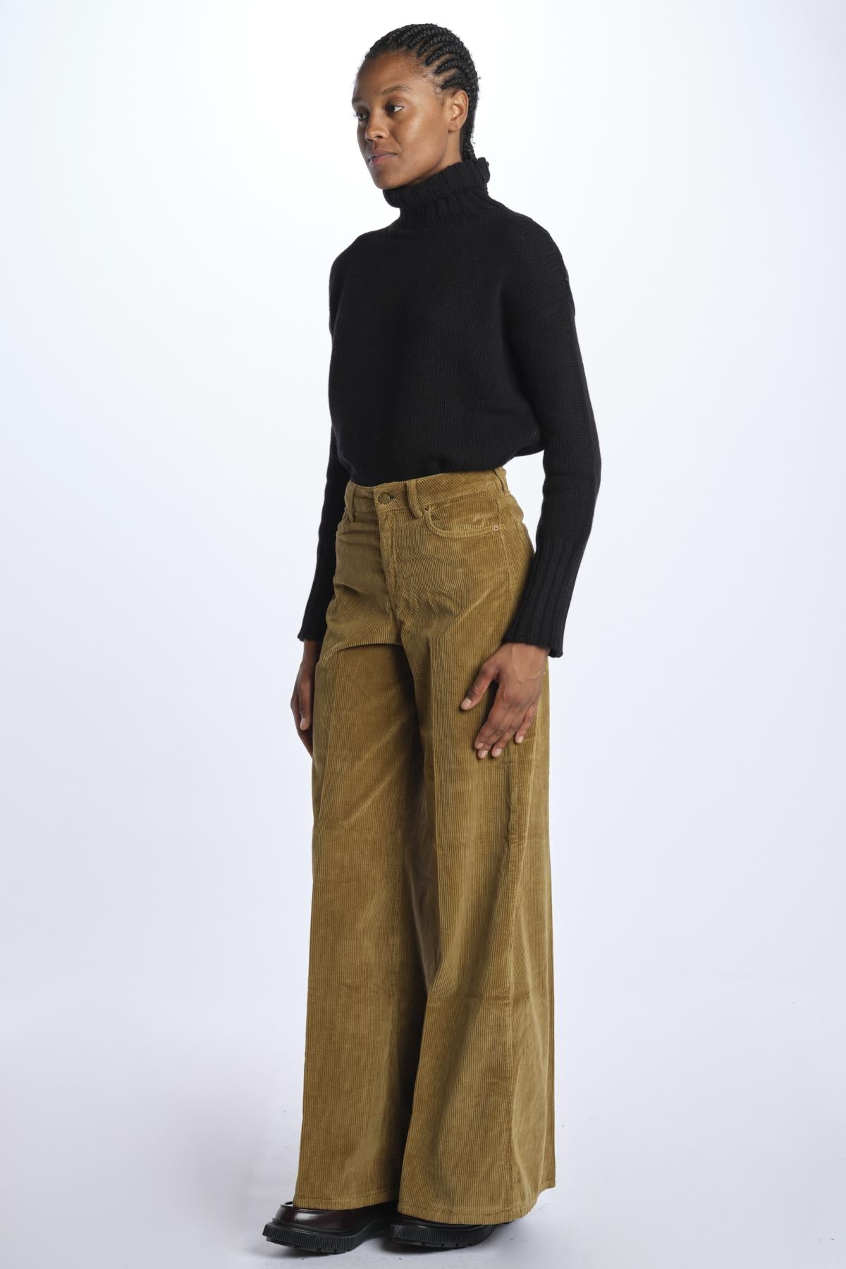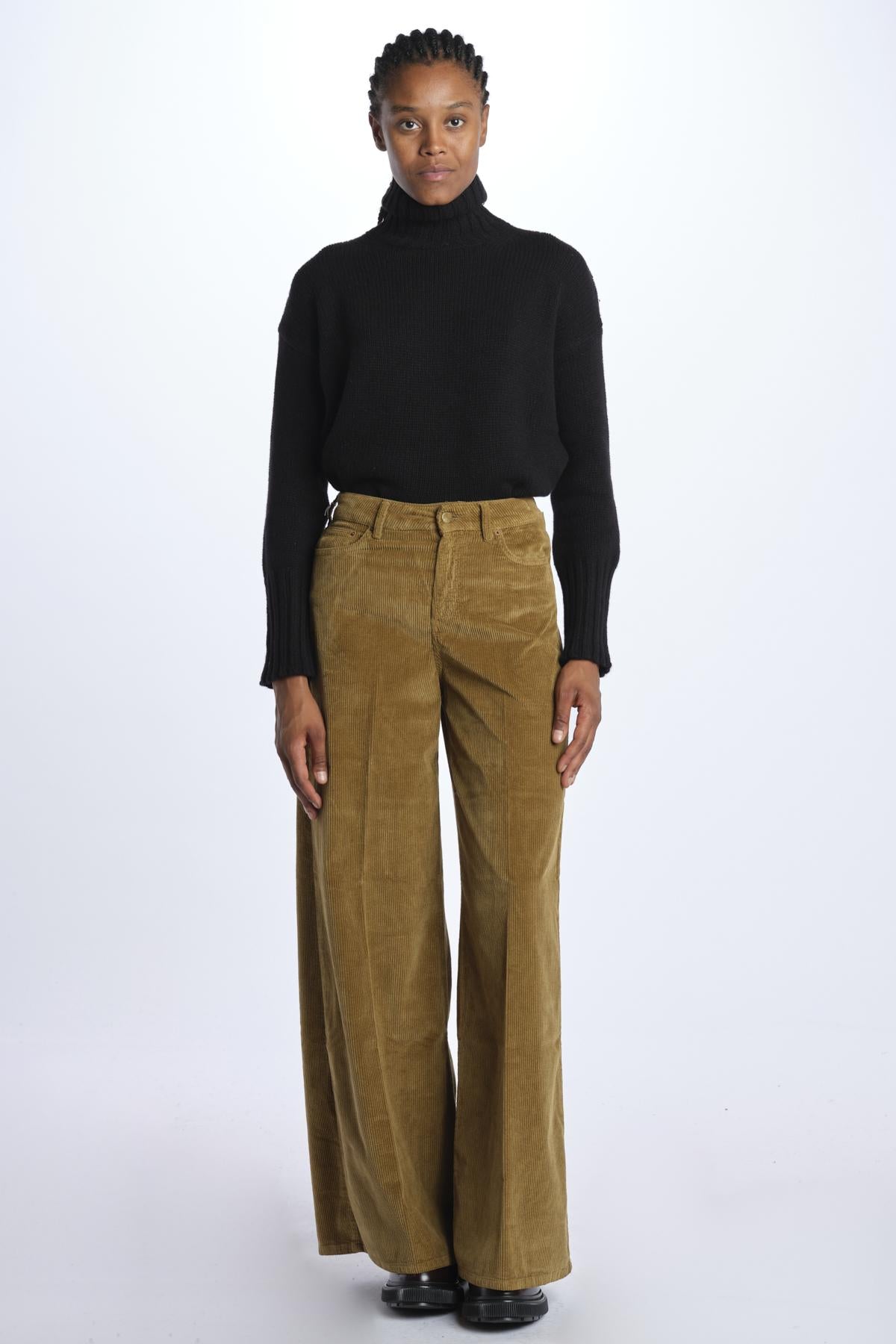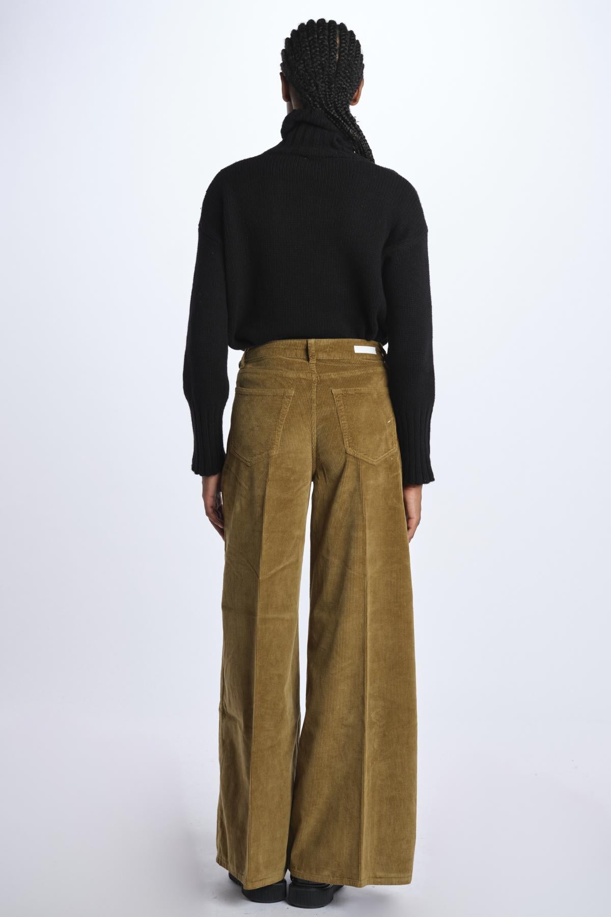 Pantalone SERENA by ps don't forget me over velluto 500 righine. La modella è alta 174 cm e indossa una 25. Composizione: 77% cotone, 22% lycra, 1% elastane.