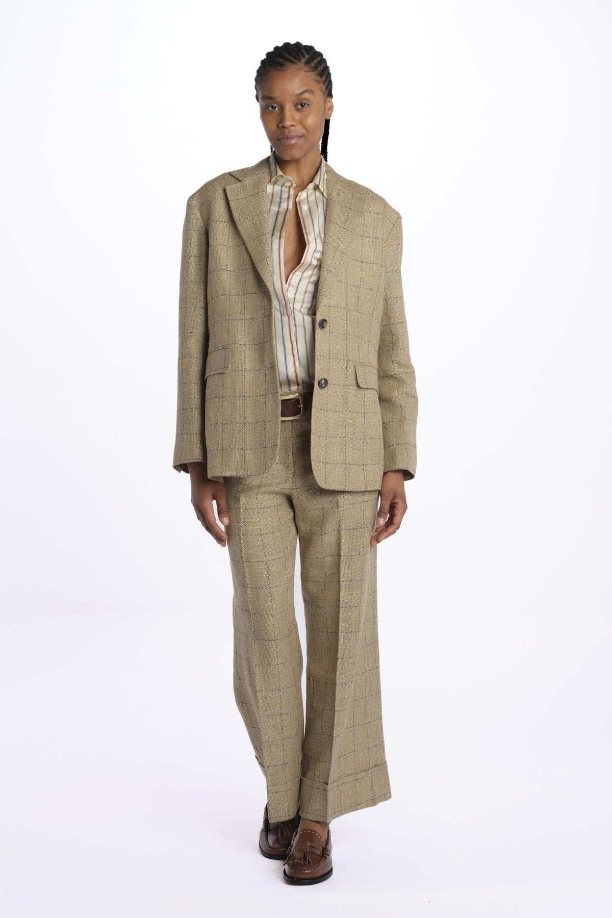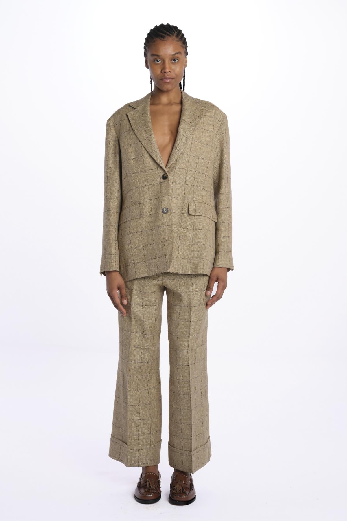 Blazer BECKY check by quelledue. La modella è alta 174 cm e indossa una taglia 38. Composizione: 59% lana, 40% lino, 1% poliammidica.