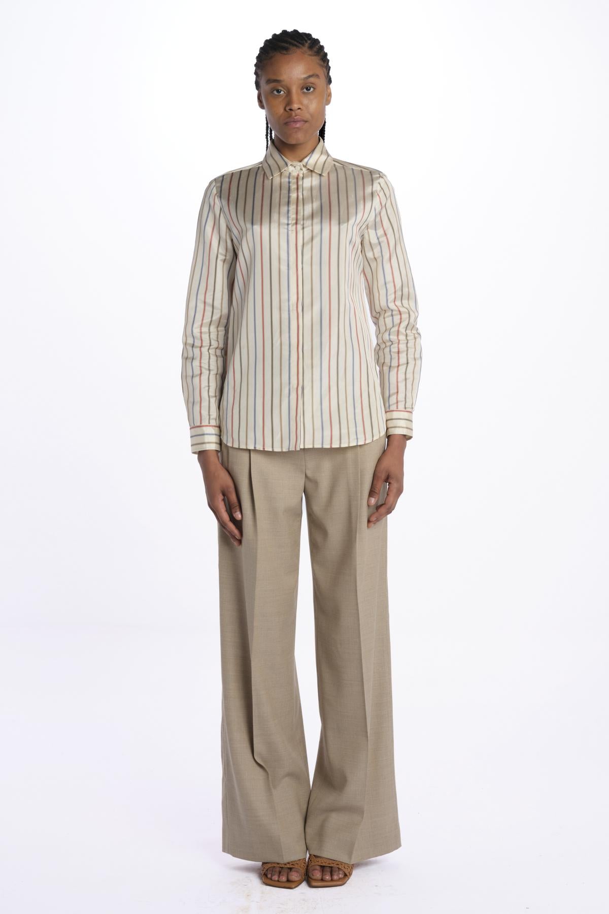 Camicia GIULIA righe by quelledue. La modella è alta 174 cm e indossa una taglia 38. Composizione: 100% seta.