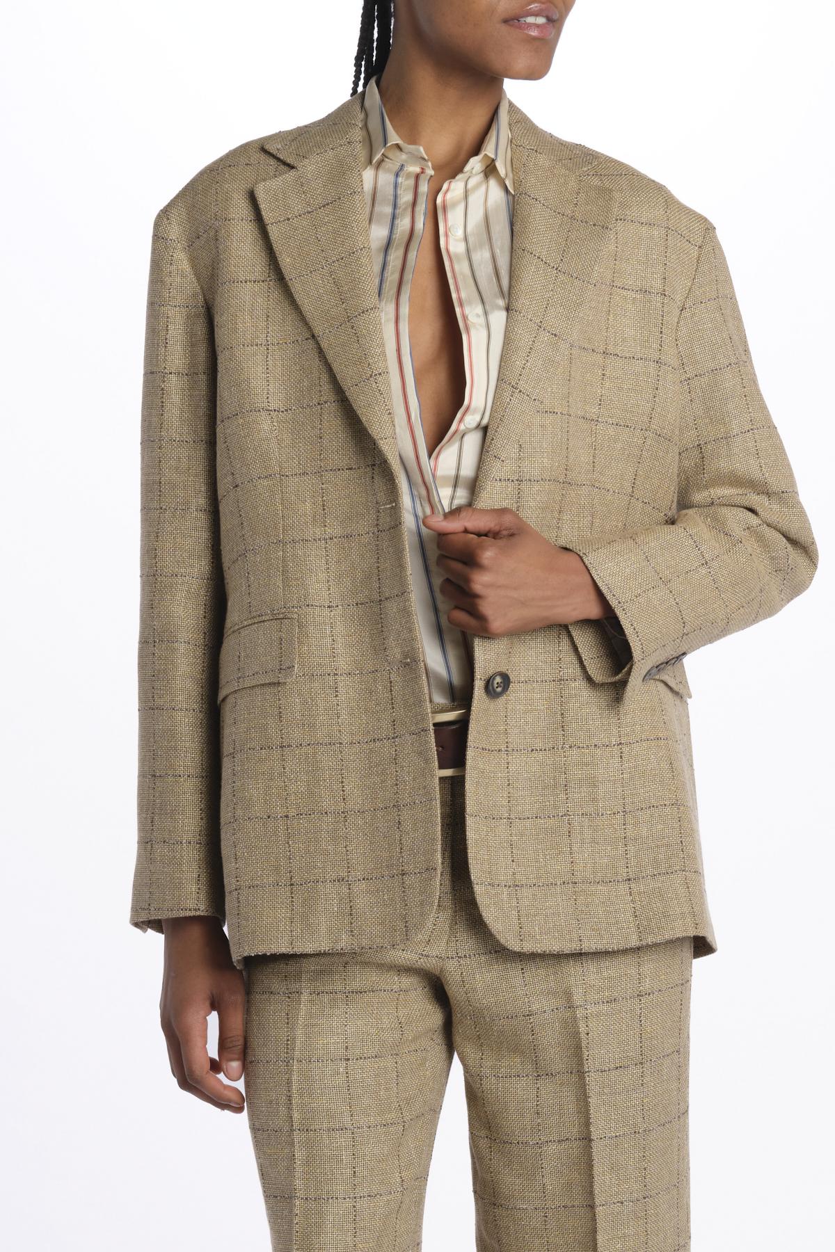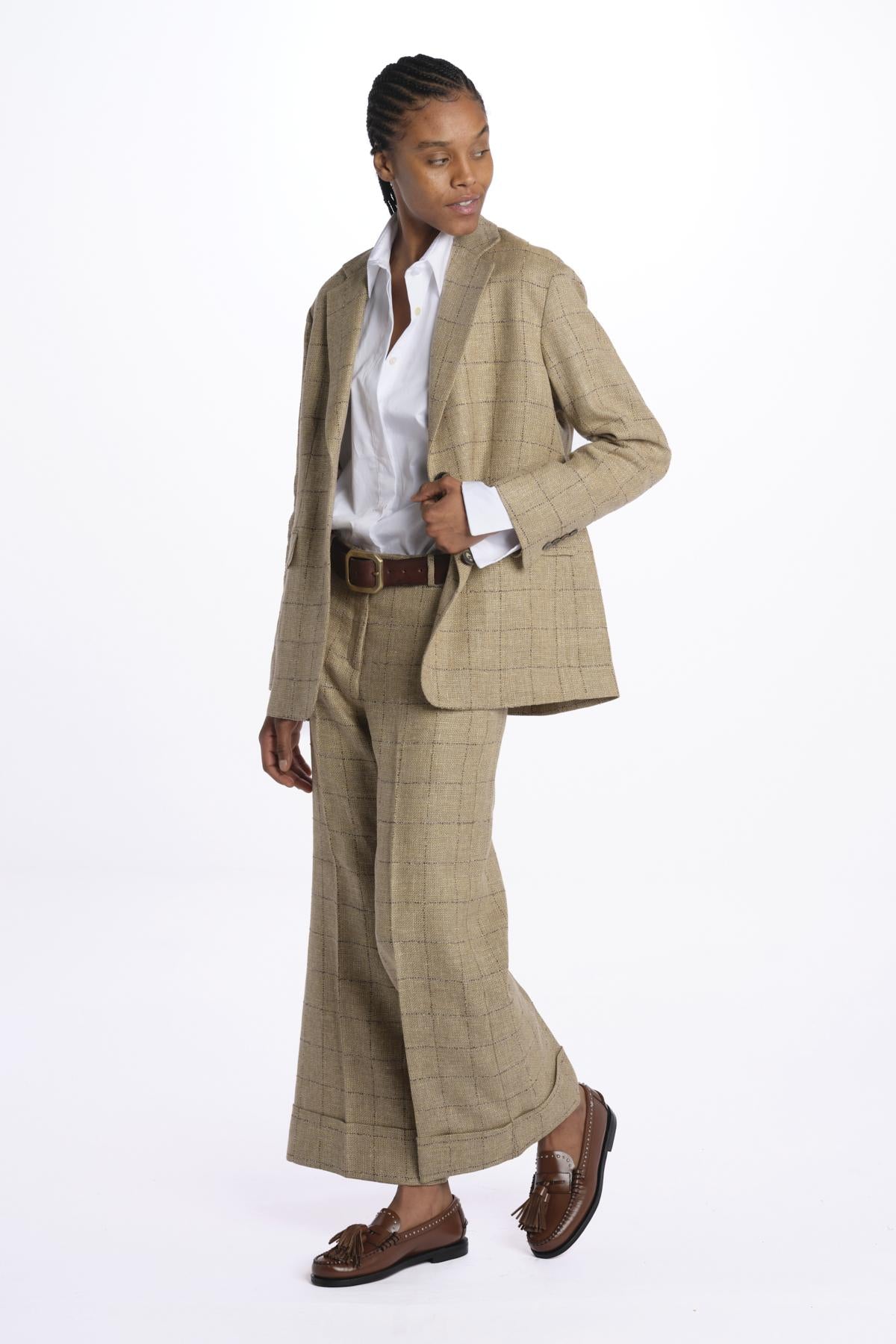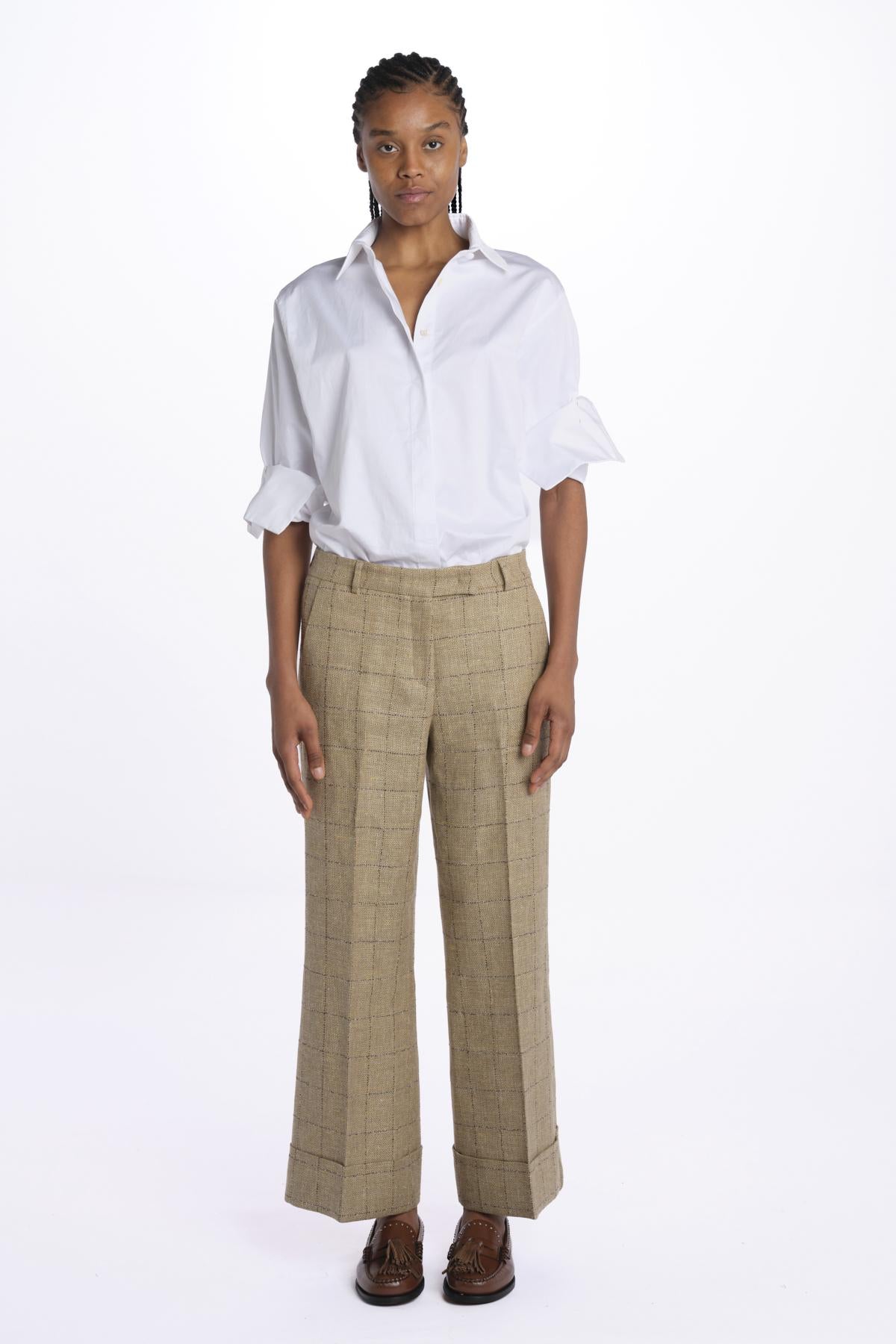 Pantalone MELODIA check by quelledue. La modella è alta 174 cm e indossa una taglia 38. Composizione: 59% lana, 40% lino, 1% poliammidica.
