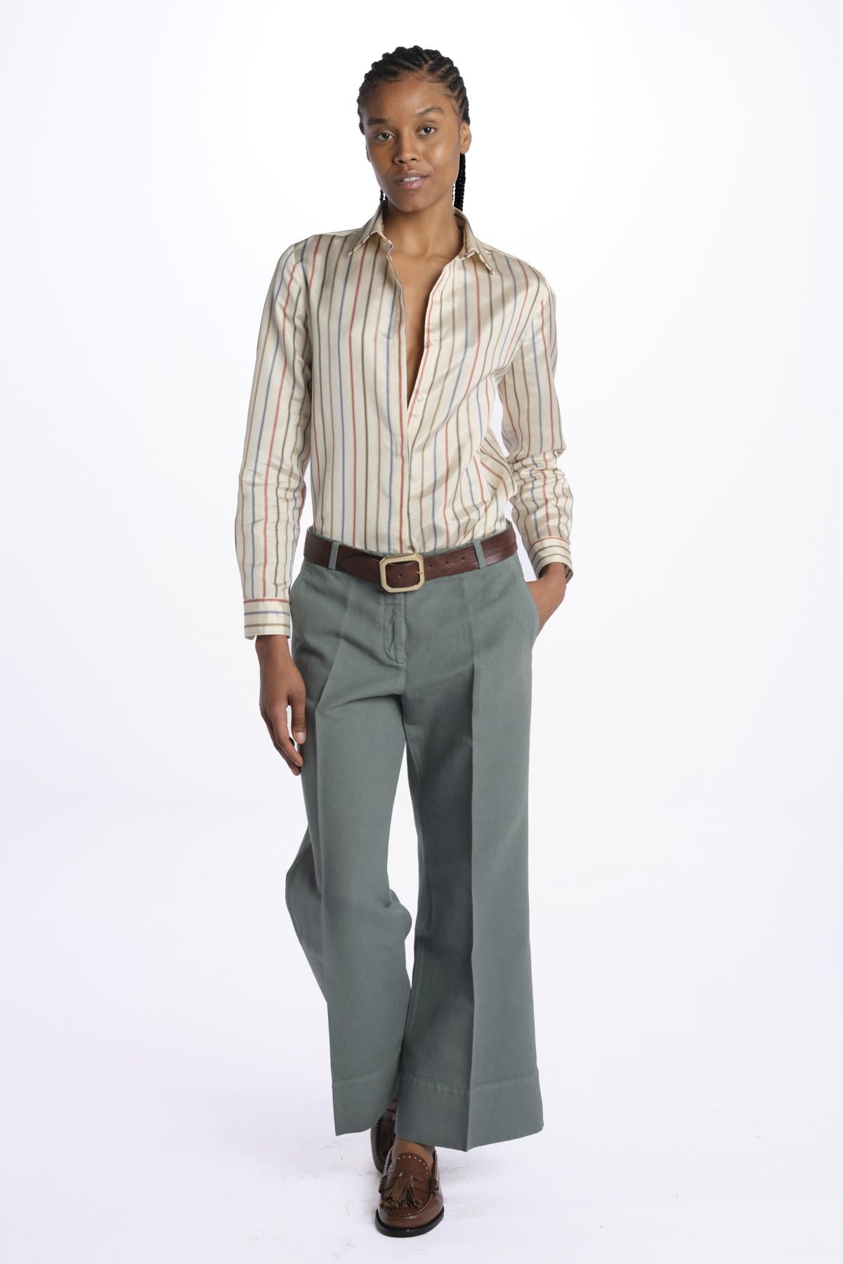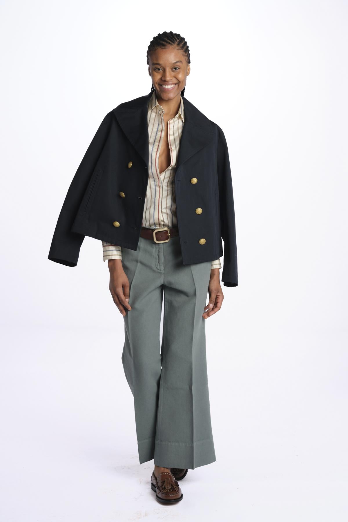 Pantalone MELODY D cropped canvas tinto capo by quelledue. La modella è alta 174 cm e indossa una taglia 38. Composizione: 60% lino, 40% cotone.