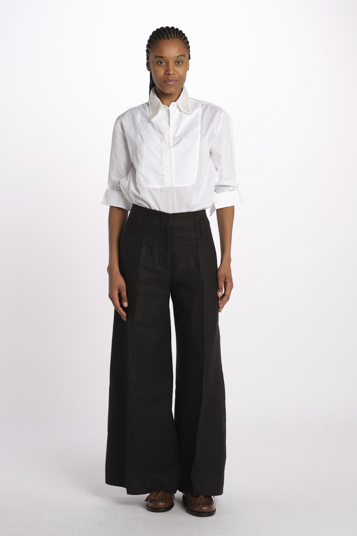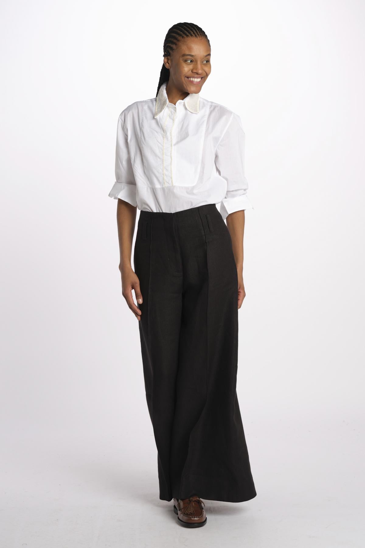 Pantalone ORIANA cropped nervature by quelledue. La modella è alta 174 cm e indossa una taglia 40. Composizione: 100% cotone.