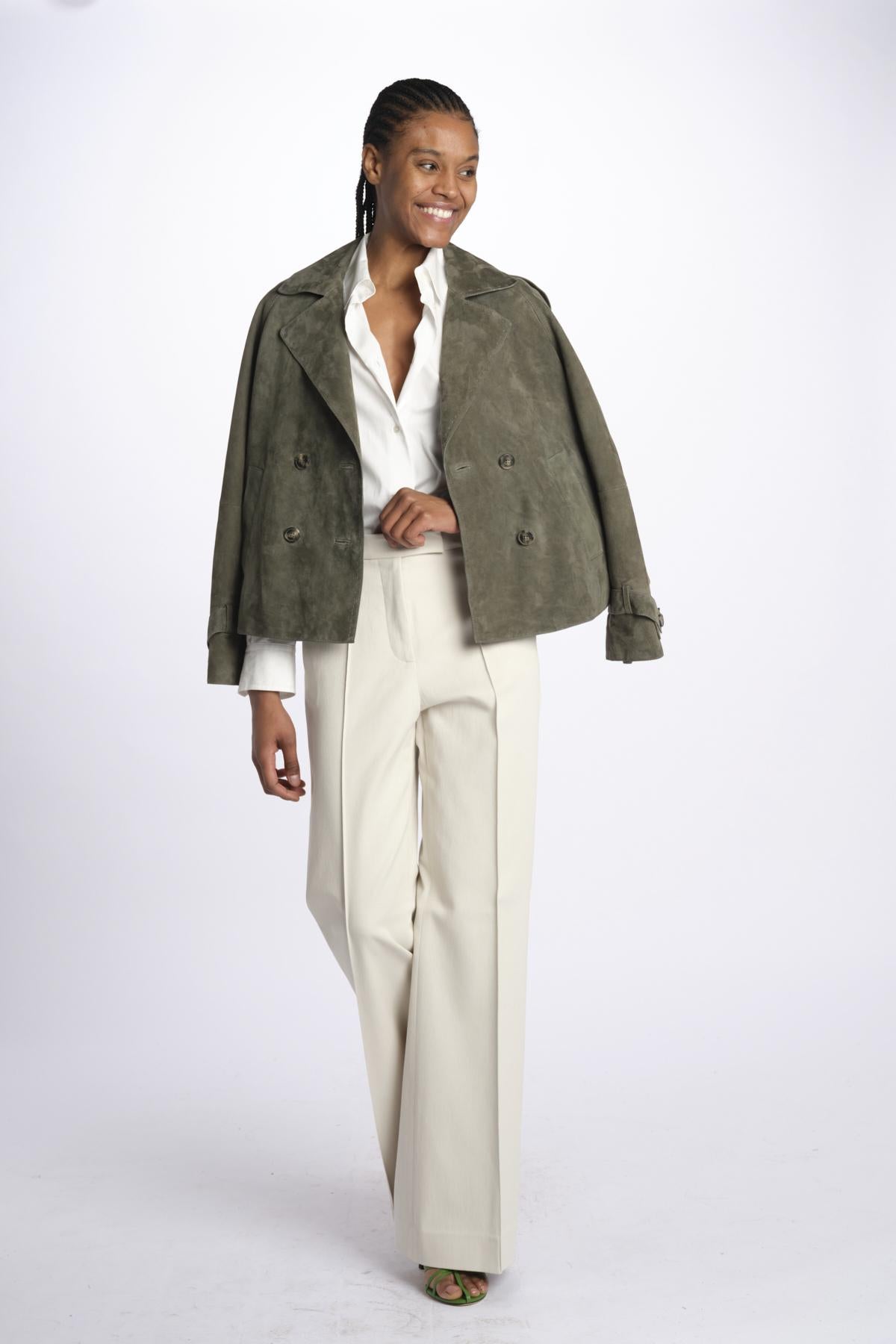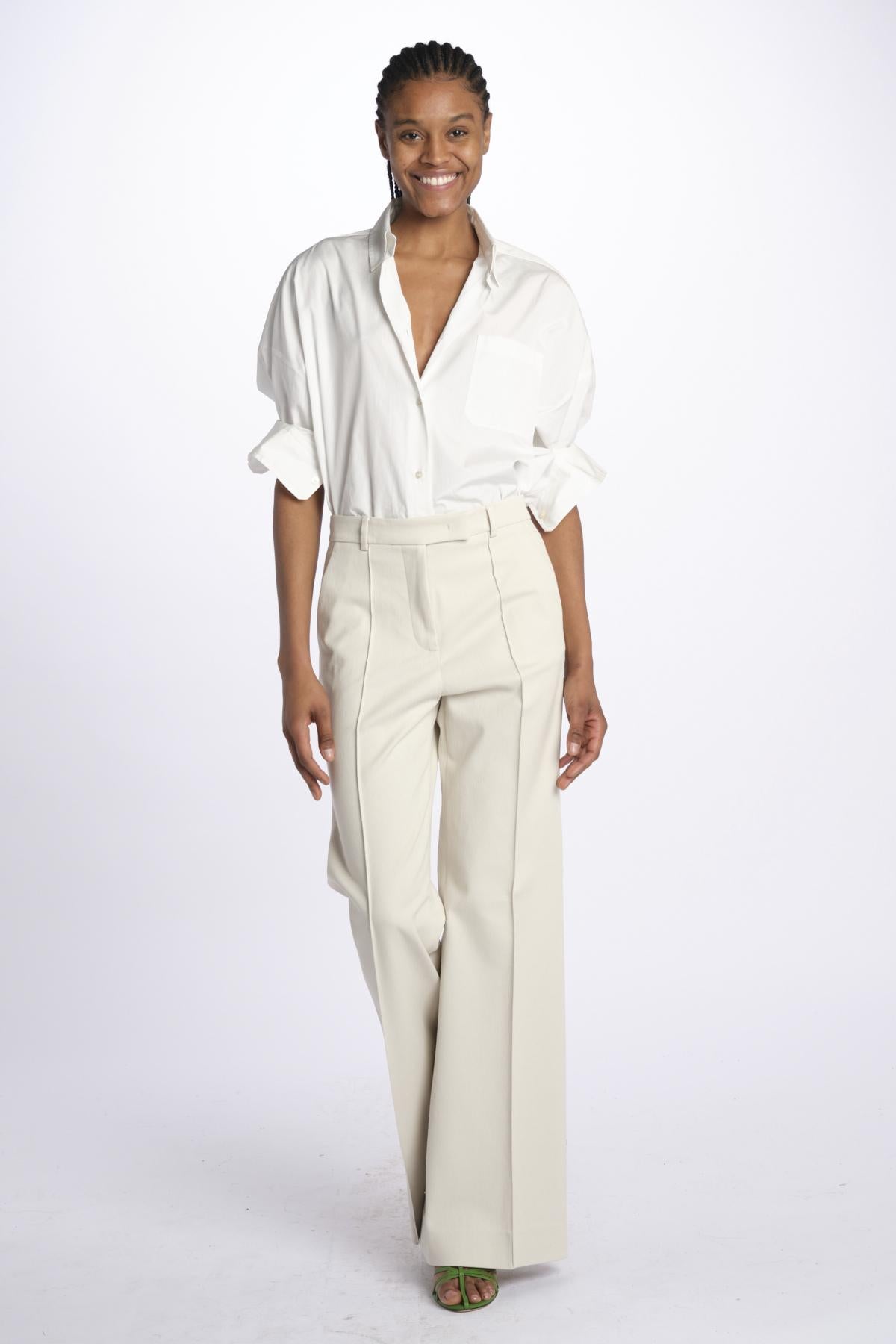 Pantalone OTTAVIA nervature lungo by quelledue. La modella è alta 174 cm e indossa una taglia 40. Composizione: 98% cotone, 2% elastane.