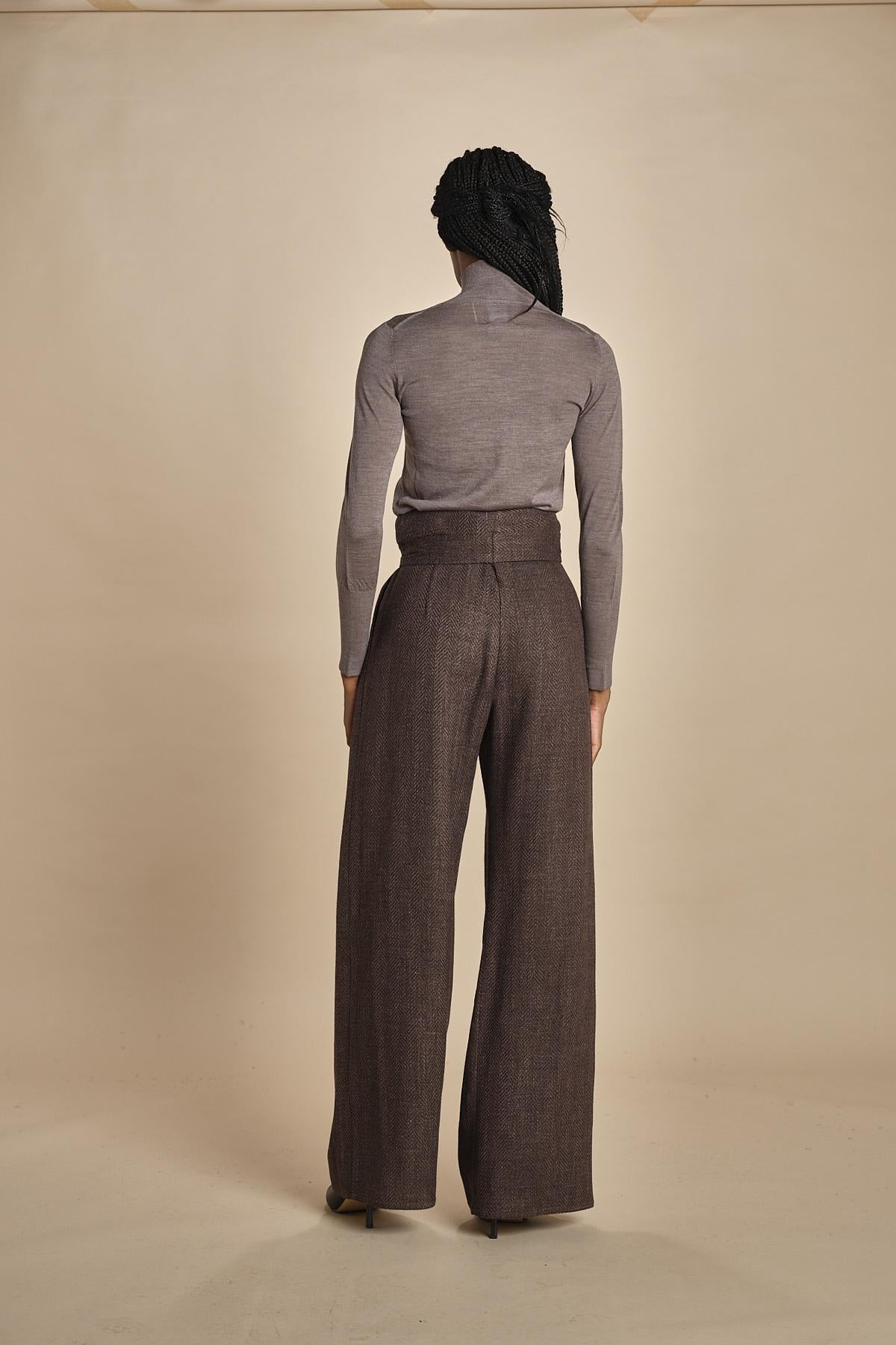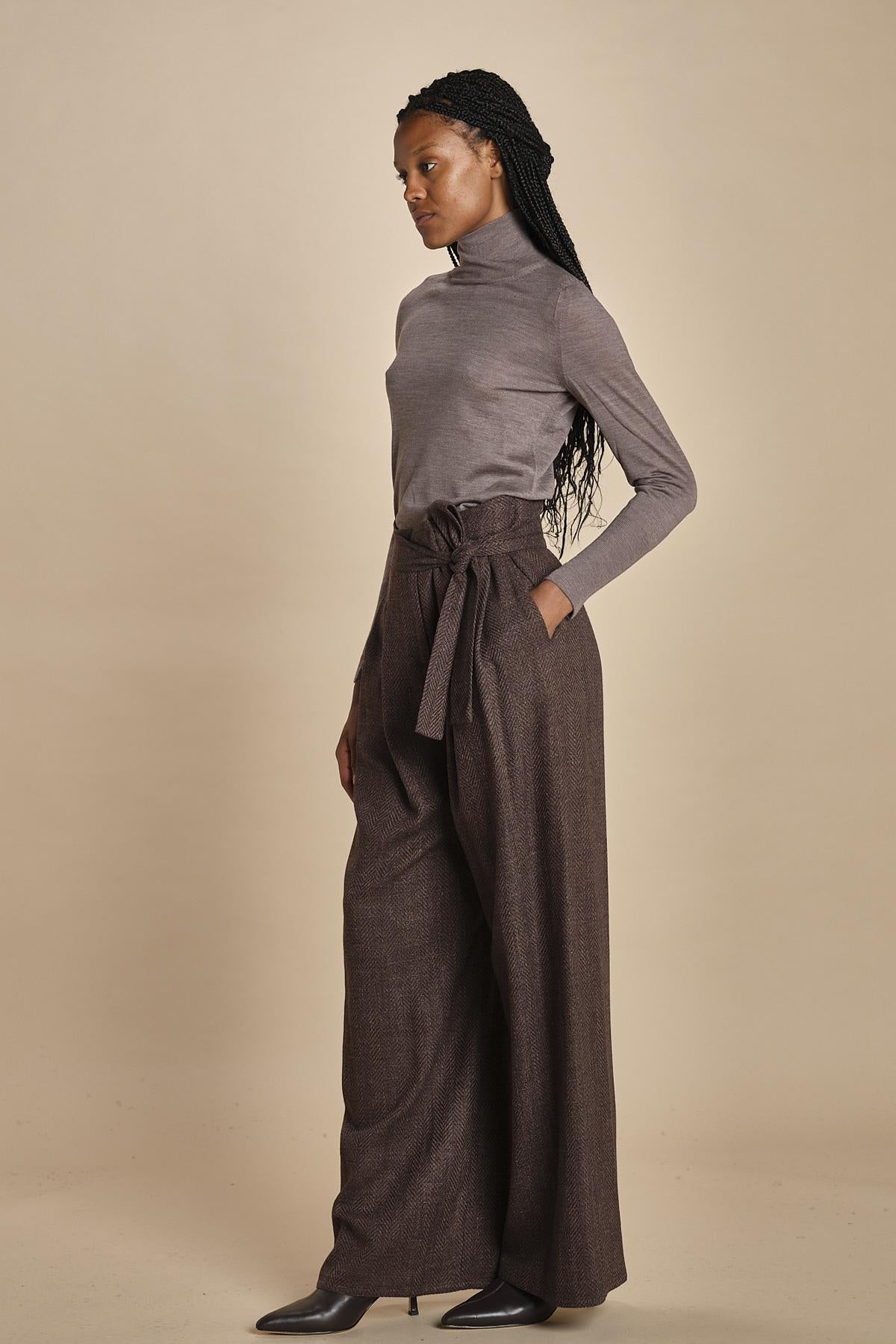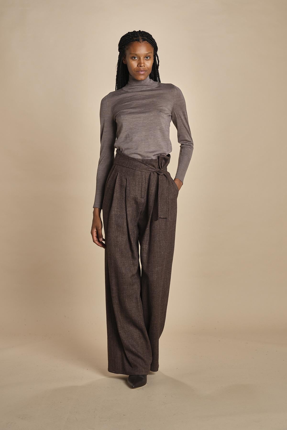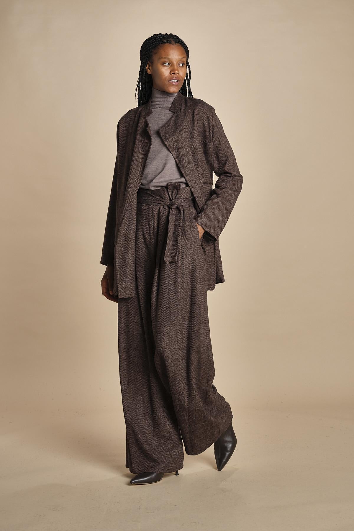 pantalone spigato by dusan. La modella è alta 174 cm e indossa una taglia S. Composizione: 100% lana.