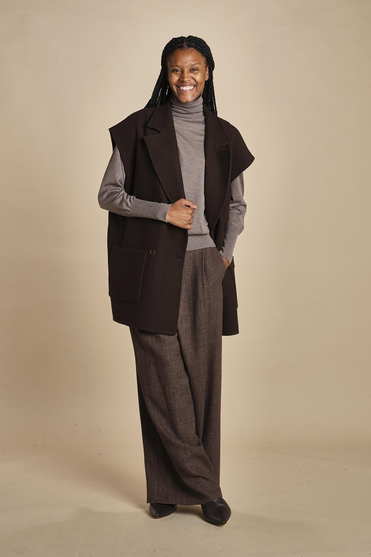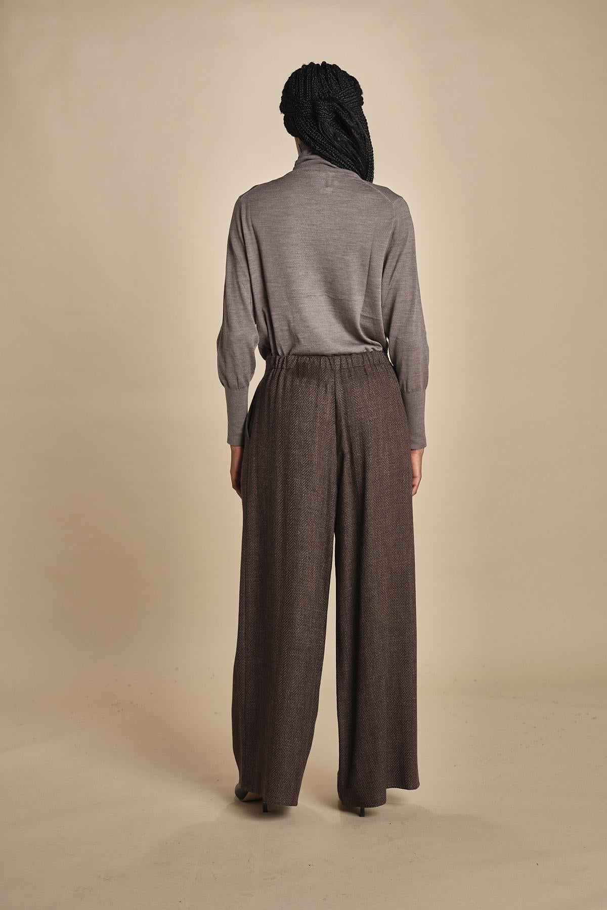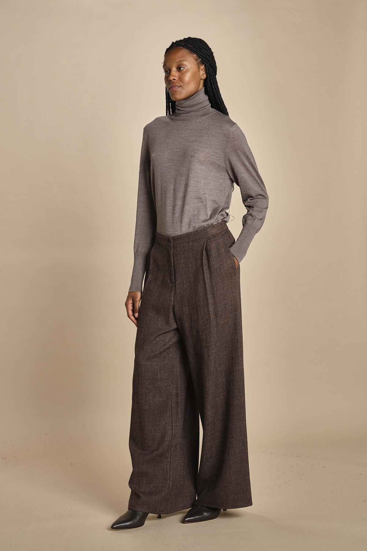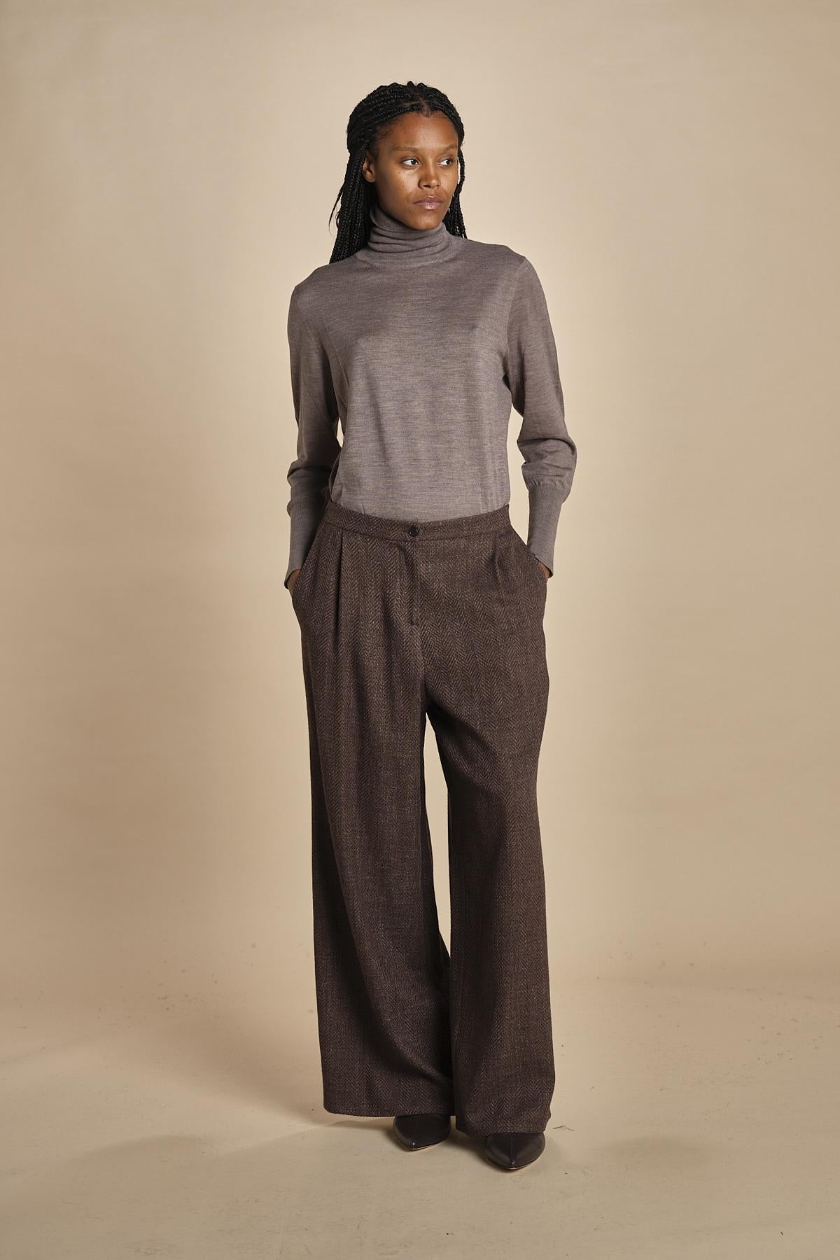 pantalone spigato by dusan. La modella è alta 174 cm e indossa una taglia S. Composizione: 40% lana vergine, 30% seta, 20% lino, 10% cotone.