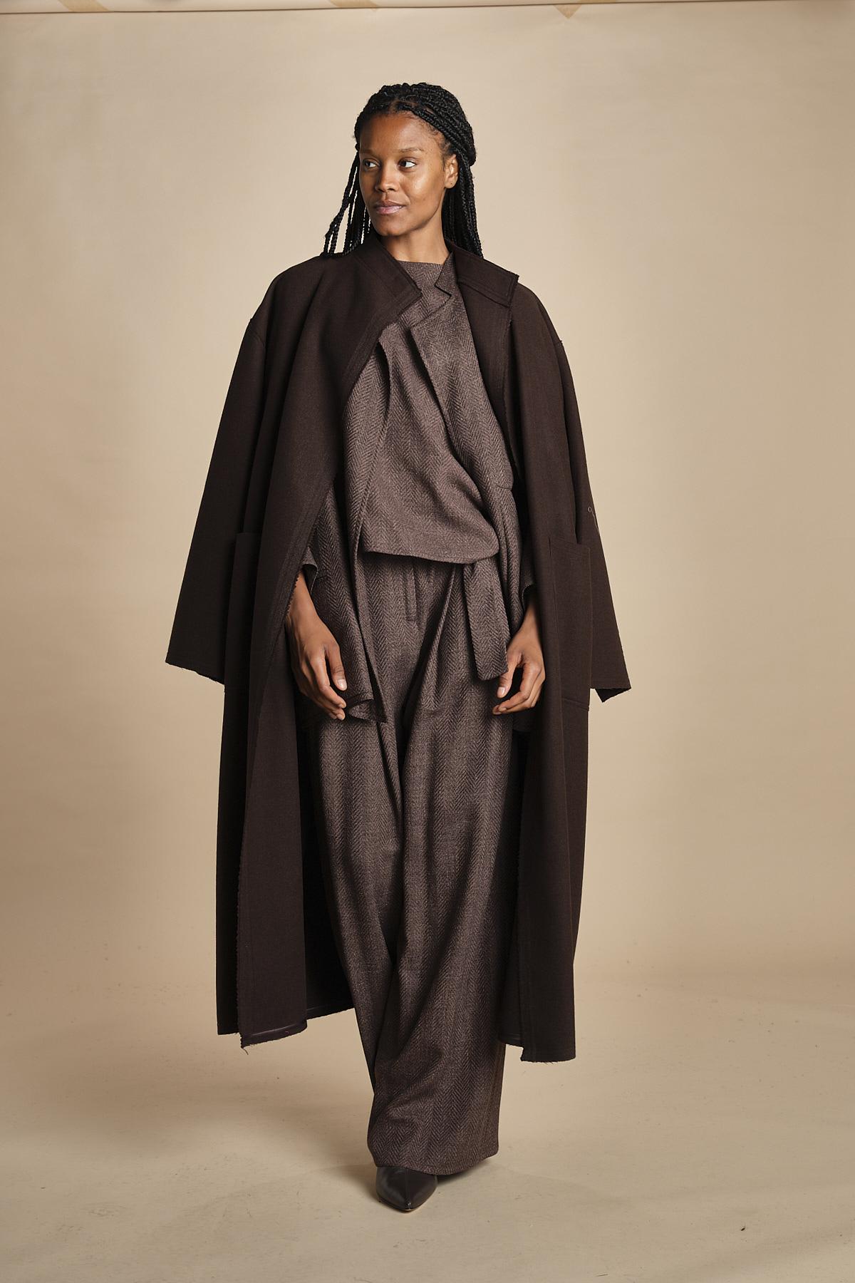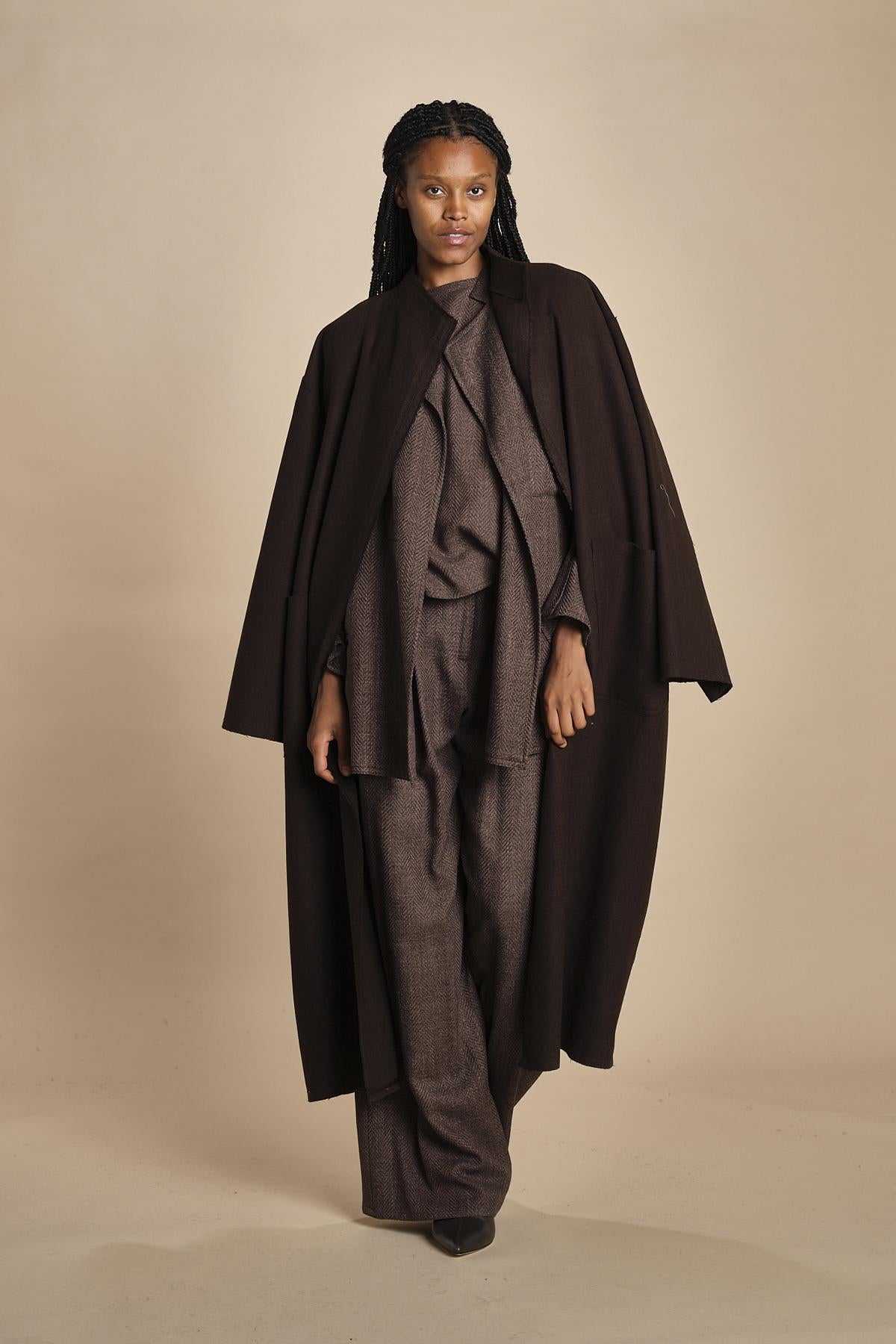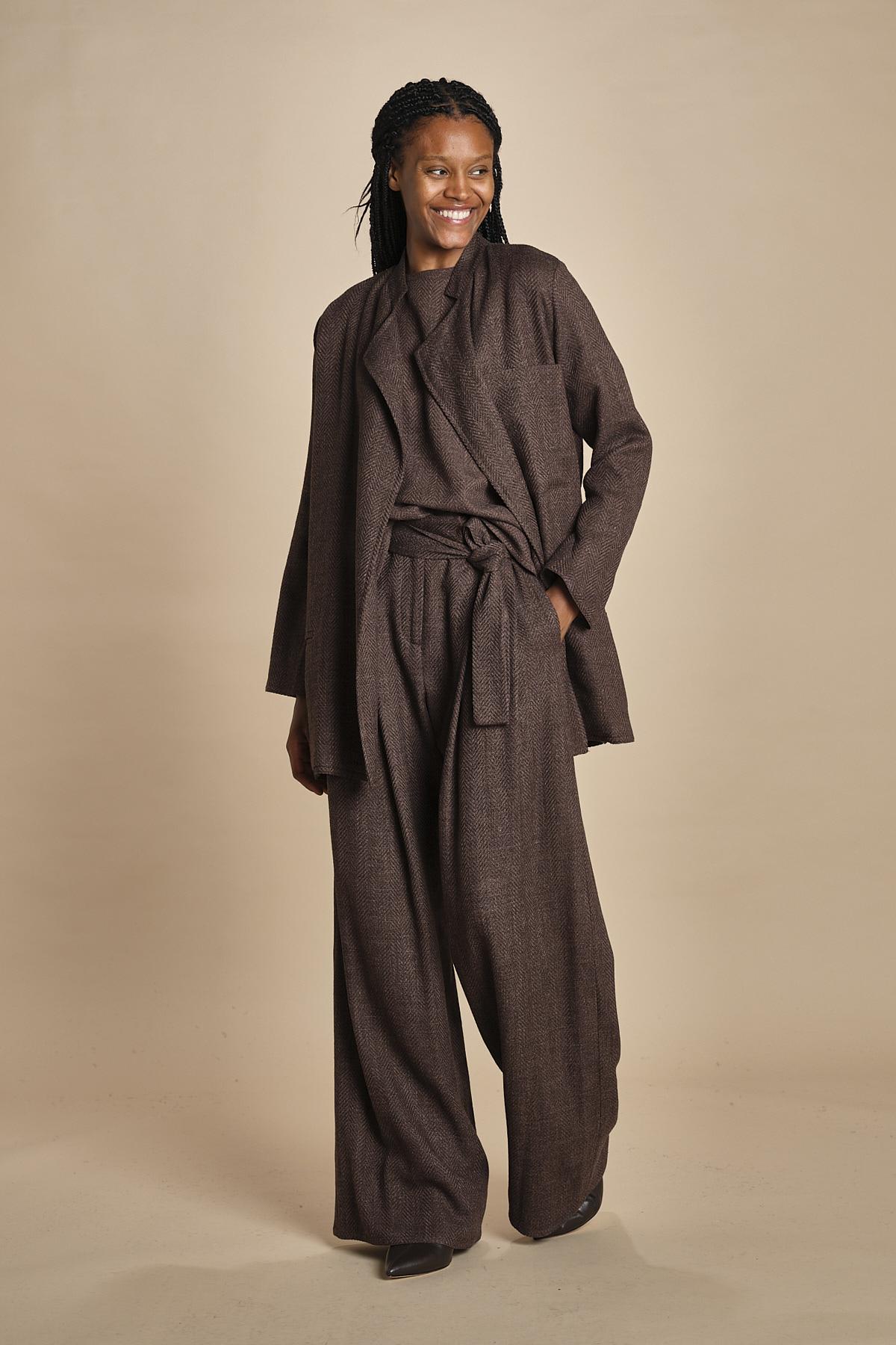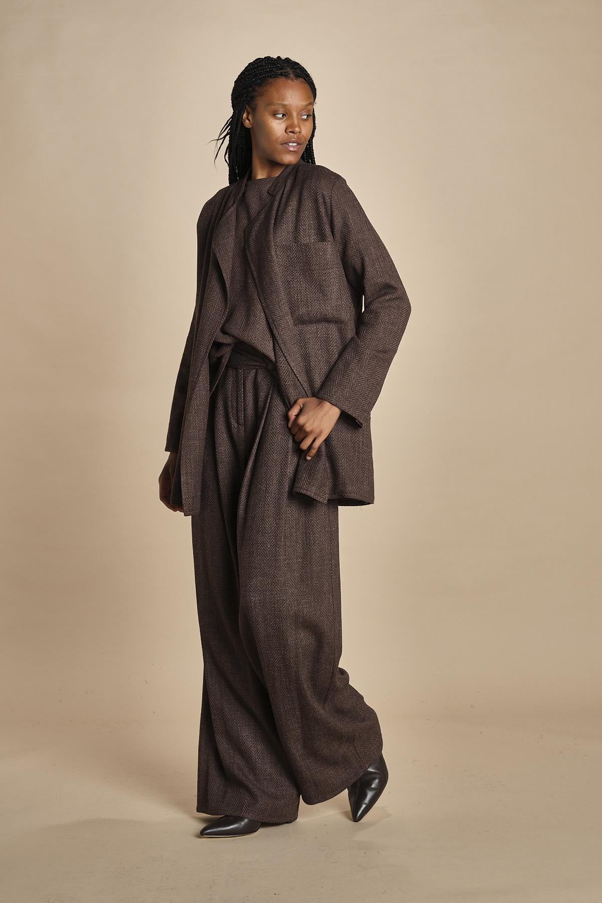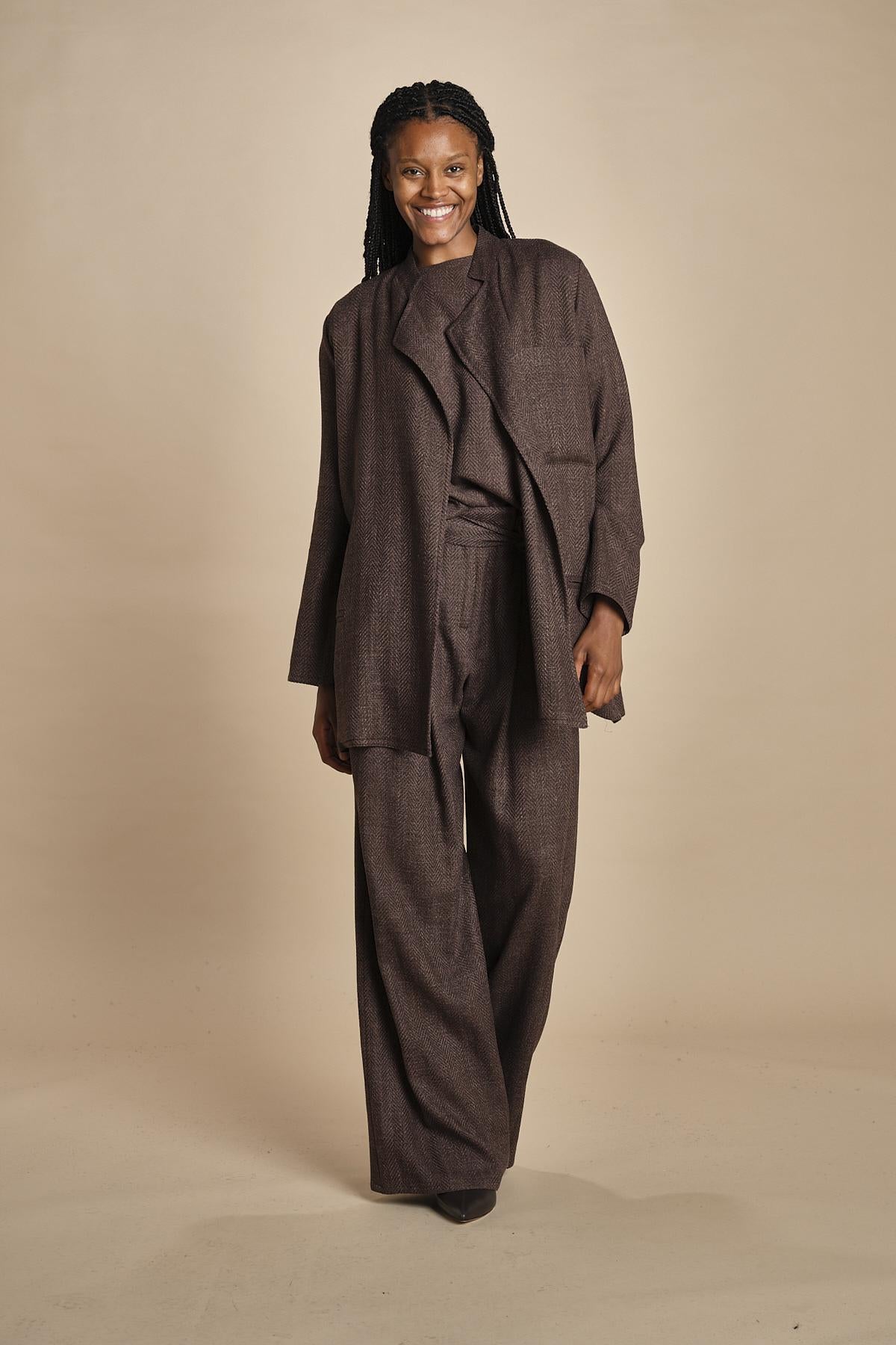 giacca spigata by dusan. La modella è alta 174 cm e indossa una taglia S. Composizione: 40% lana vergine, 30% seta, 20% lino, 10% cotone.