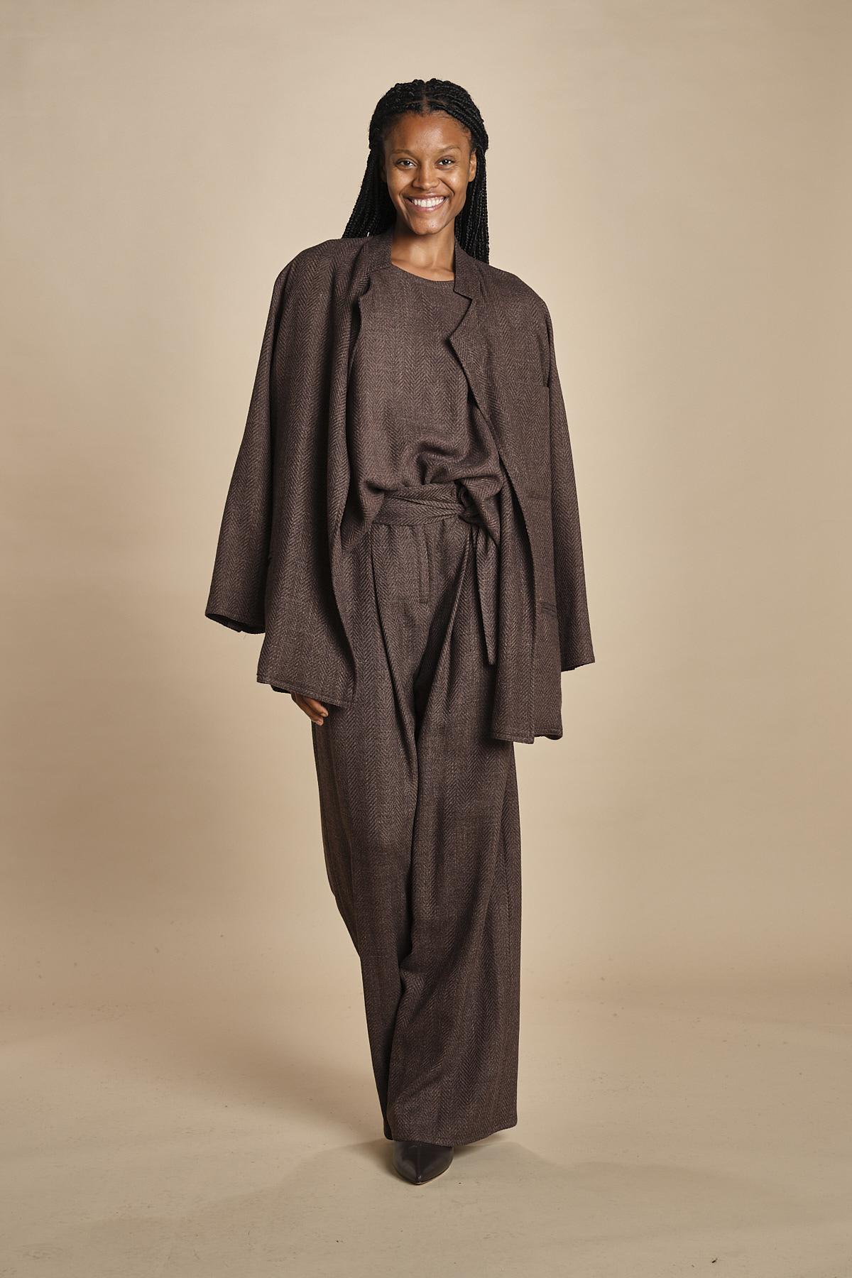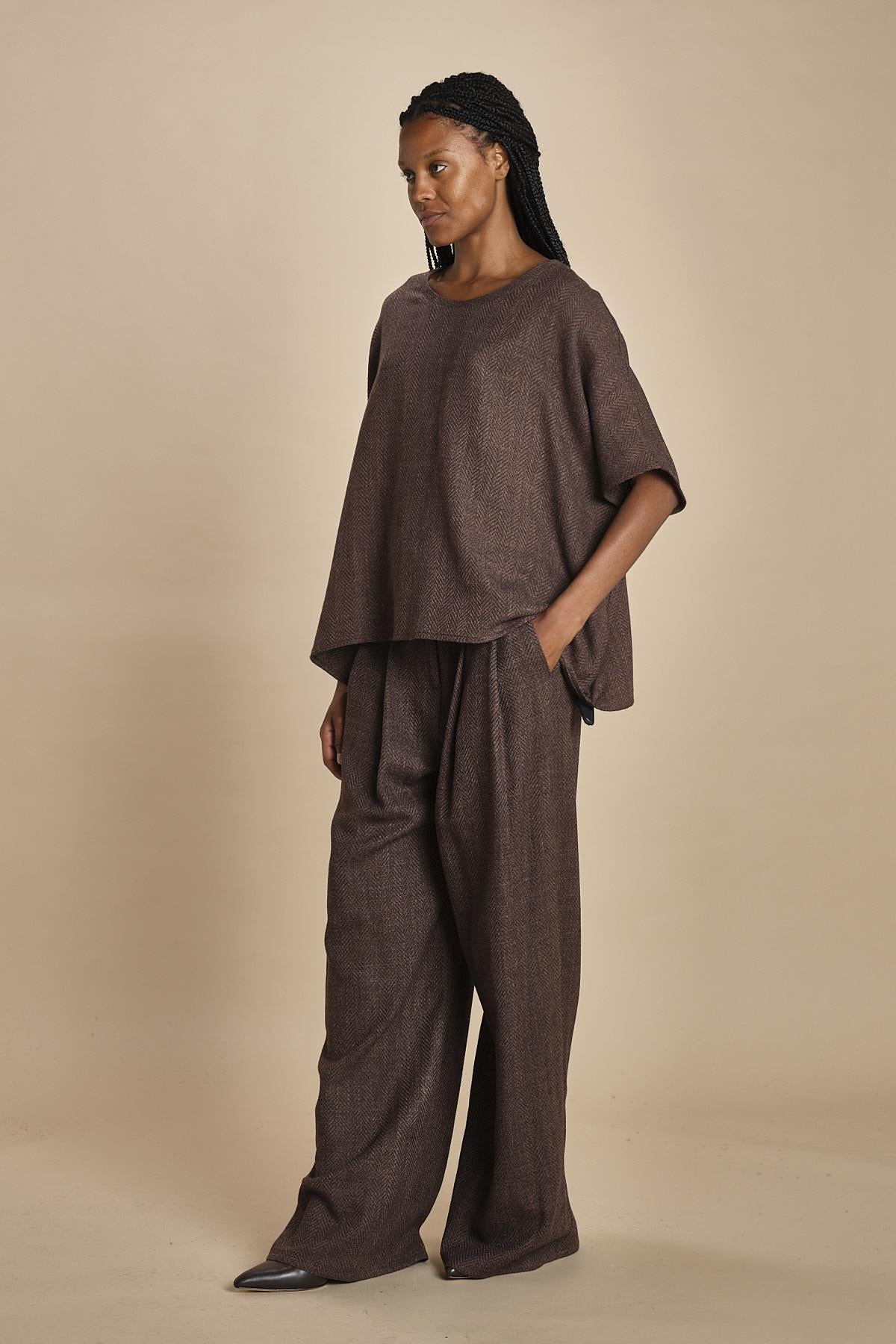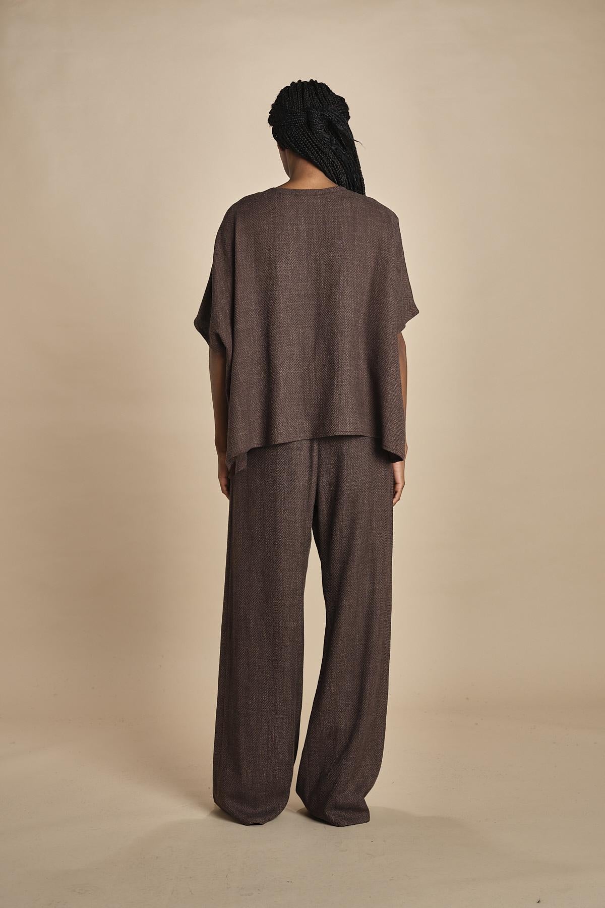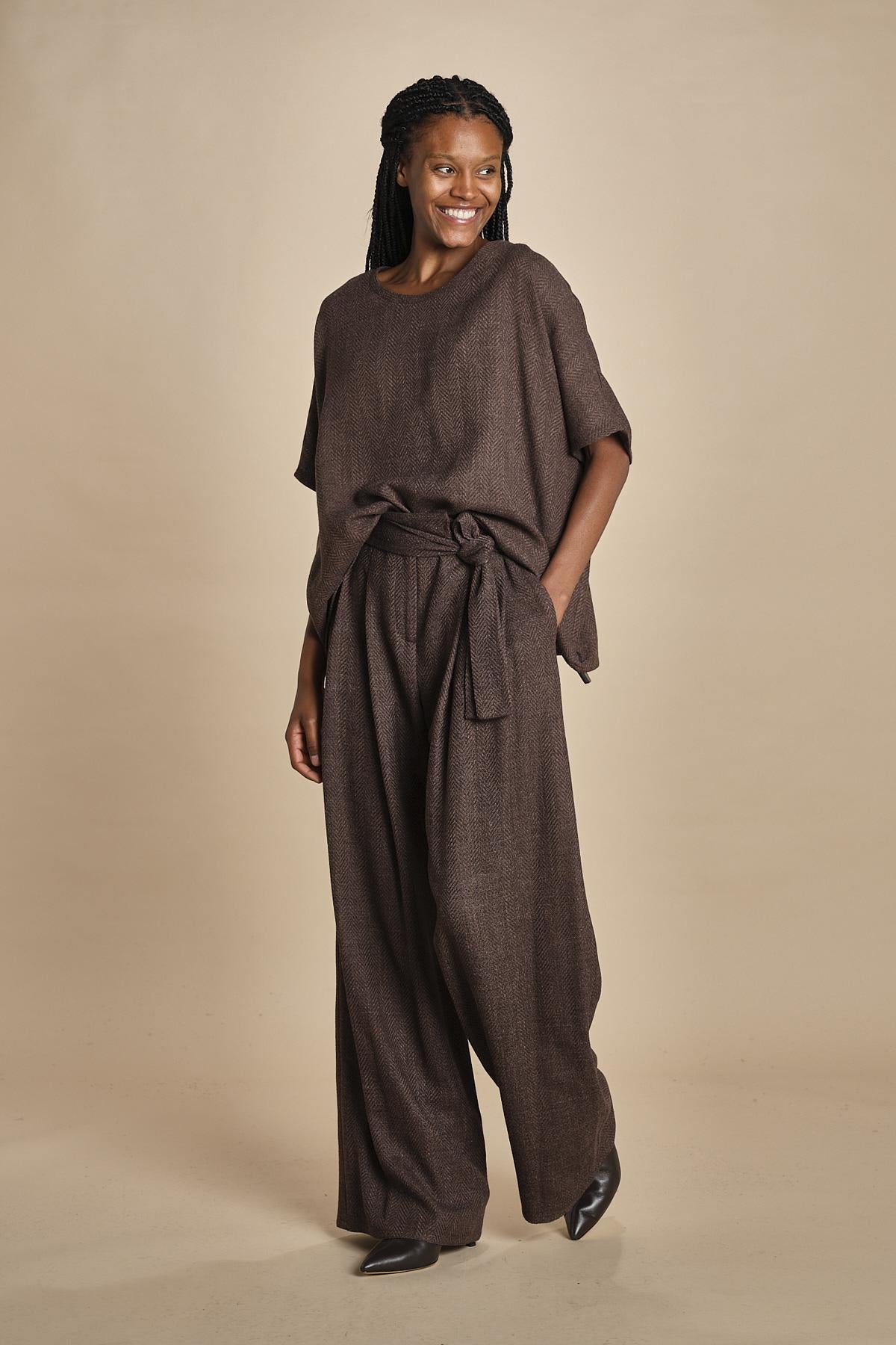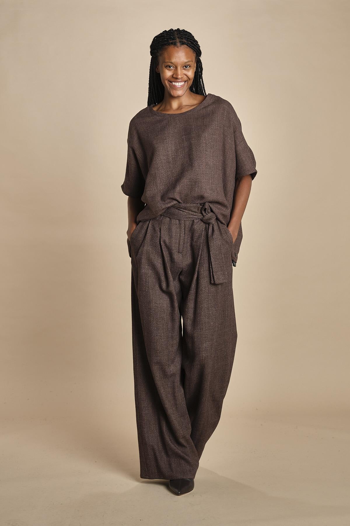 t.shirt easy spigata by dusan. La modella è alta 174 cm e indossa una taglia S. Composizione: 40% lana vergine, 30% seta, 20% lino, 10% cotone.