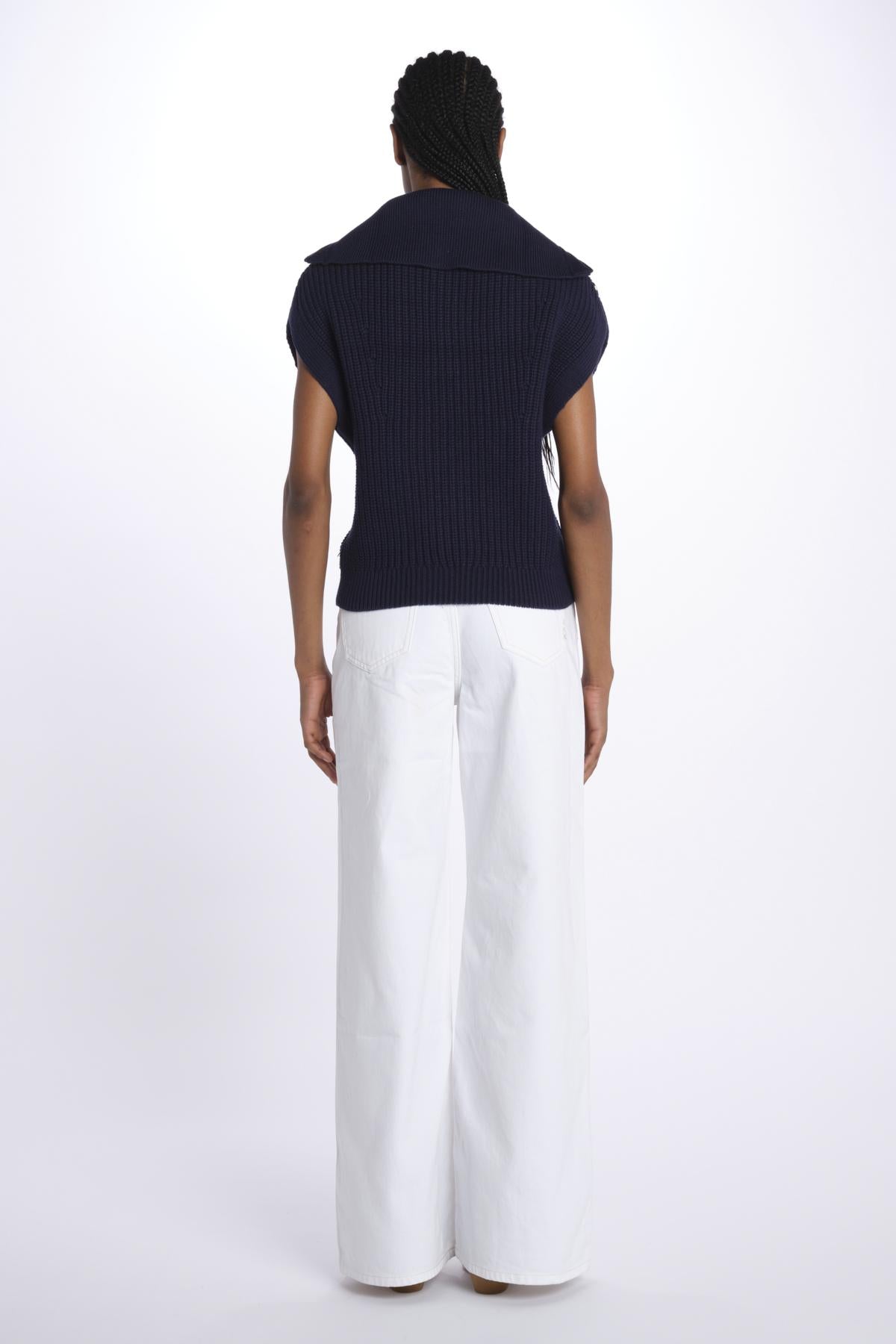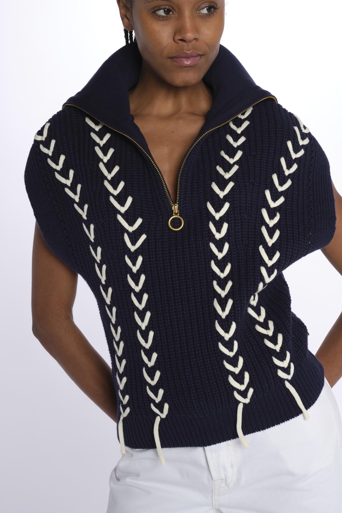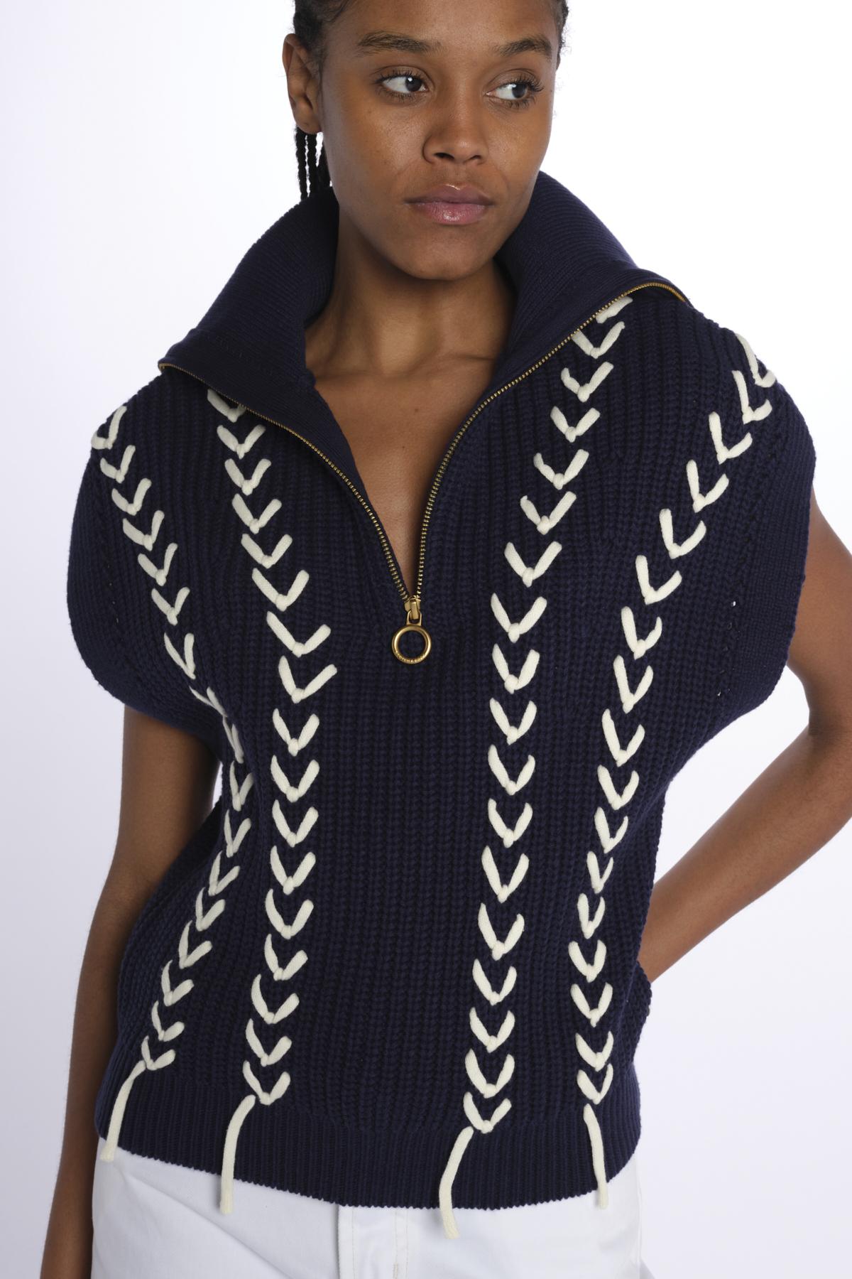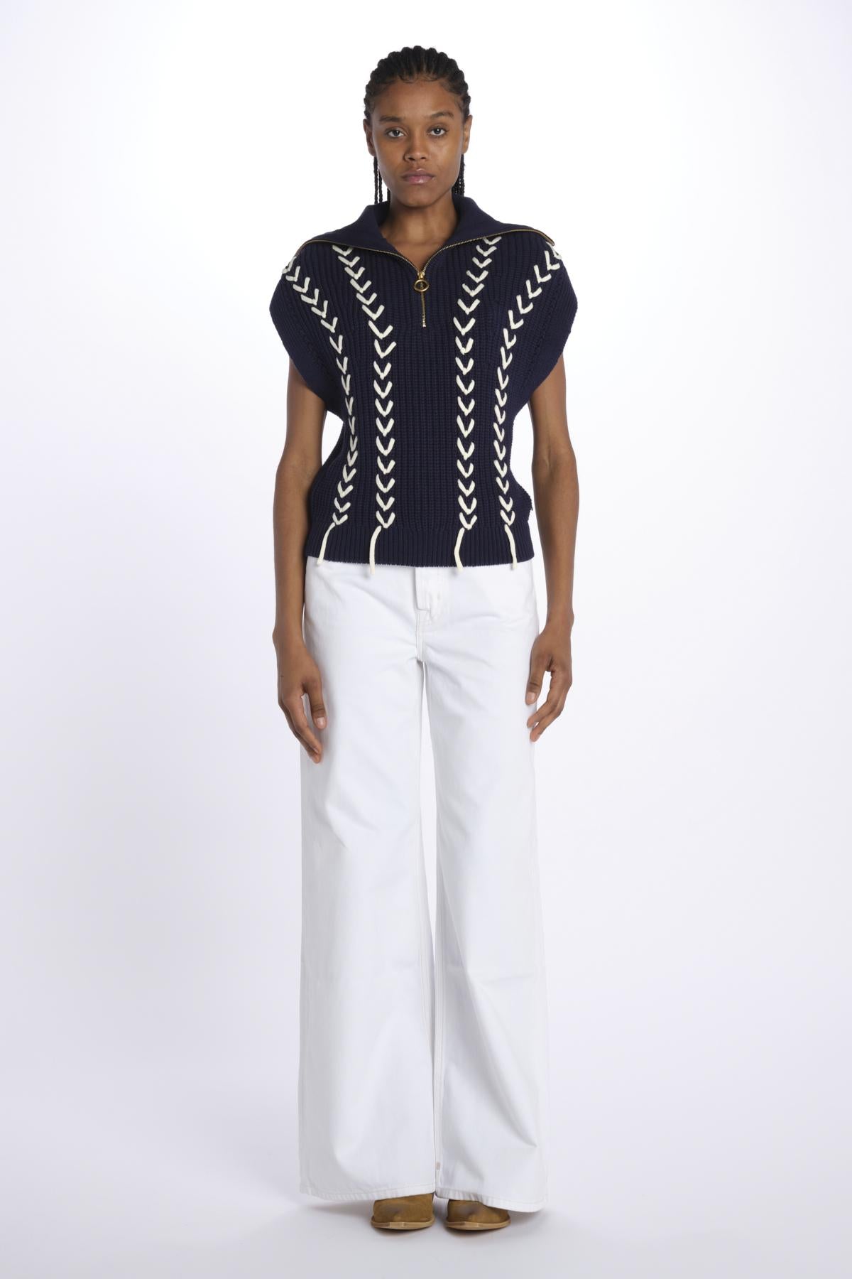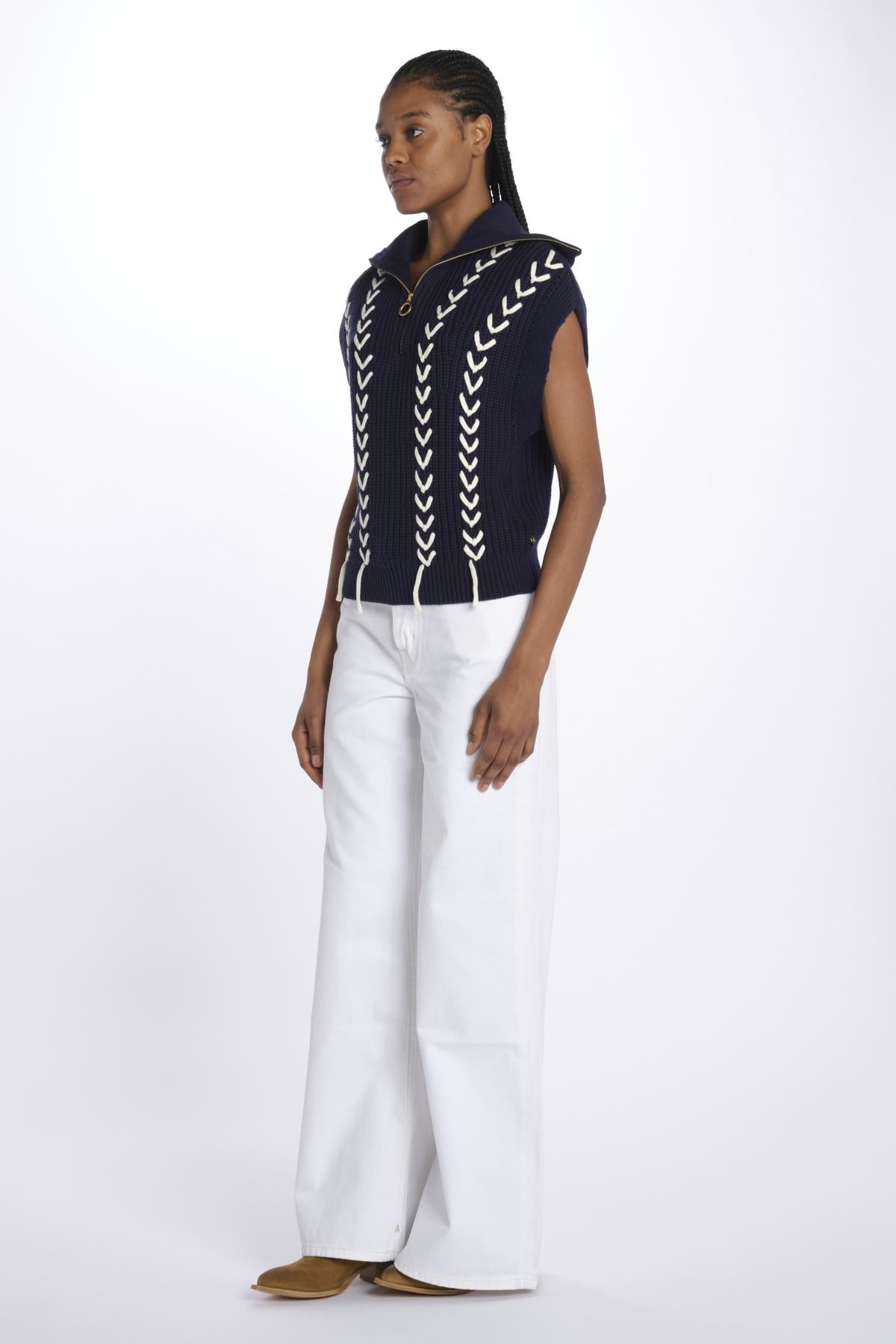 gilet con zip e ricami by sctoch&soda. La modella è alta 174 cm e indossa una XS. Composizione: 60% cotone, 40% acrilica.