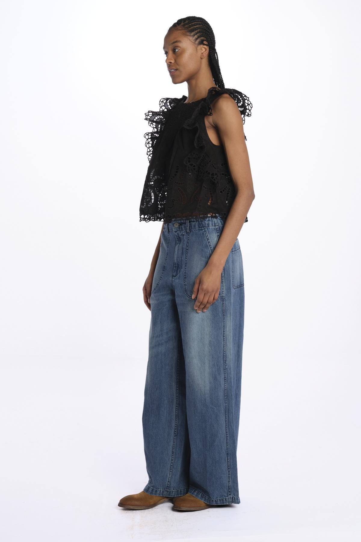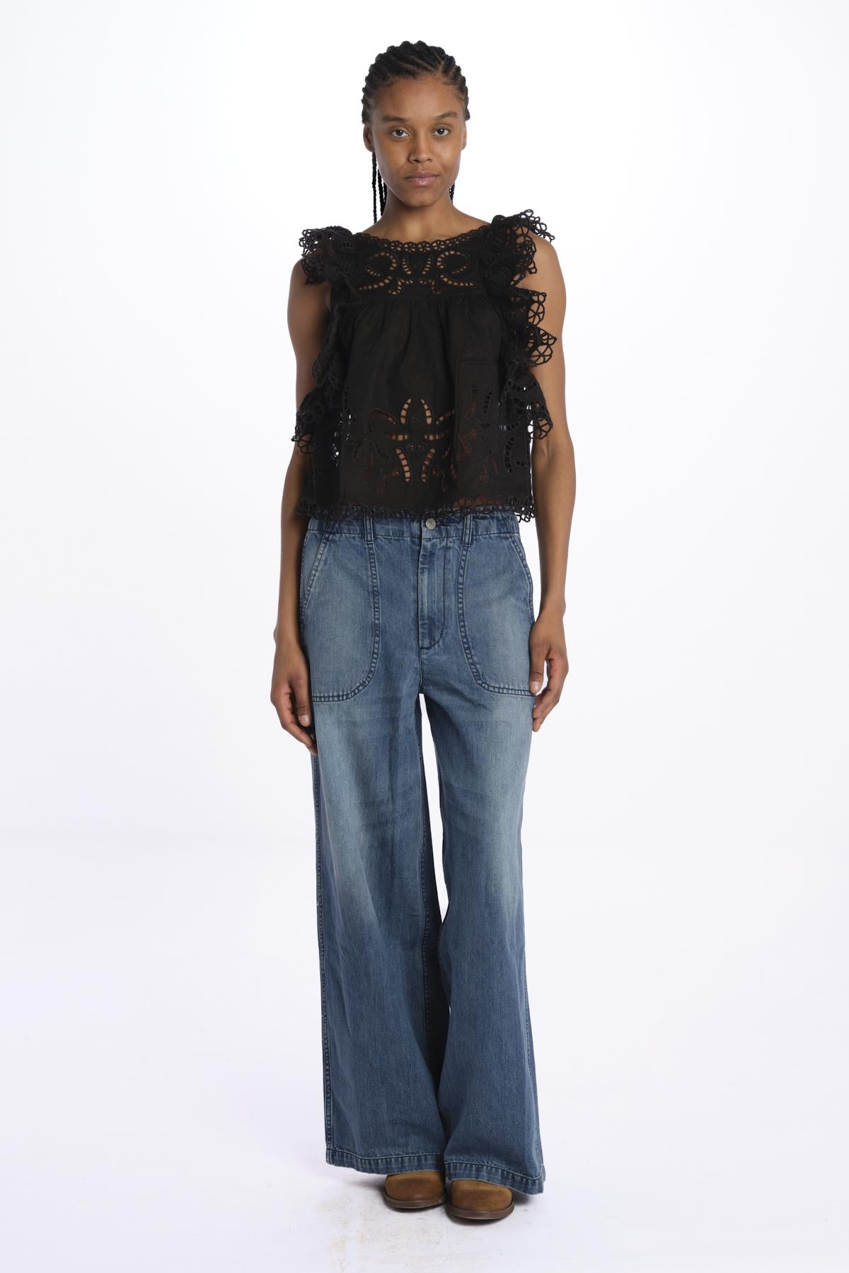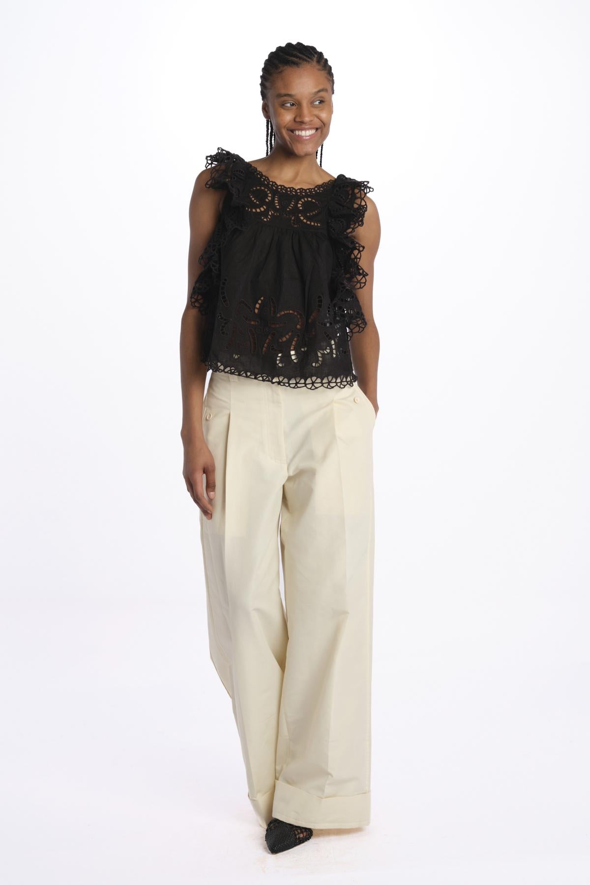 MARJA embroidert flutter tank by sea ny. La modella è alta 174 cm e indossa una S. Composizione: 30% lino, 70% viscosa.
