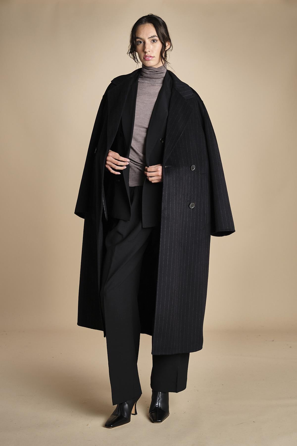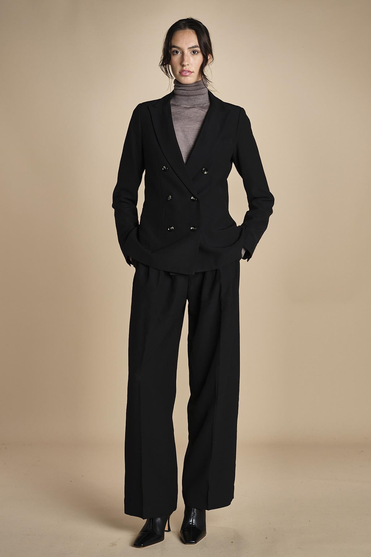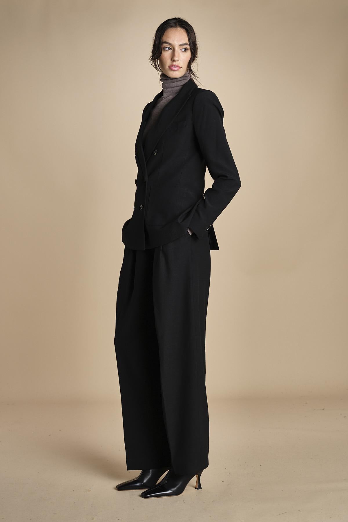 doppiopetto in tela lana. La modella è alta 180 cm e indossa una taglia 38. 58% LANA 42% VISCOSA