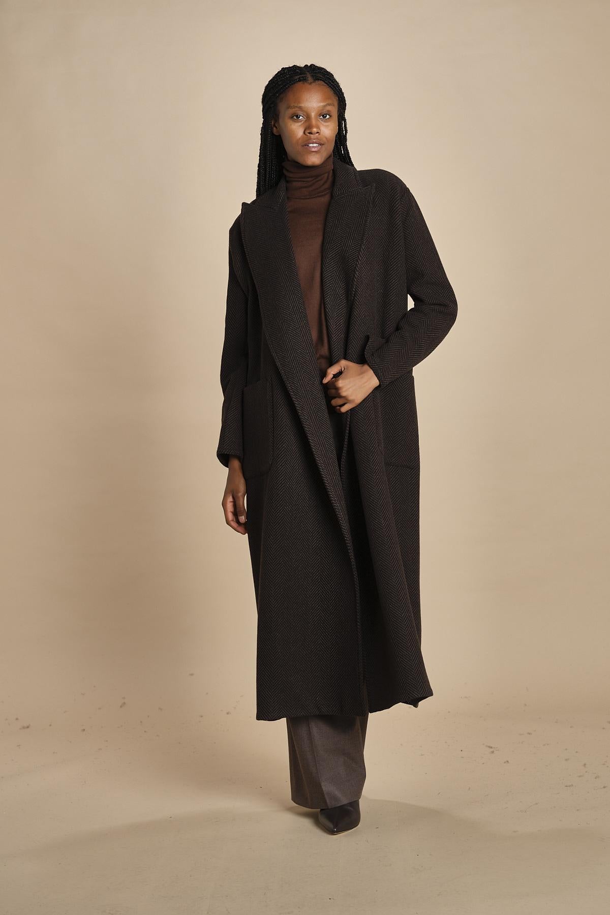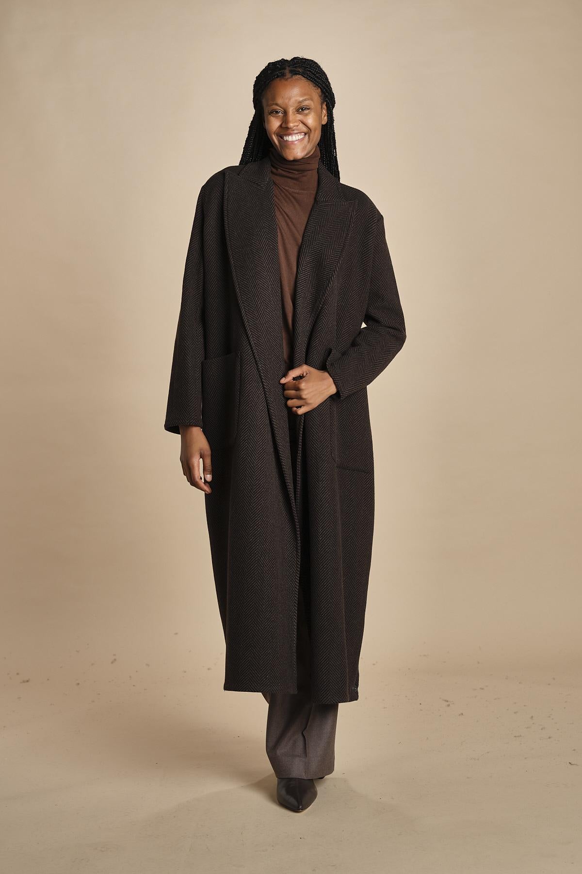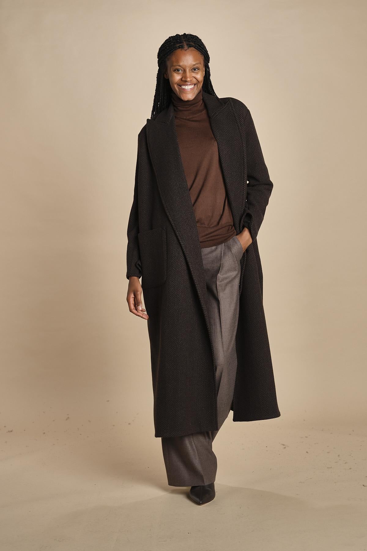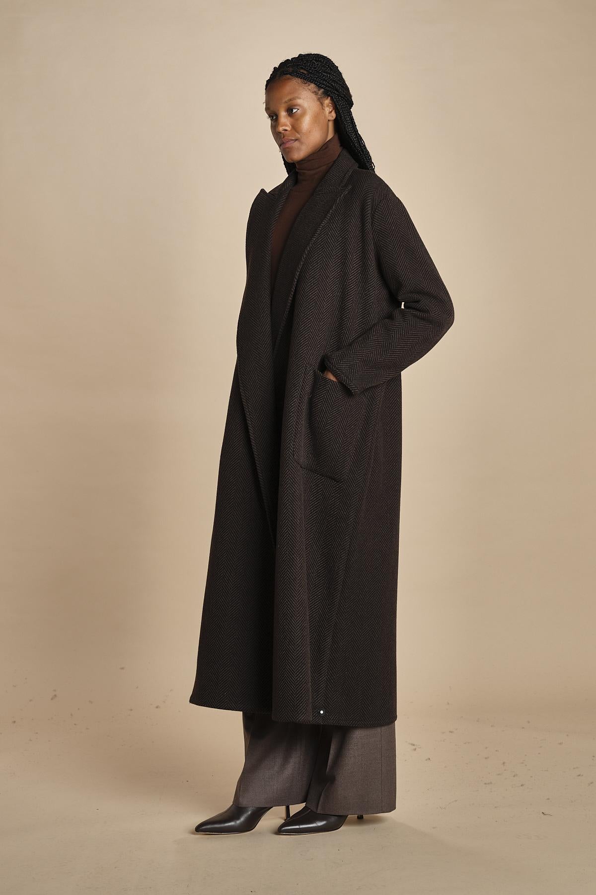 cappotto lungo in cachemire spinato by dusan. La modella è alta 174 cm e indossa una taglia S. Composizione: 100% cashmere.