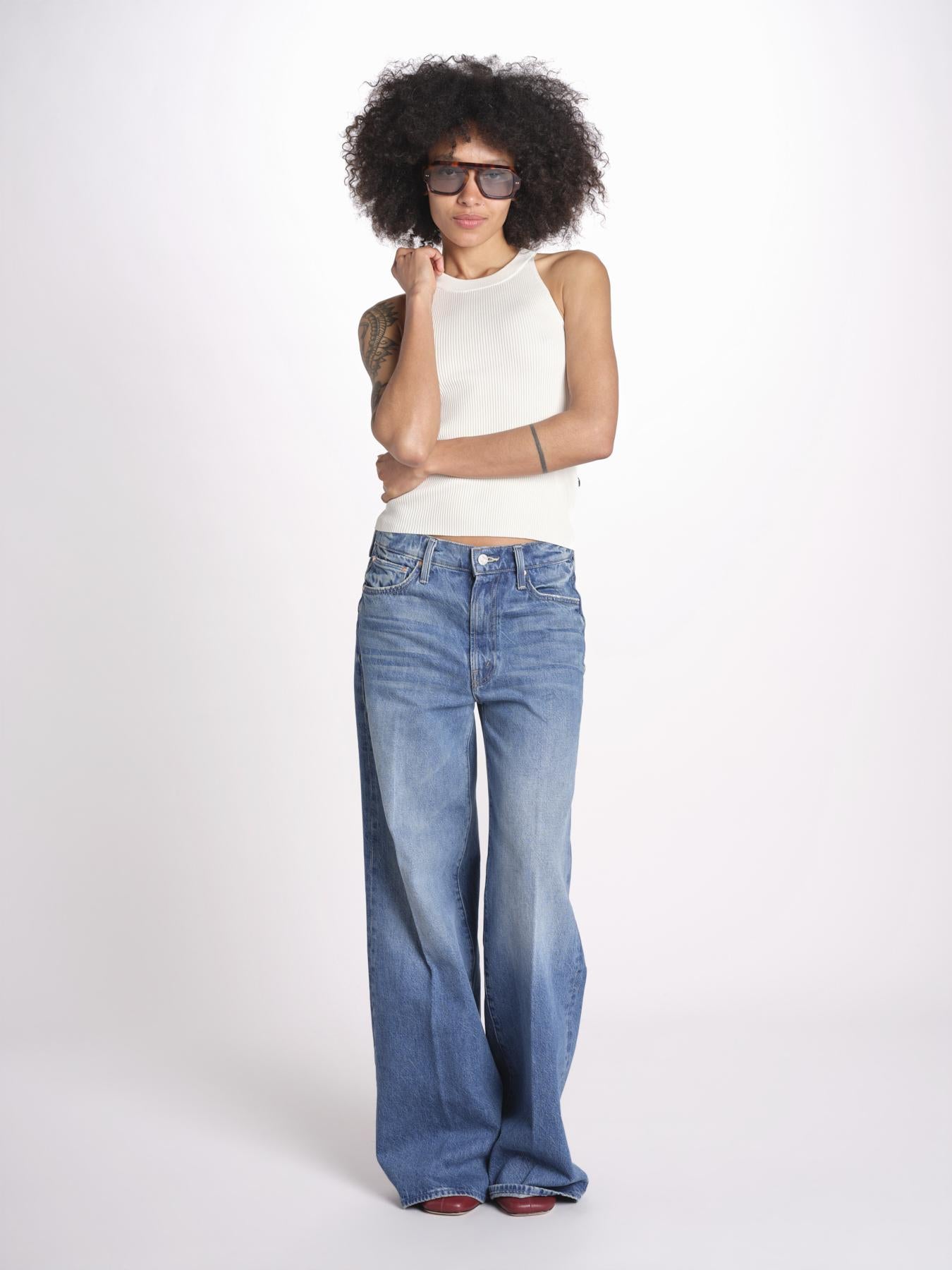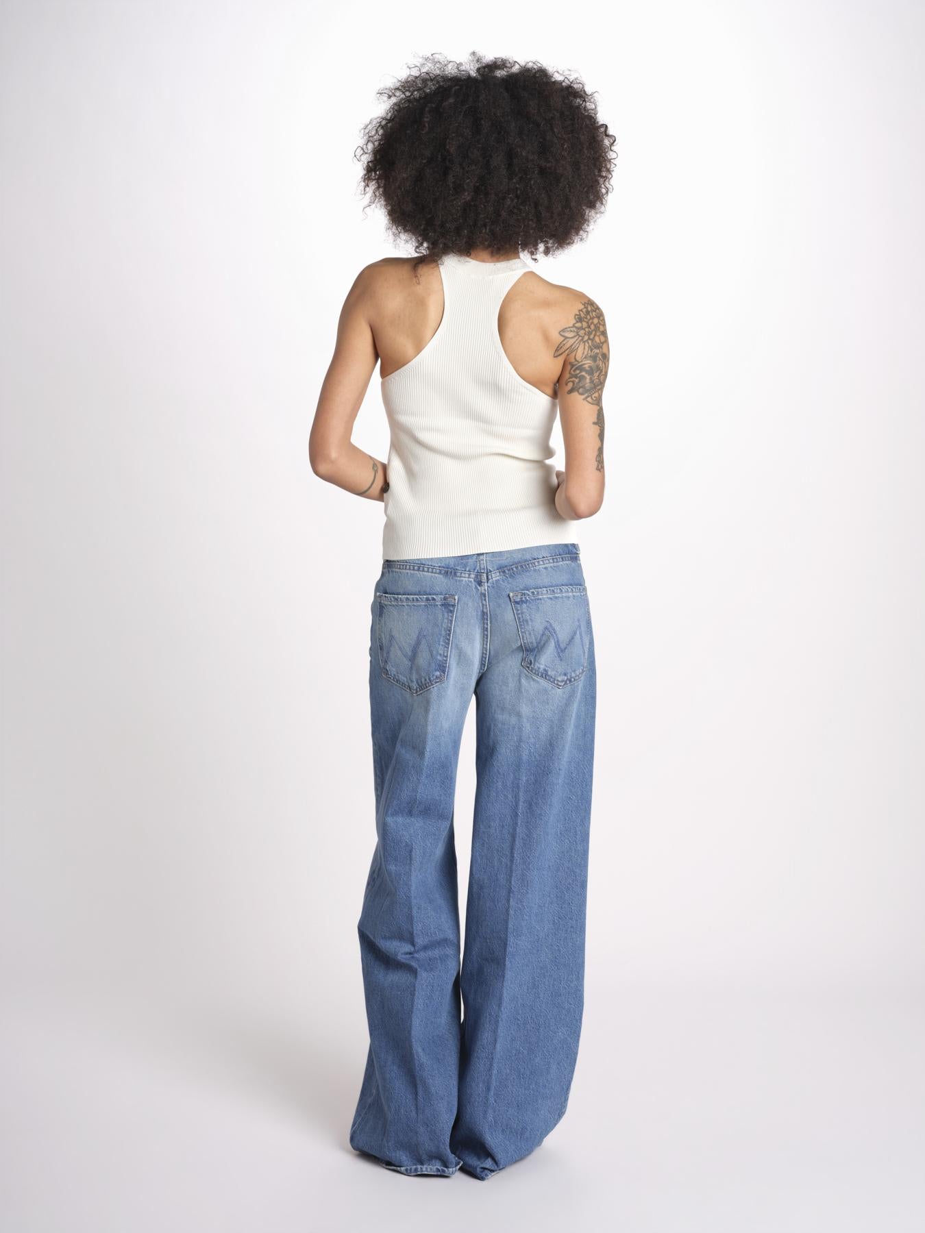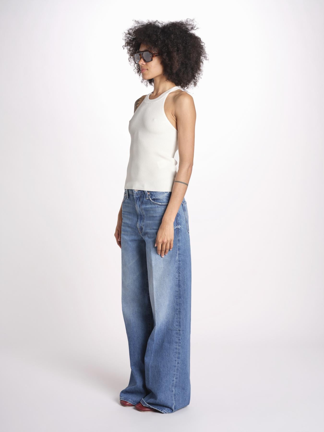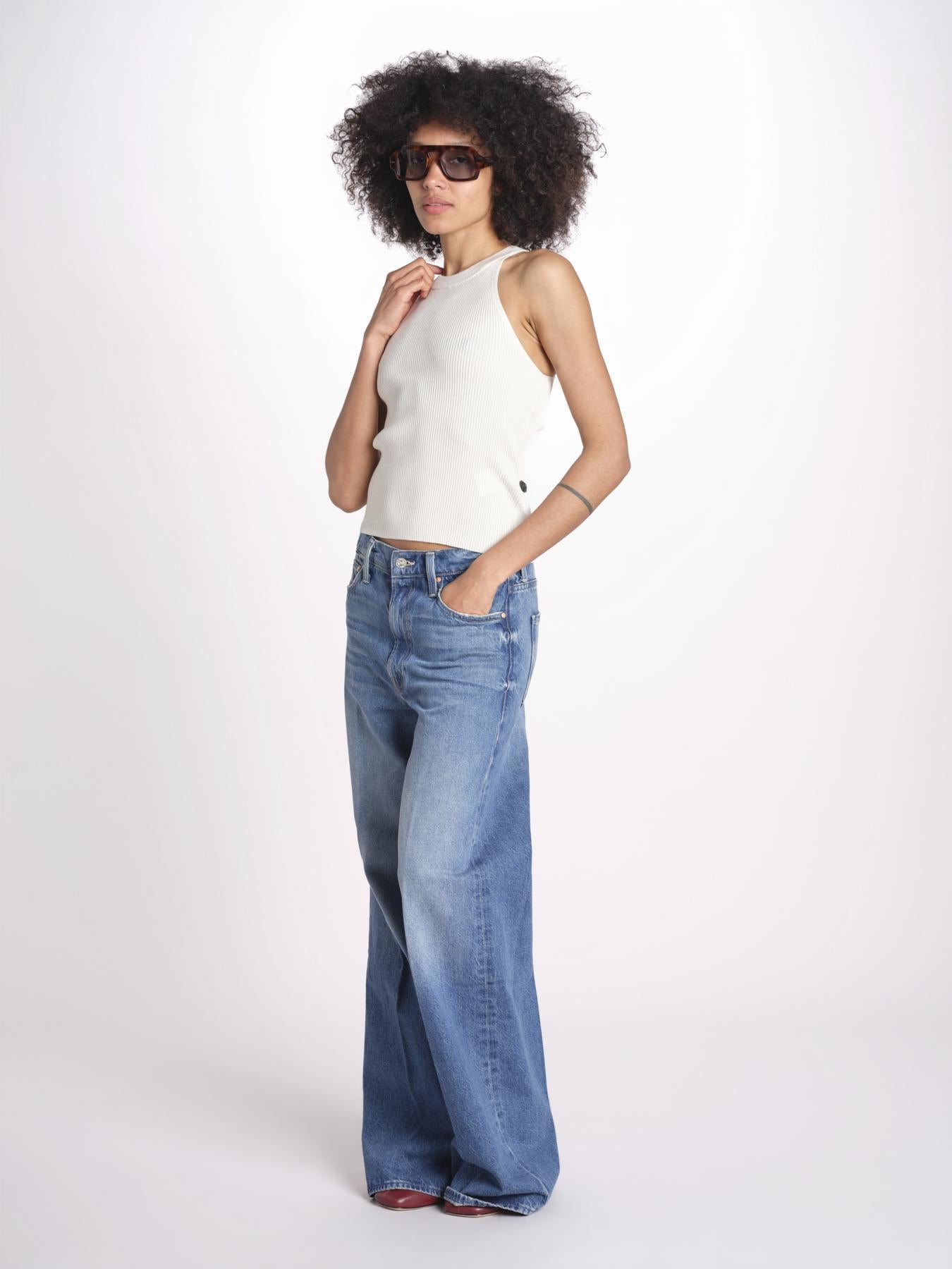 Top a costine. La modella è alta 1.70 e indossa una taglia 0. Composizione 70% viscosa, 16% poliammide, 12% poliestere, 2% elastan.