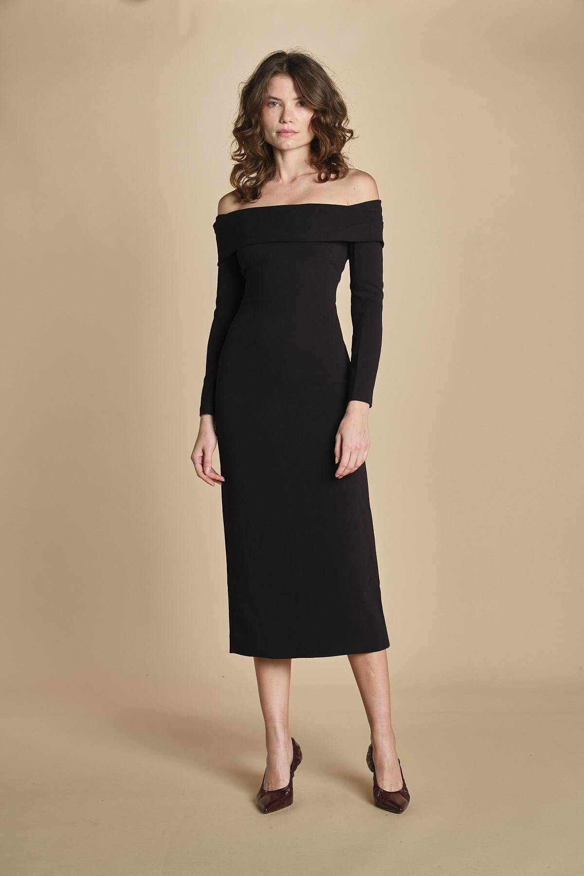 tubino manica lunga con spalle scoperteLa modella è alta 176 cm e indossa una taglia 34. 100% POLIESTERE