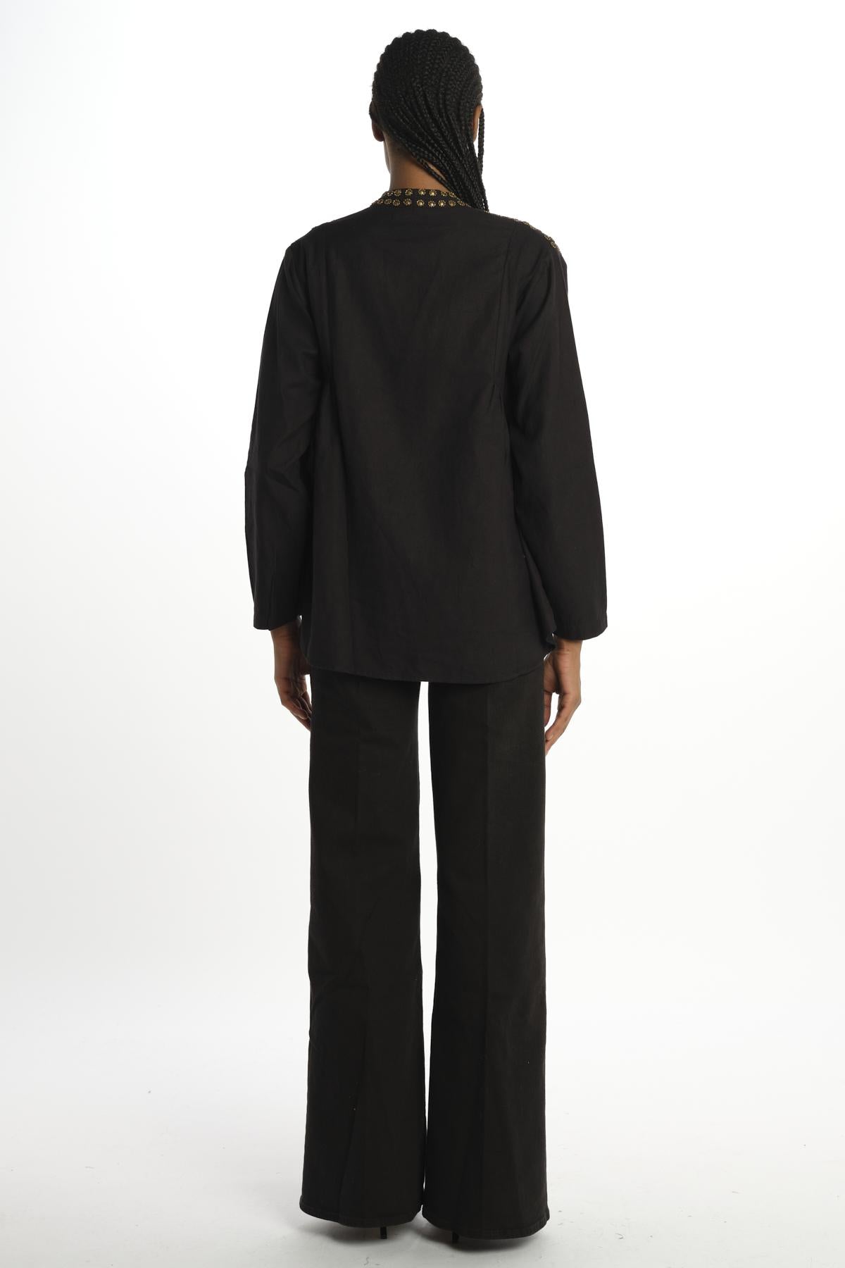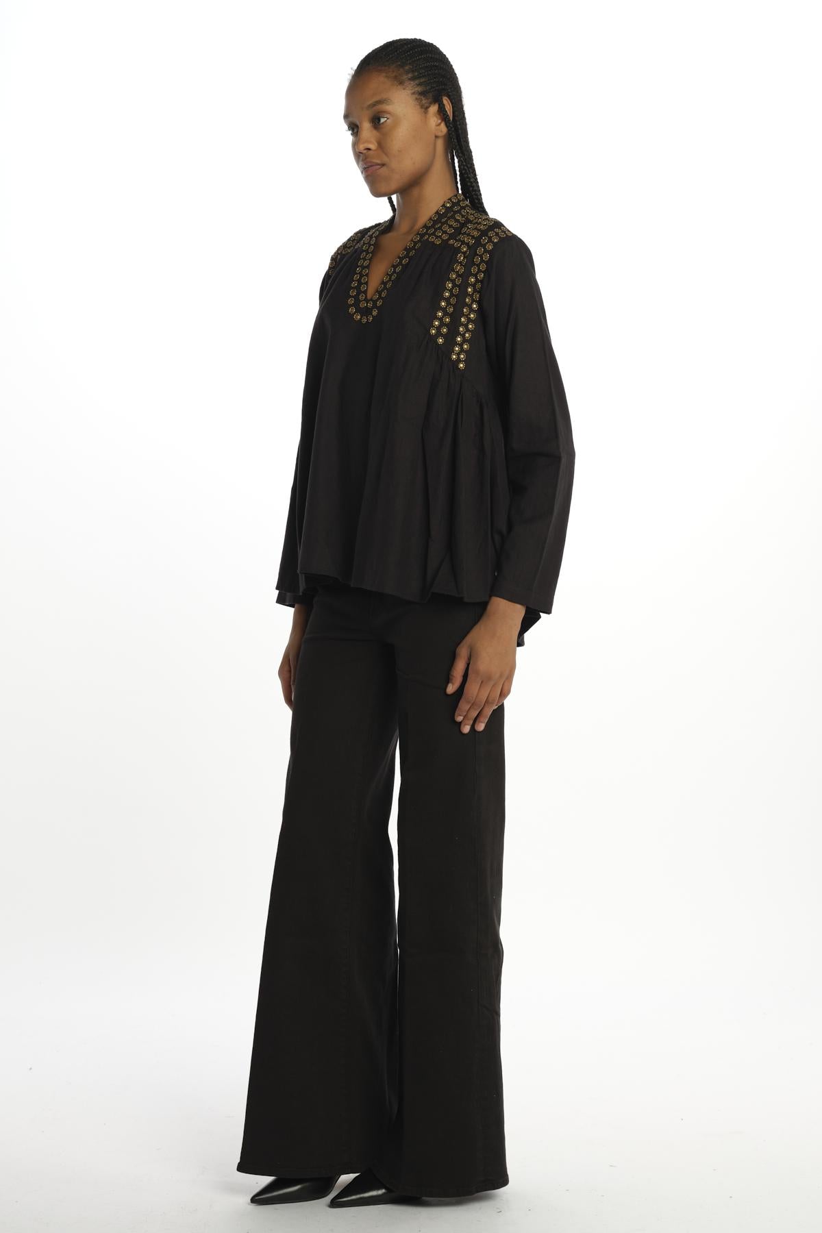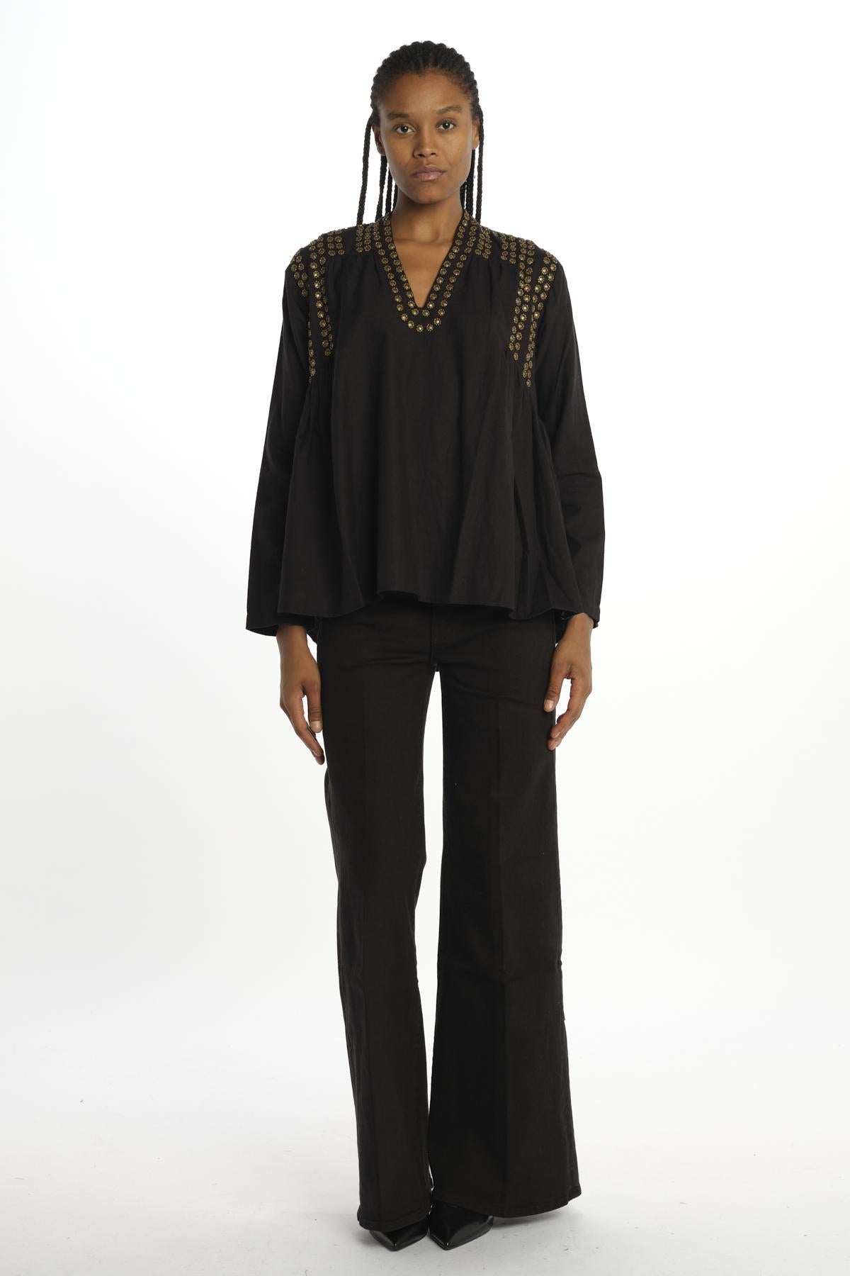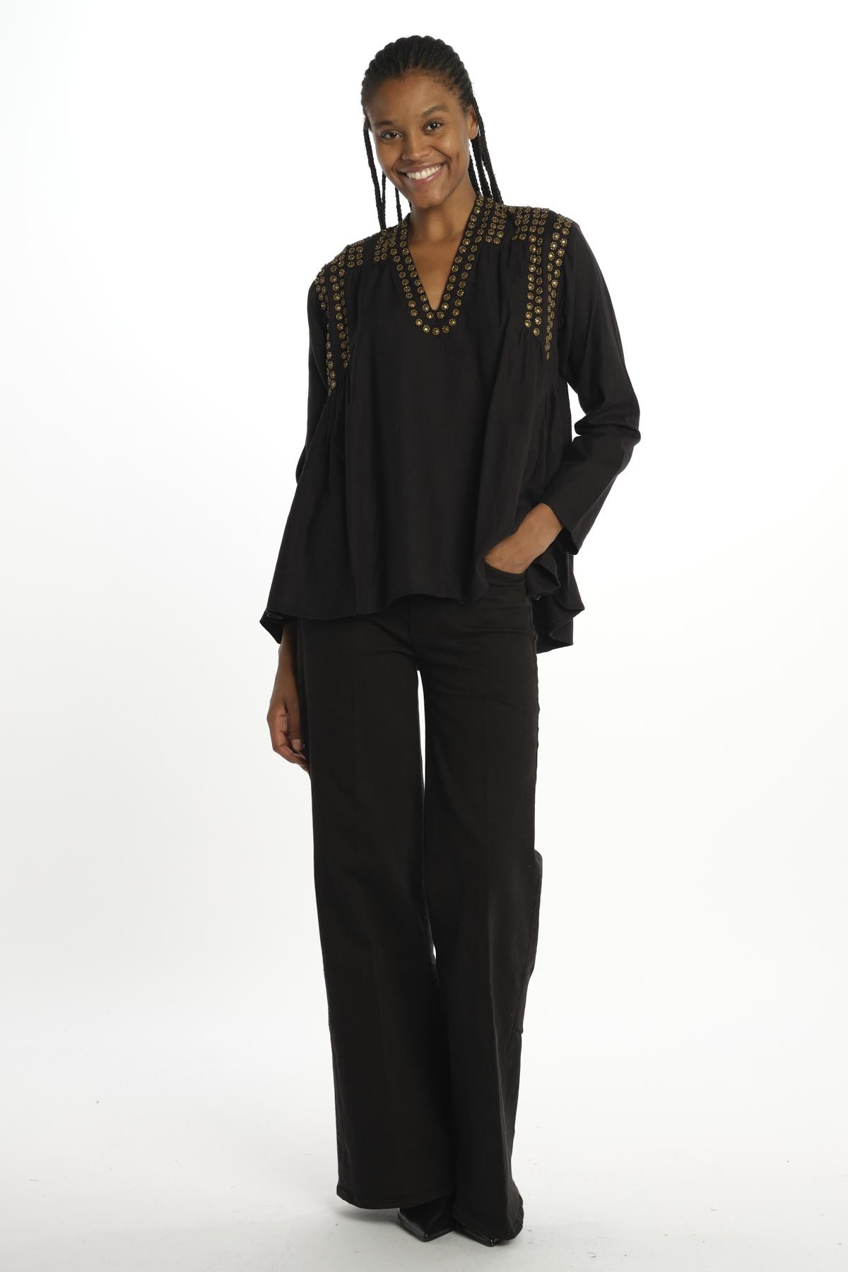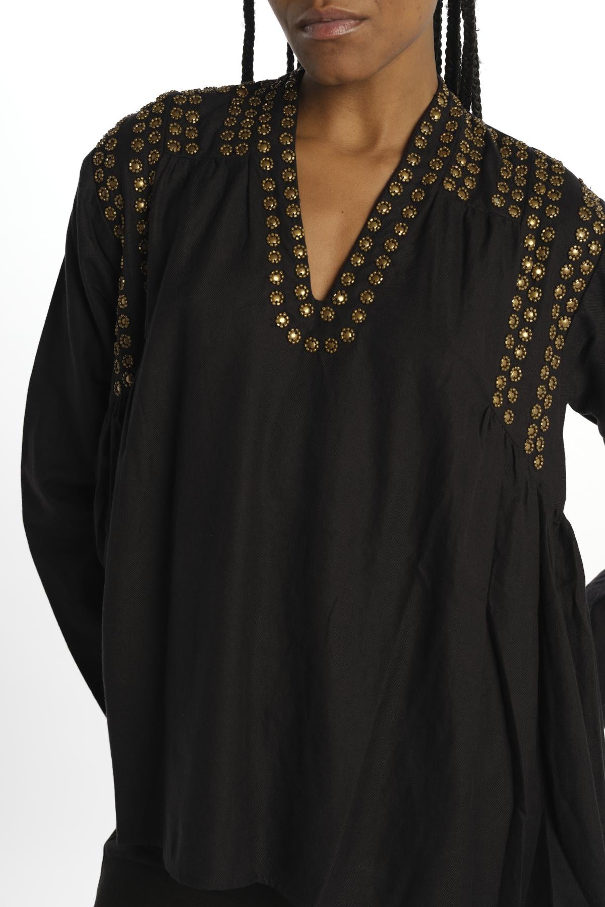 Camicia BLING con borchie by v de vinster. La modella è alta 174 cm e indossa una taglia XS. Composizione: 90% cotone, 10% lana.