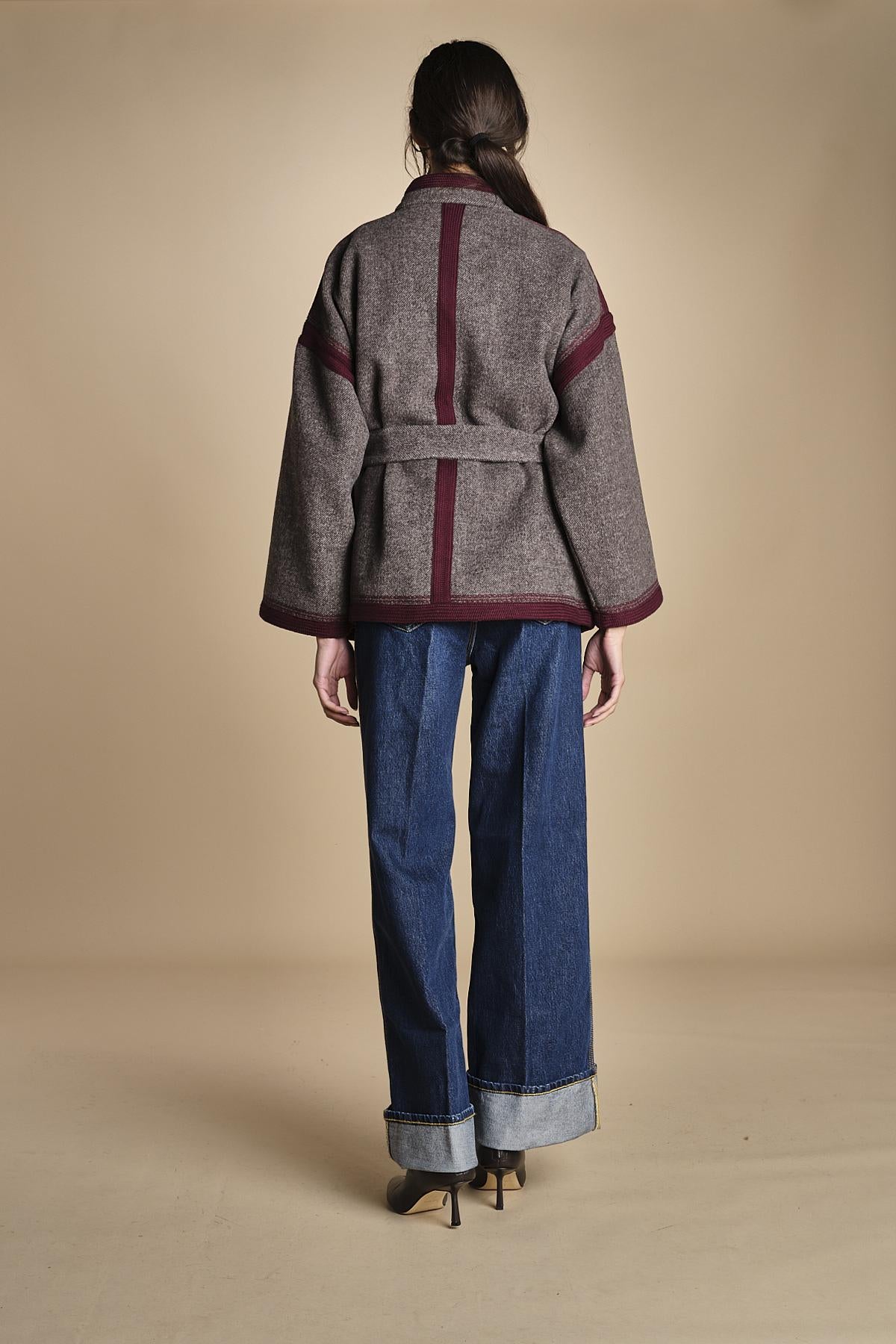 giacca in tessuto diagonale ricamato. La modella è alta 180 cm e indossa una taglia S. 50% POLIESTTERE 50% LANA